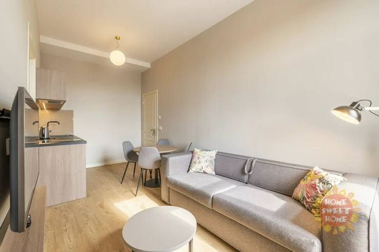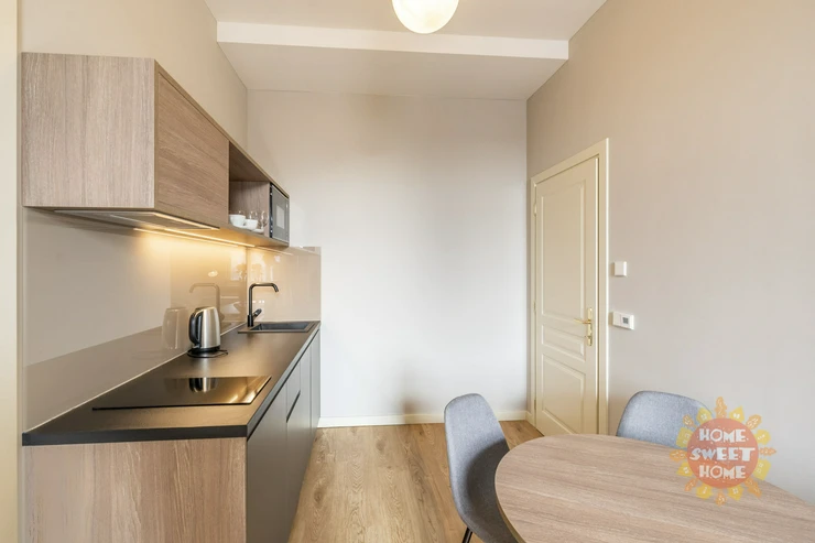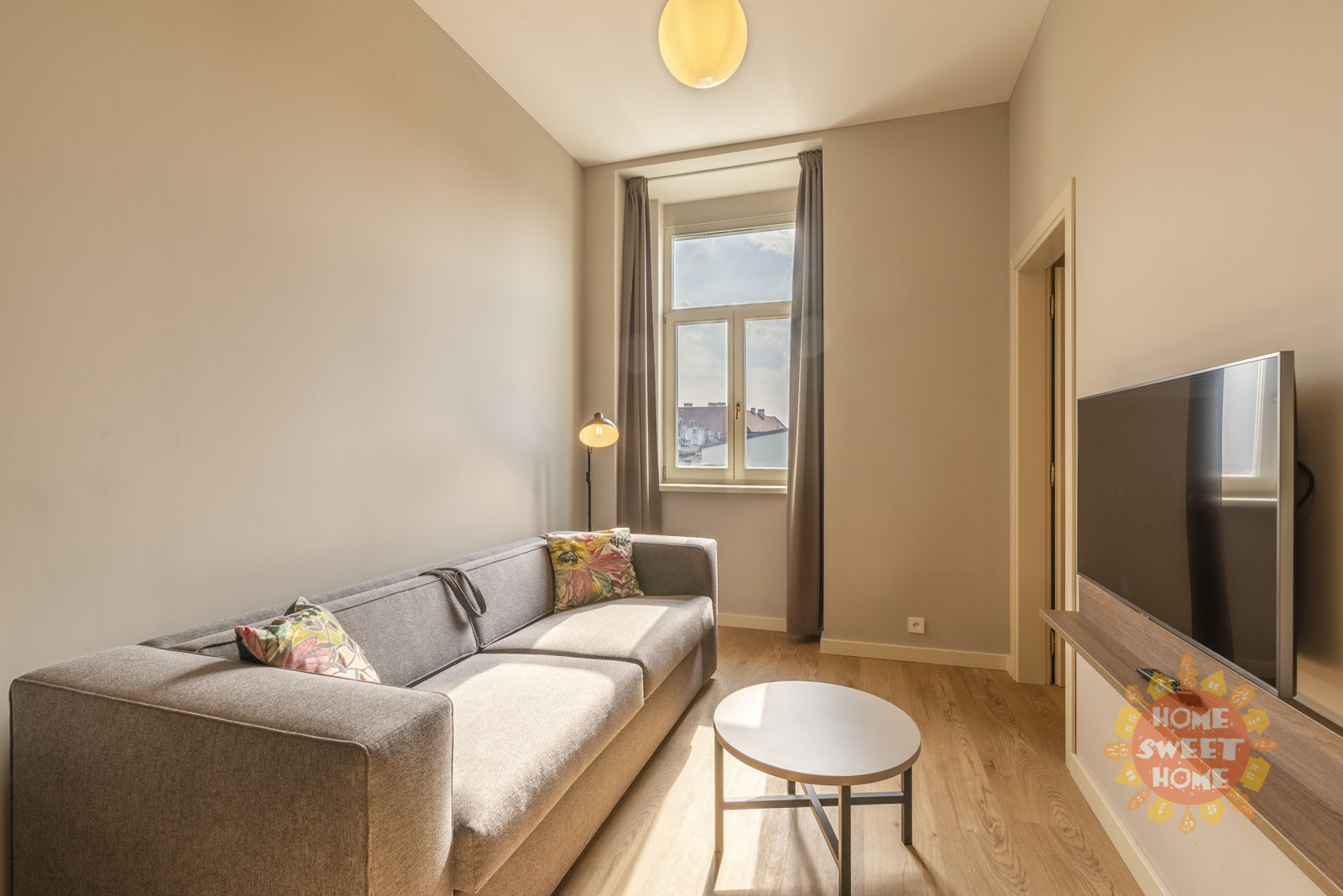 The apartment consists of a living room with a fully equipped kitchen, a bedroom and a bathroom with a shower and a toilet. The house has a 24/7 reception and a laundry room. The price of charges includes energy, high-speed Wi-Fi, 68 TV channels, garbage collection, cleaning of common areas, reception. Possibility to rent an apartment with services for an additional fee (regular cleaning, change of bed linen, bathroom cosmetics in BIO quality).