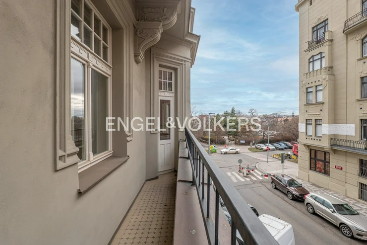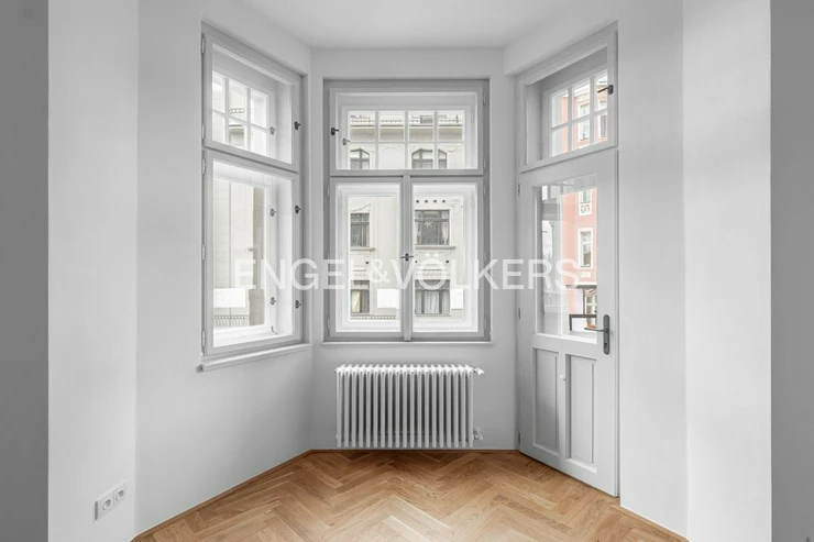 We offer for long-term rent a new 3+kt apartment in the Norská residence in the quiet residential area of Vršovice. The apartment is located in an elegant Art Nouveau building with attractive architecture in the wider centre of Prague. The building underwent a complete renovation in 2024. The windows offer views of the southern Prague skyline and Heroldovy Sady Park, which is right next to the residence.