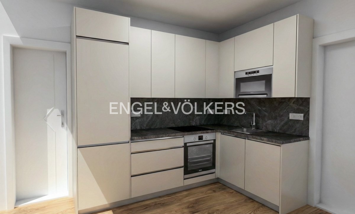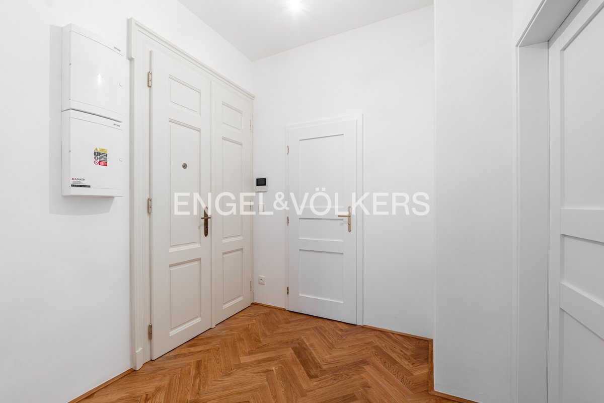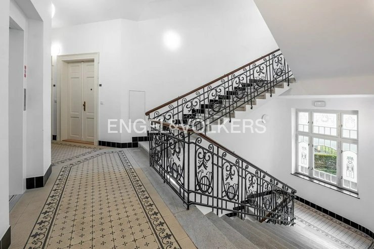 The historic character of the interiors has been preserved in the form of high ceilings and bright rooms with casement windows, while also offering a modern layout, a new elevator, and other technologies. The floors are solid oak parquet, and the radiators are Zehnder Charleston retrofit. The apartment has a brand new kitchen with built-in appliances (refrigerator, dishwasher, induction hob, oven, extractor hood). The apartment also has a balcony and a cellar unit.