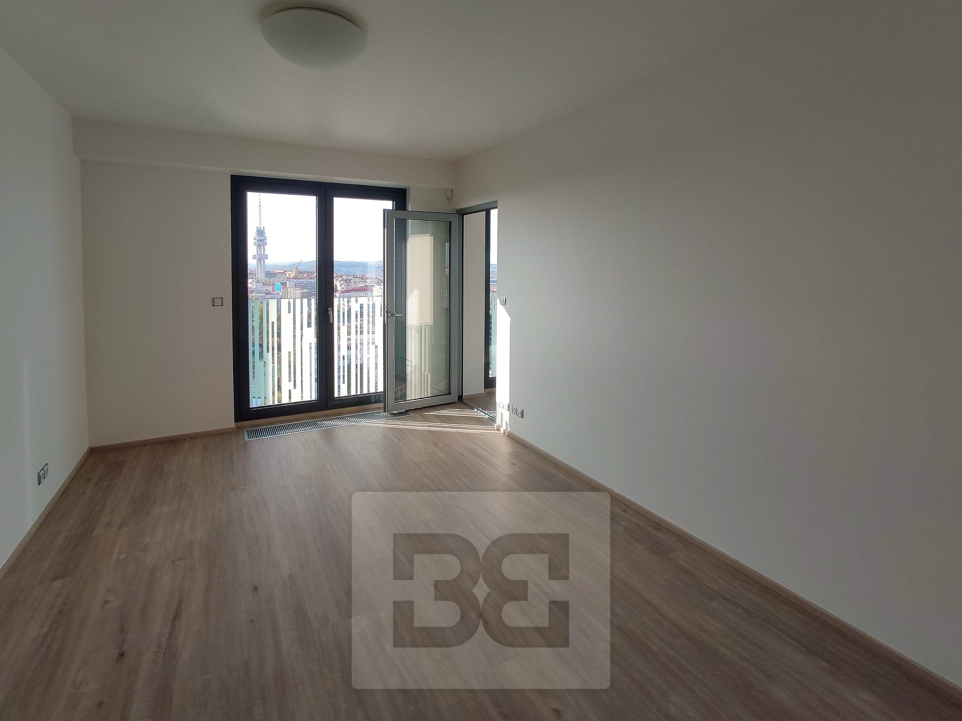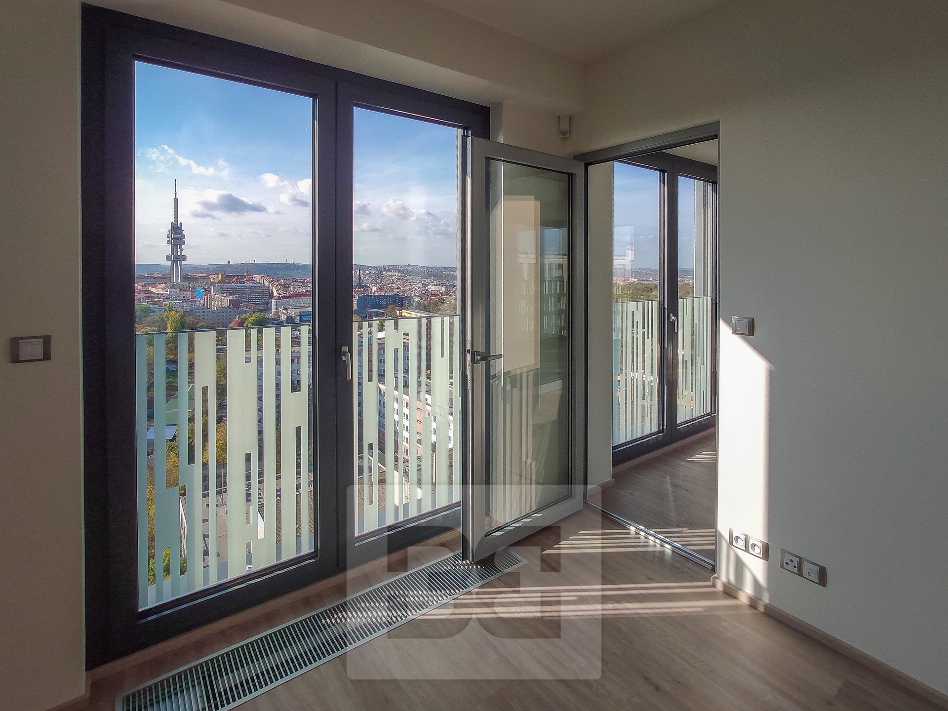 The apartment is located on the top (17th) floor of the new building Residence Garden Towers in Prague 3, Olšanská Street.