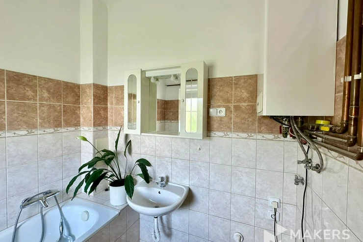 The apartment includes a separate fully equipped kitchen (fridge, microwave, gas stove and electric oven). The bathroom is fitted with a bathtub, heated towel rail and washing machine; the toilet is separate. There is also a storage room and pantry on the corridor, two basement units (2 m² and 4 m²), a balcony (3 m²), and the option to use a front garden of approximately 100 m². The apartment is rented partially furnished (with the possibility to keep two beds and a sofa) and high-speed internet is installed.