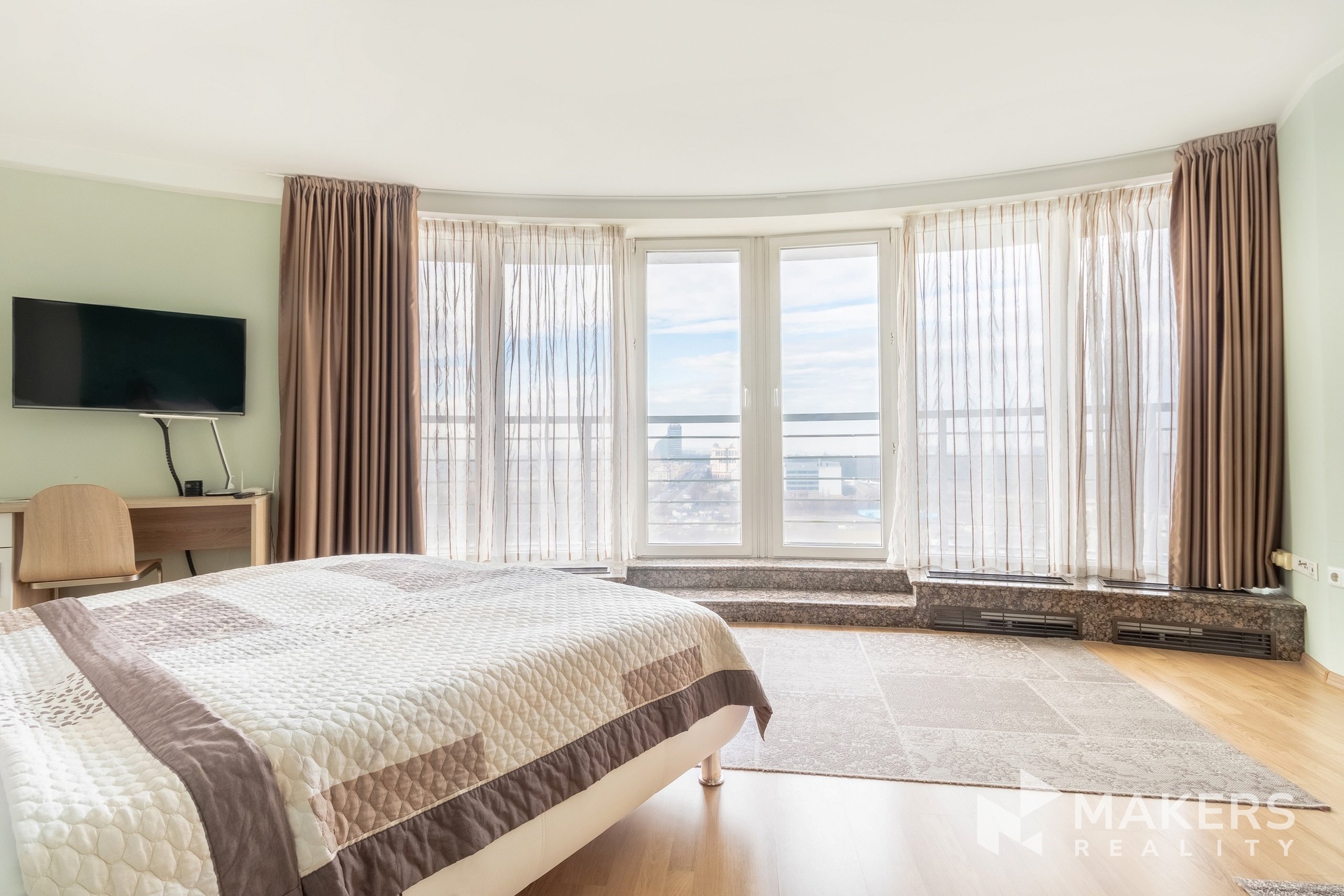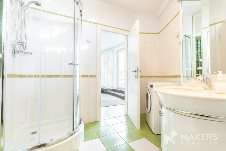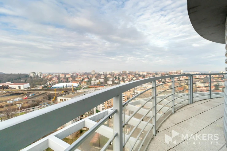 We offer for rent a studio apartment of 30 sq m with a private sauna and a terrace, located on the 18th floor of a modern residential building on Vinohradská Street, at the intersection of the Vinohrady, Strašnice and Žižkov districts. The apartment is available for immediate move-in.