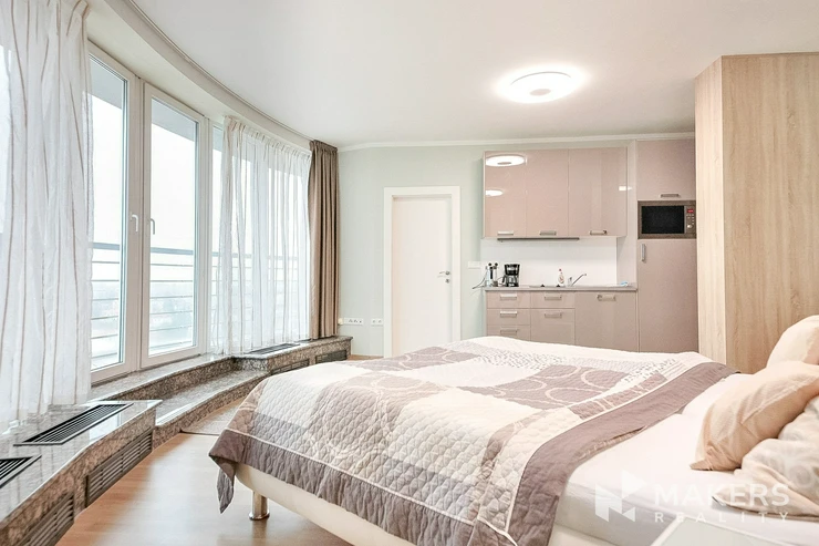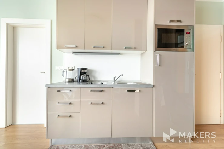 The main living area features a double bed, a workstation, and a kitchenette fully equipped with appliances. Large floor-to-ceiling French windows provide plenty of natural light and offer direct access to a spacious terrace of approximately 18 sq m with an open panoramic view of Prague. The sleeping area is seamlessly integrated into the living space. The bathroom includes a walk-in shower and provides access to a private sauna. The toilet is separate. The apartment also includes a walk-in wardrobe with built-in storage.