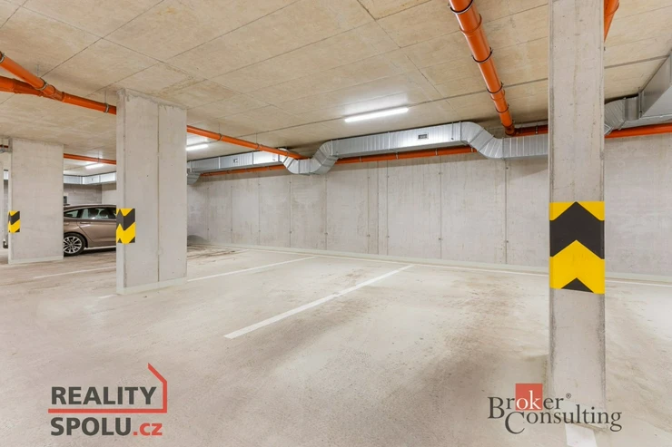 Další výhodou je vyhrazené garážové parkovací stání (v ceně podnájmu), umístěné v blízkosti výtahu – pohodlný a suchý přístup přímo k bytu.