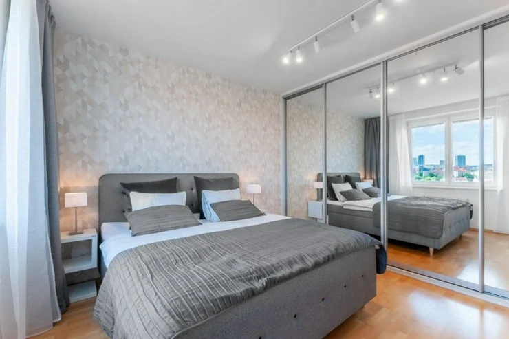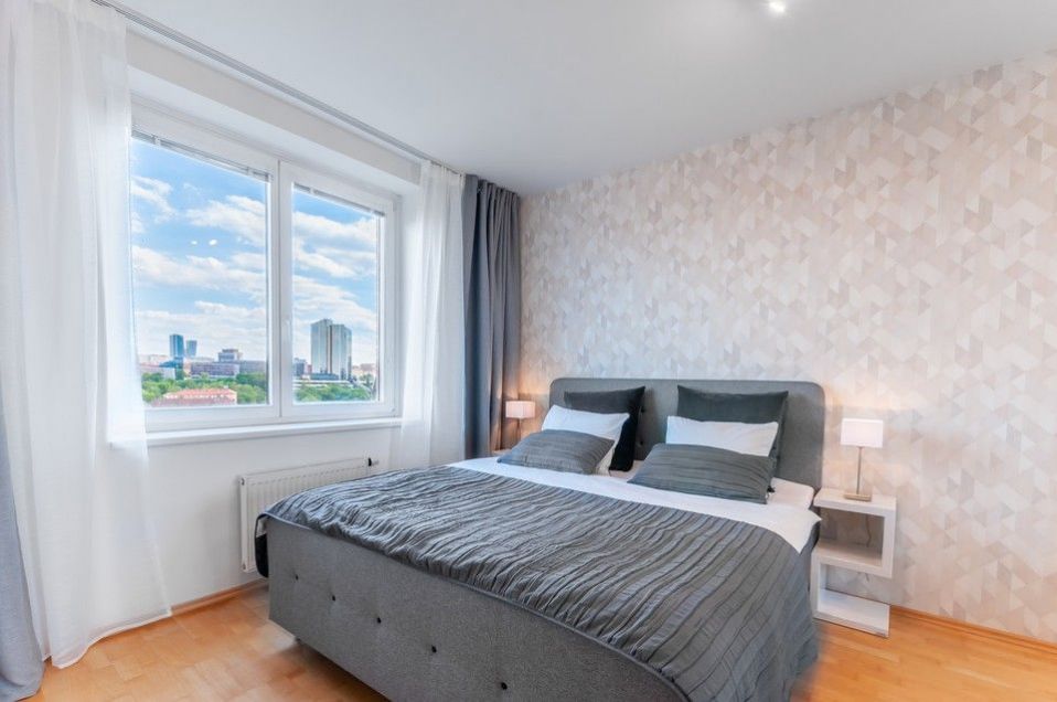 Rent of a fully equipped sunny apartment 2+kk after renovation with parking space and cellar, terrace with summer seating, with unique views of the Prague panorama on the 3rd floor in the quiet and prestigious Zvonařka Residence in Prague 2 in Královské Vinohrady with reception, 24-hour security, indoor pool, terrace and private landscaped park in the courtyard.