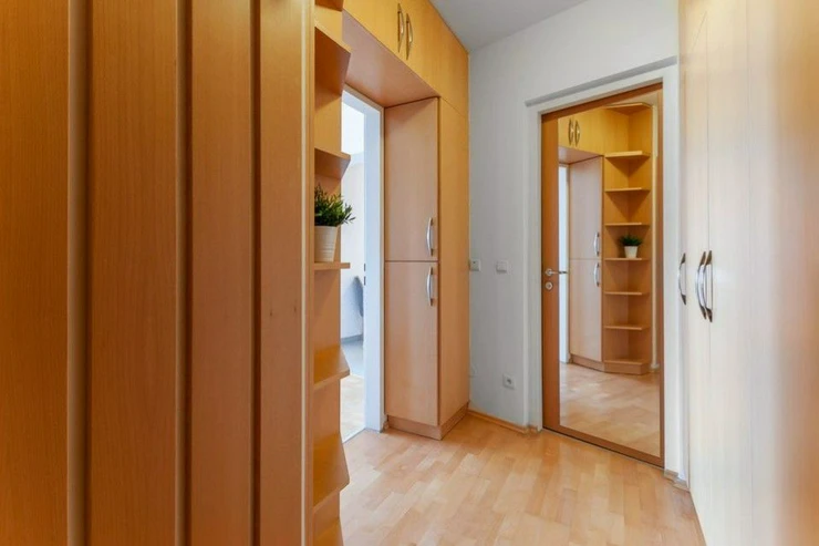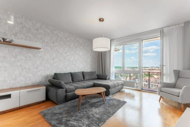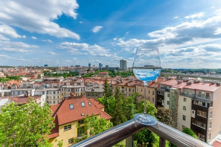 The layout of the modern apartment offers a bright living room with direct access to the southeast-facing terrace with views of the Prague panorama with seating, a separate kitchen, bedroom, spacious bathroom with bathtub, washing machine, toilet, entrance hall with plenty of storage space - wardrobes.