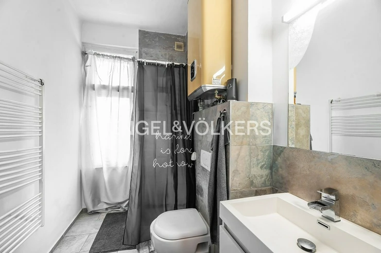 Available for rent from April 1, 2026, is a partially furnished 1+kt apartment on the 5th floor of a residential building in Na Žertvách Street near the Palmovka metro station. The apartment features one room with a kitchenette and a bathroom. The kitchen is equipped with a convection oven, microwave, hob, and refrigerator. The apartment includes a small entrance hall and a bathroom with a shower and a shared toilet. The washing machine is located in a shared hallway with the neighboring apartment.