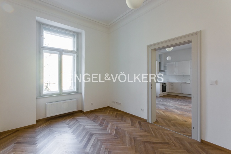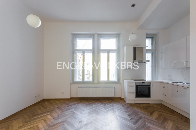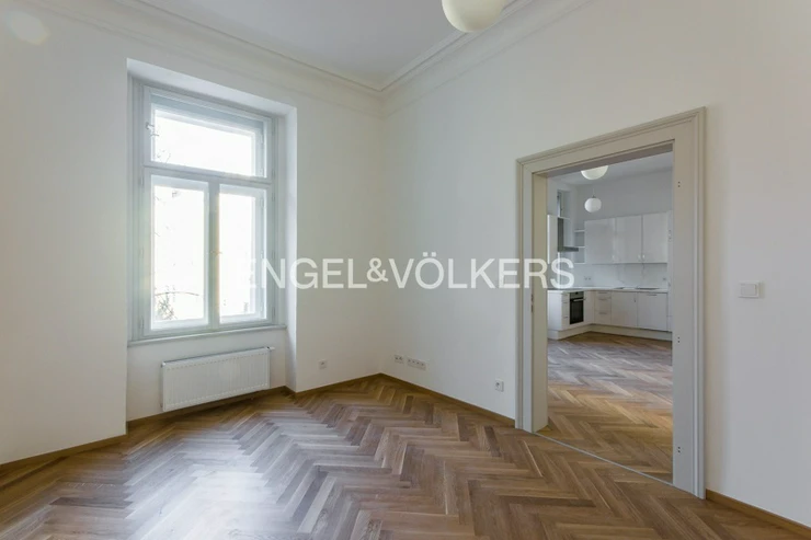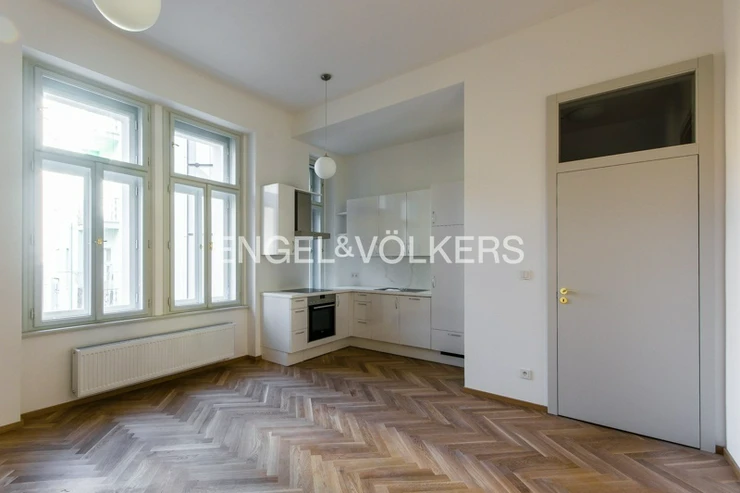 Historic apartment building from the 19th century after a complete renovation, including the roof, elevator, and all wiring. During the renovation, care was taken to preserve all the original Art Nouveau elements of the house, and quality materials such as solid wood floors and wooden windows were used. The main room is the living room connected to the kitchen which is fully equipped, including all SIEMENS appliances. Modern bathroom with shower, toilet, and place for washing machine. The spacious bedroom with a beautiful stucco ceiling is oriented to a quiet courtyard. A cellar belongs to the apartment.
