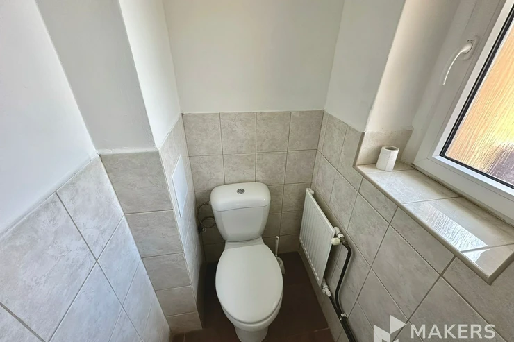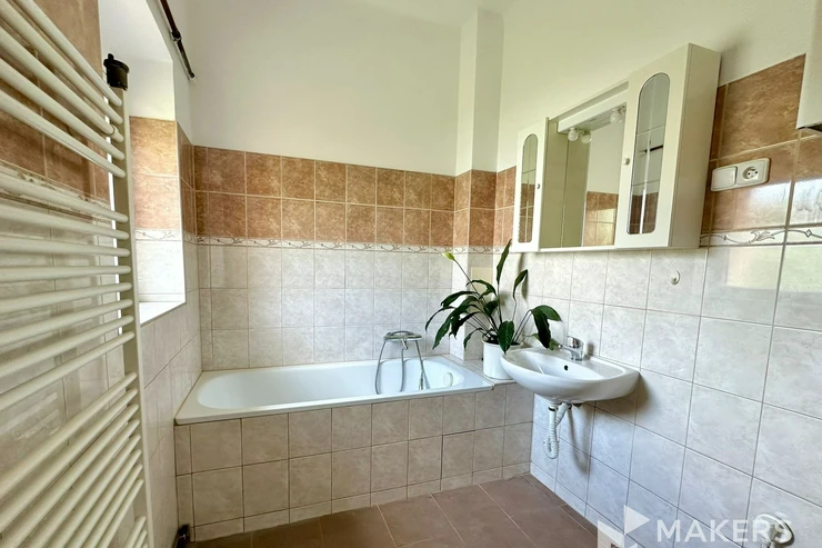 The apartment includes a separate fully equipped kitchen (fridge, microwave, gas stove and electric oven). The bathroom is fitted with a bathtub, heated towel rail and washing machine; the toilet is separate. There is also a storage room and pantry on the corridor, two basement units (2 m² and 4 m²), a balcony (3 m²), and the option to use a front garden of approximately 100 m². The apartment is rented partially furnished (with the possibility to keep two beds and a sofa) and high-speed internet is installed.