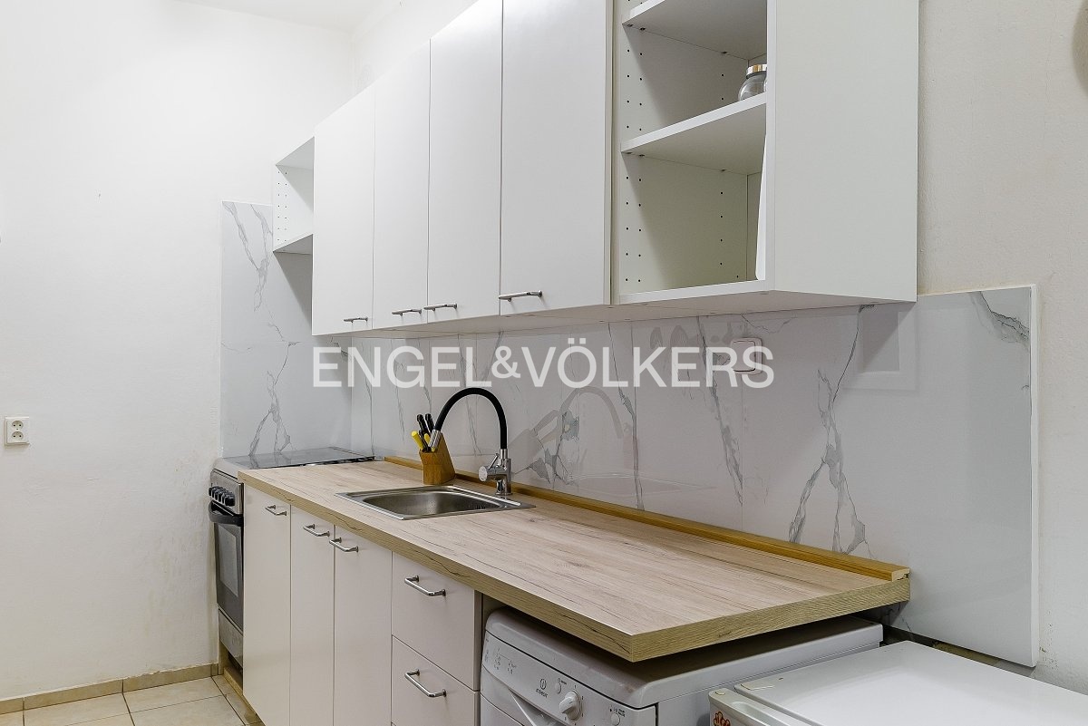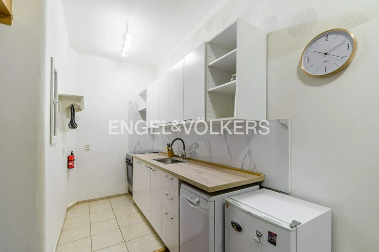 The equipment includes a sofa bed and washing machine in the bathroom. Storage space is extended by a cellar in the basement of the house. The apartment is suitable for a single person, a couple, or a flatshare.