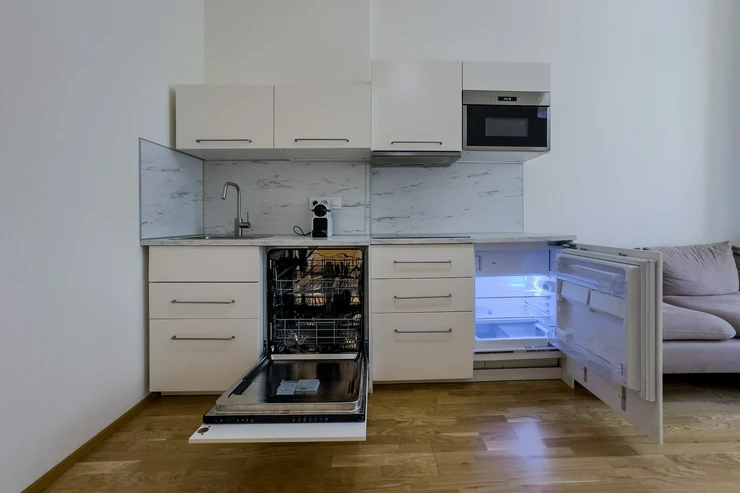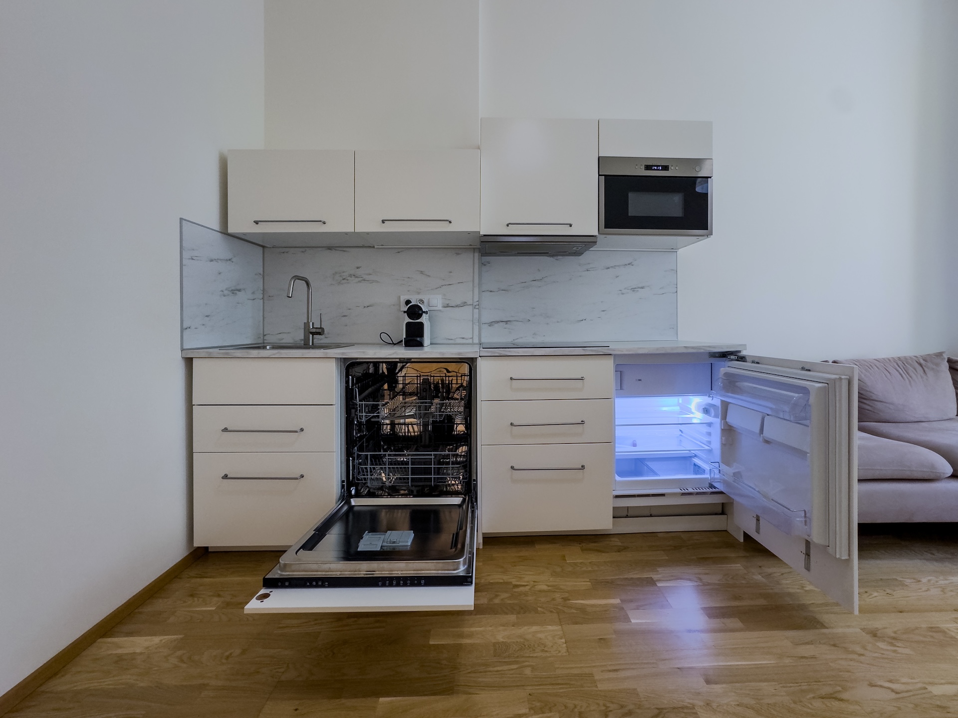 Apartment layout: entrance hall, living room, bedroom, and a bathroom with a washbasin, toilet, shower corner, and washing machine. The main spacious room features a kitchen unit with built-in appliances (refrigerator, microwave oven, ceramic cooktop, dishwasher), a sofa, a dining table with two chairs, and a work desk. The bedroom is equipped with a practical wardrobe and a large bed including a mattress.