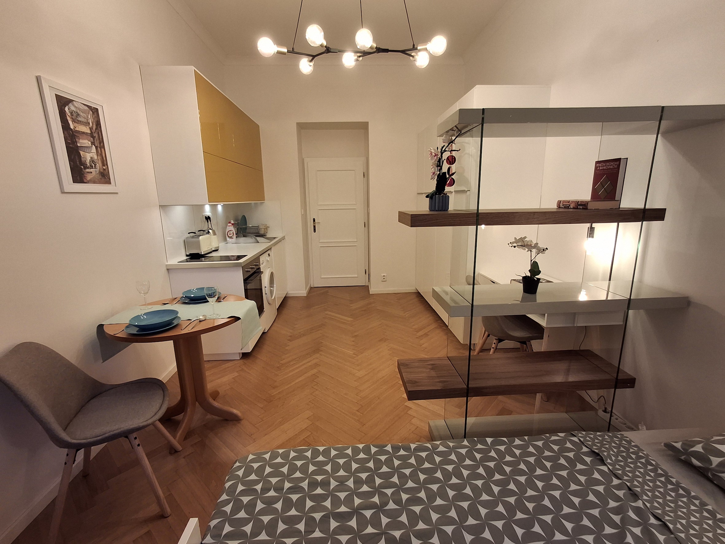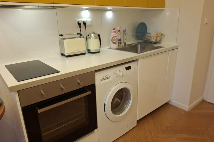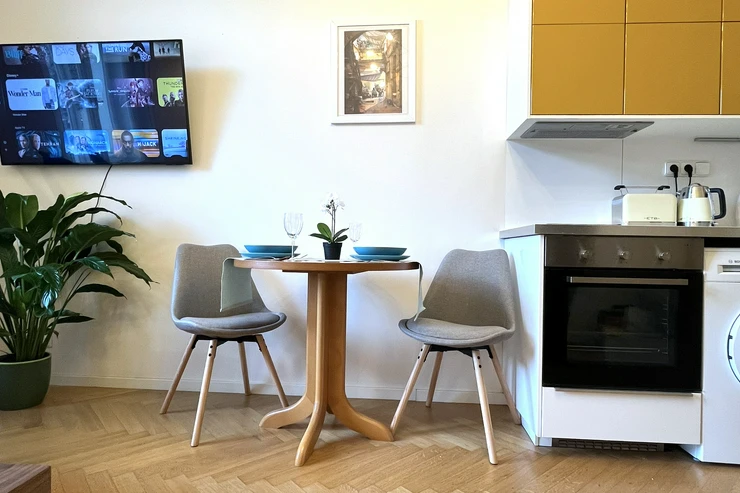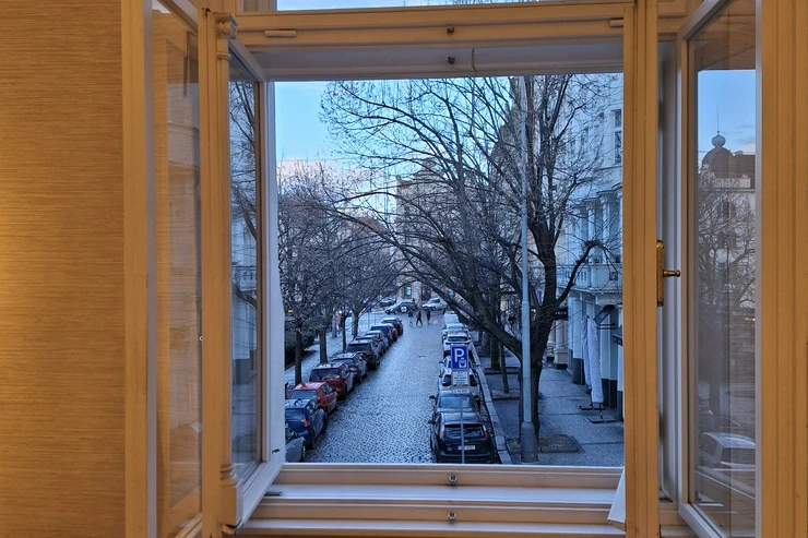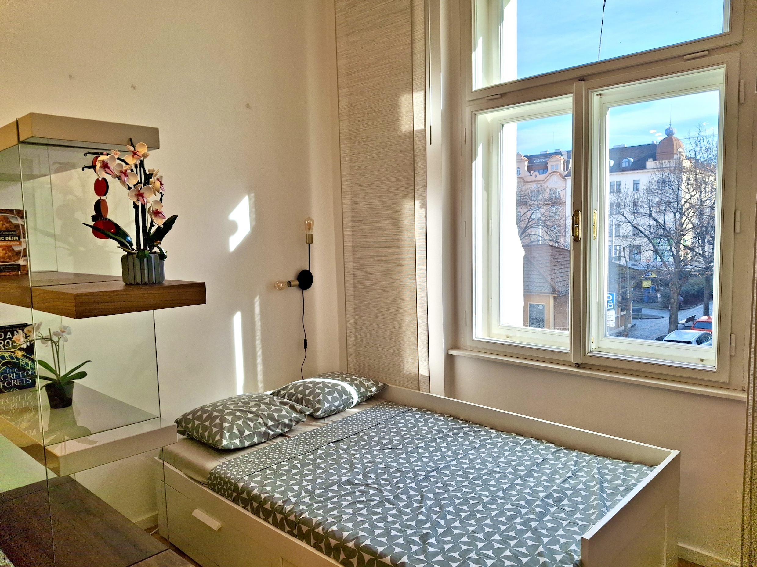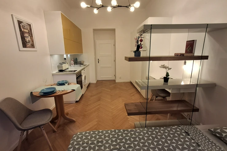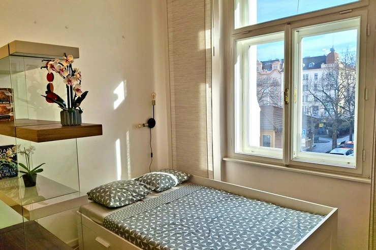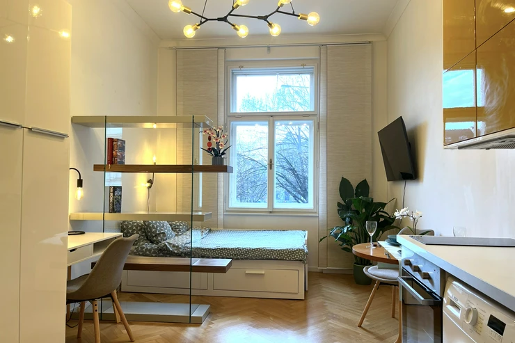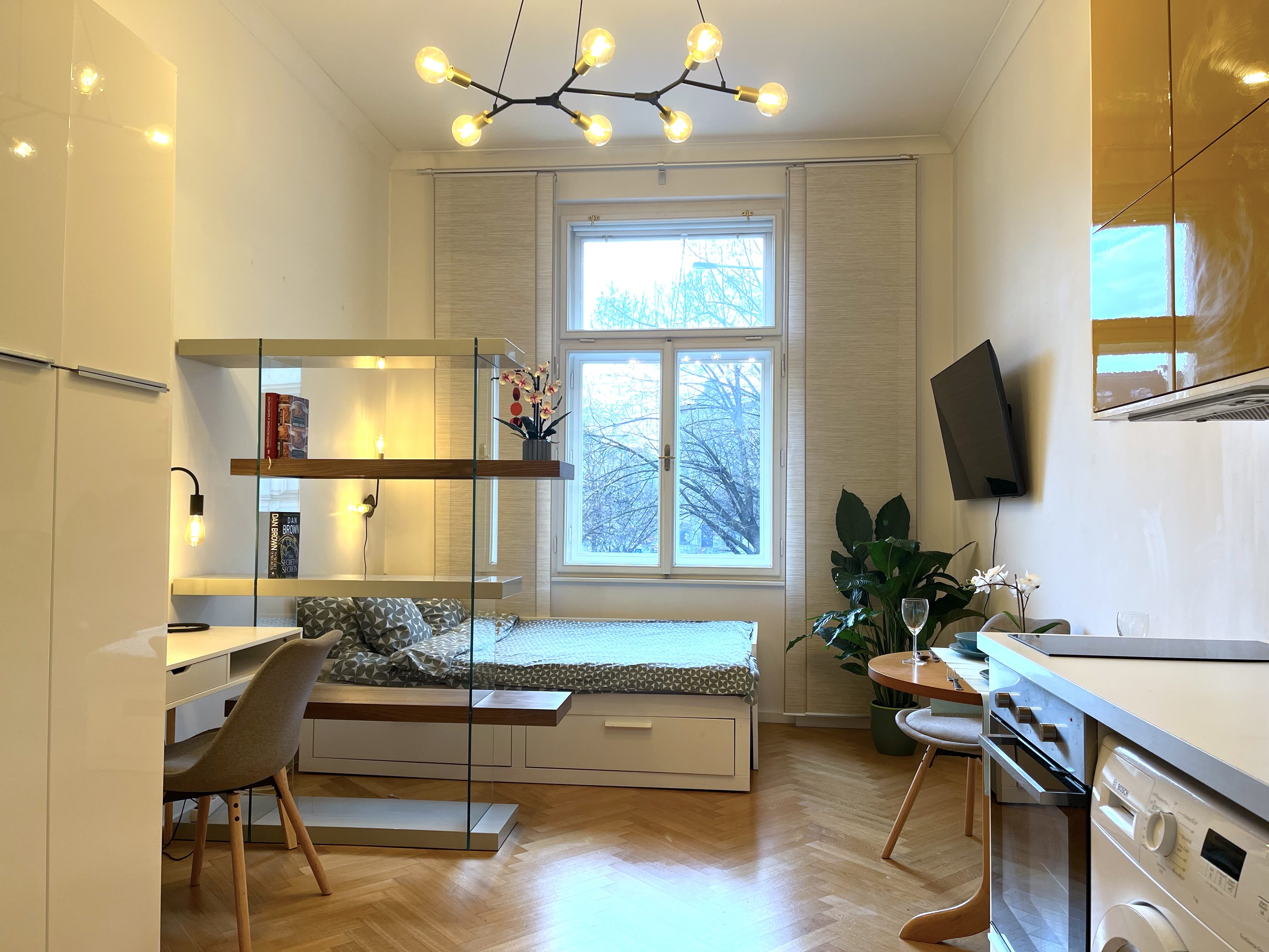 The apartment has a double frame window with the street view heading east, so full sunshine comes in the morning, but not in the hot summer afternoons. The studio includes a fully equipped kitchen with an induction hob, electric oven, and a built-in refrigerator. If you don't feel like cooking, there is a popular café with a courtyard garden right on the ground floor—perfect for breakfast, brunch, or an afternoon coffee. The working desk and designer bookshelf were arranged specifically for a comfortable home office setup. The bed is adjustable and can be easily extended into a double bed.