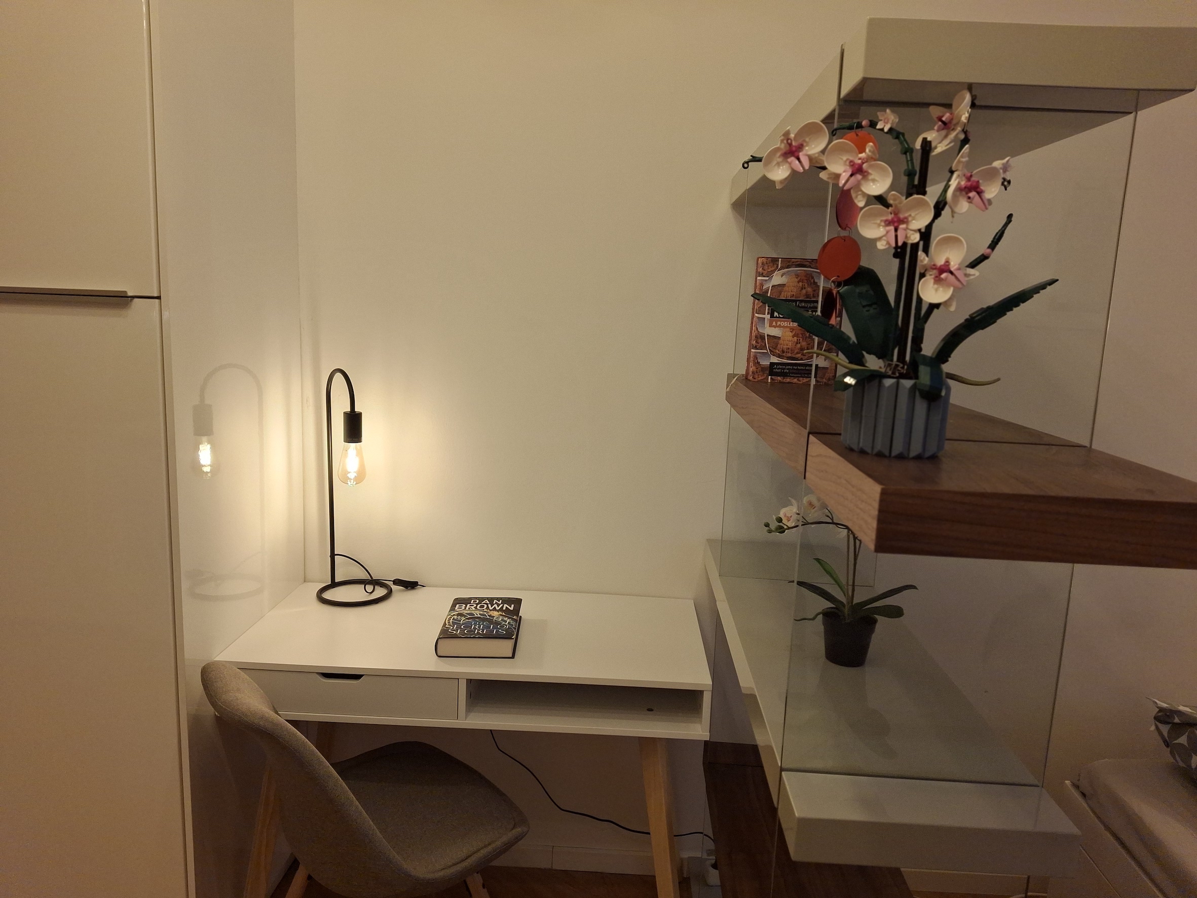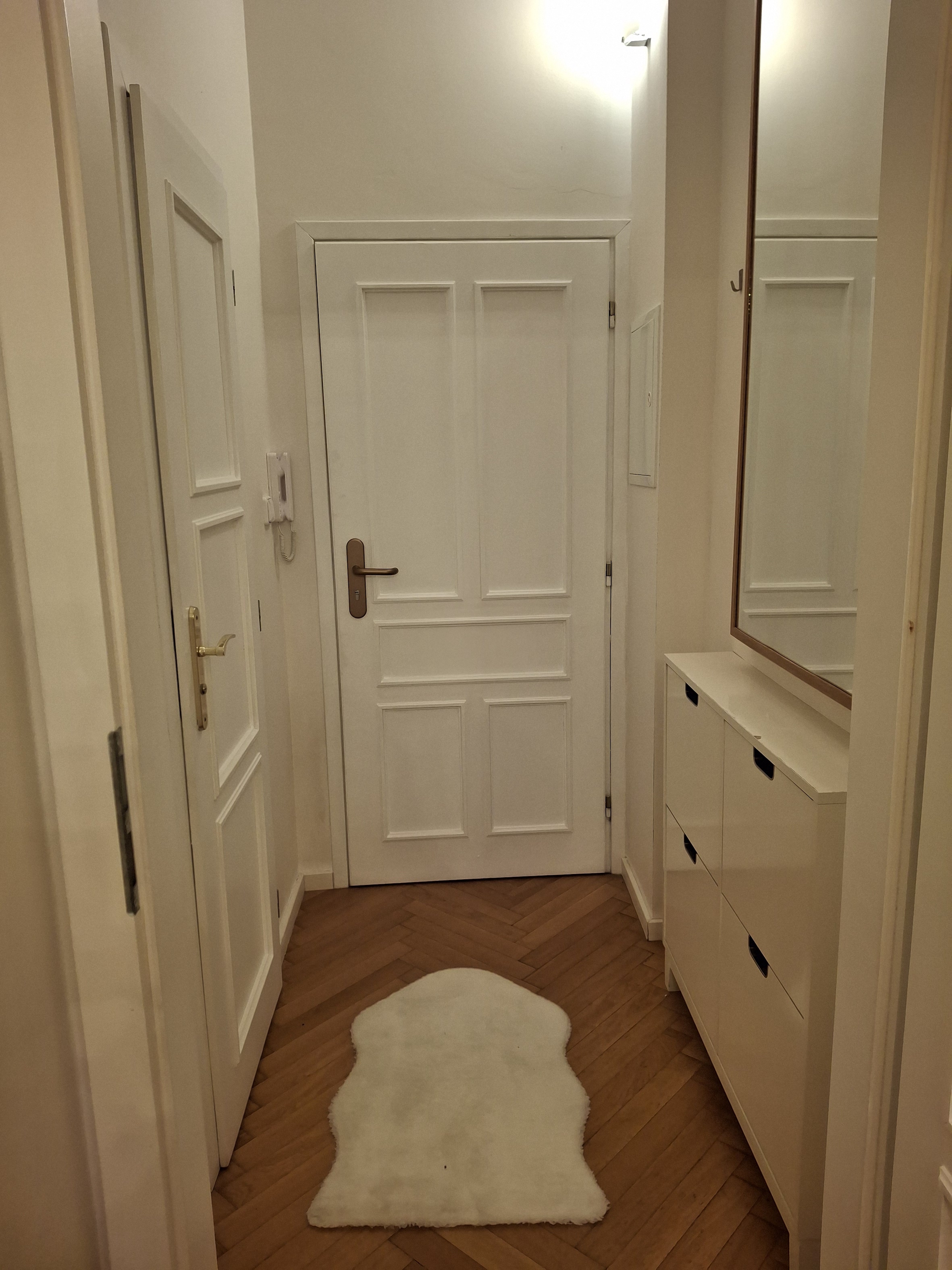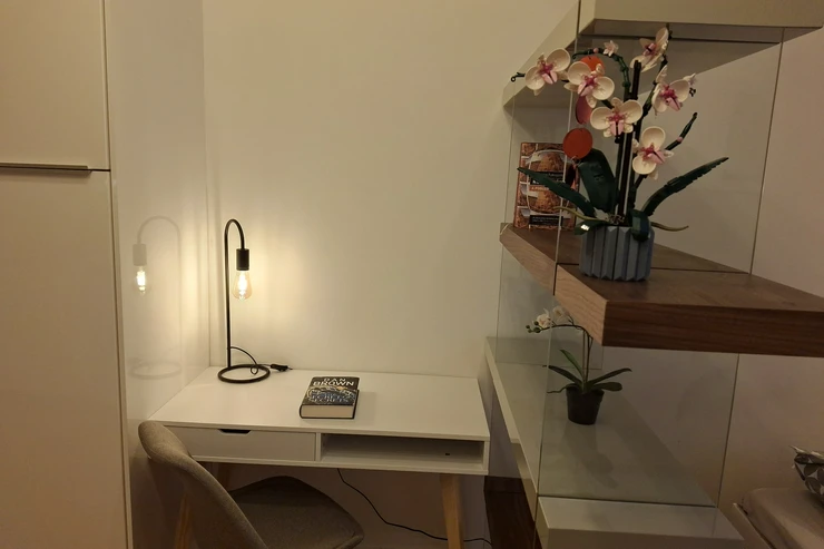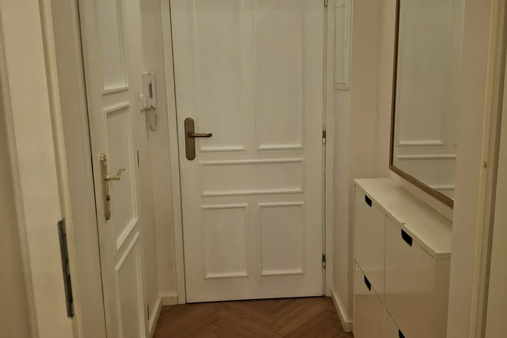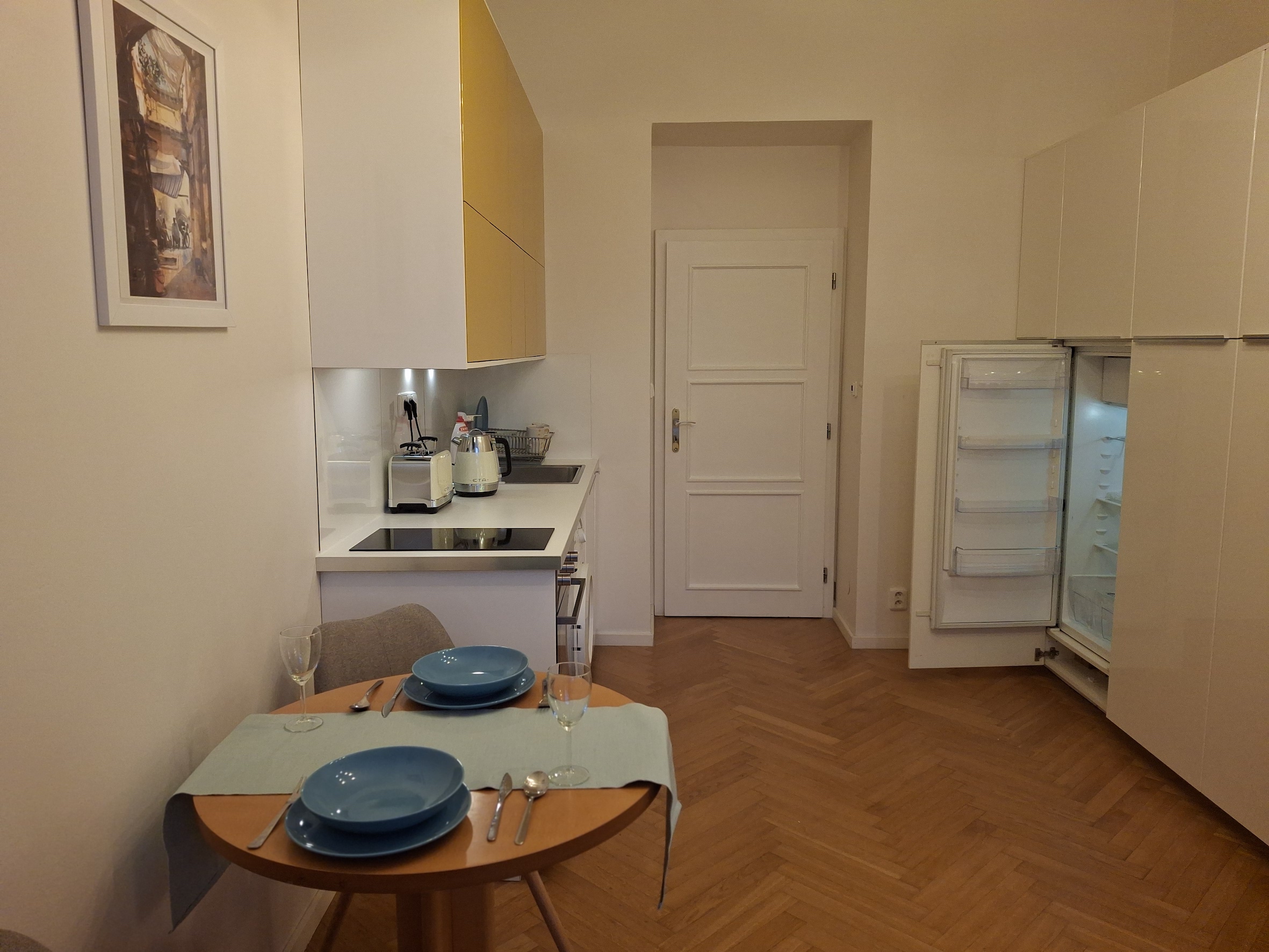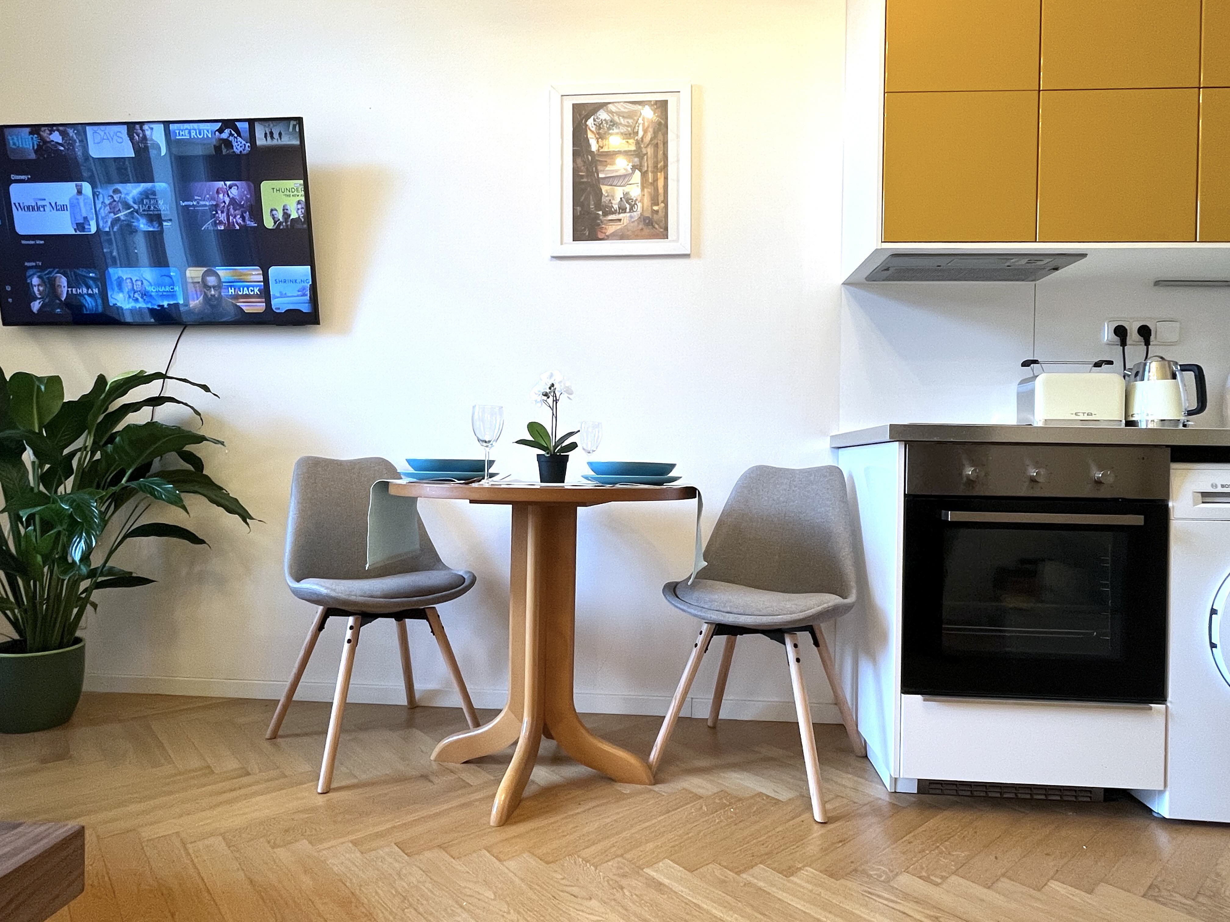 The apartment has a double frame window with the street view heading east, so full sunshine comes in the morning, but not in the hot summer afternoons. The studio includes a fully equipped kitchen with an induction hob, electric oven, and a built-in refrigerator. If you don't feel like cooking, there is a popular café with a courtyard garden right on the ground floor—perfect for breakfast, brunch, or an afternoon coffee. The working desk and designer bookshelf were arranged specifically for a comfortable home office setup. The bed is adjustable and can be easily extended into a double bed.