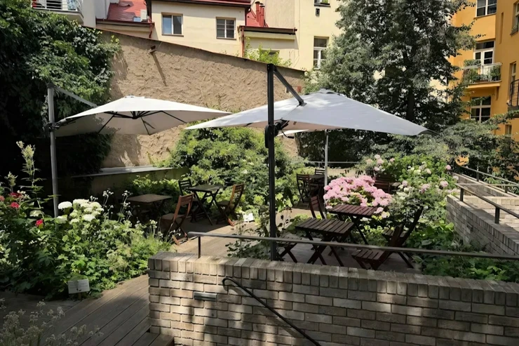 The immediate neighborhood offers a wide variety of restaurants and shops—ranging from the traditional Pivnice U Bansethů (famous for its roasted duck) to sushi, Vietnamese specialties, pizzerias, local wine bars, and bakeries.