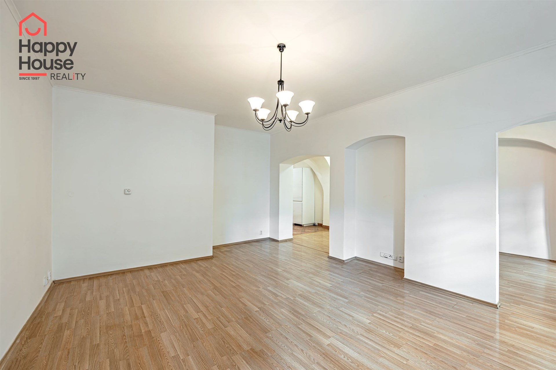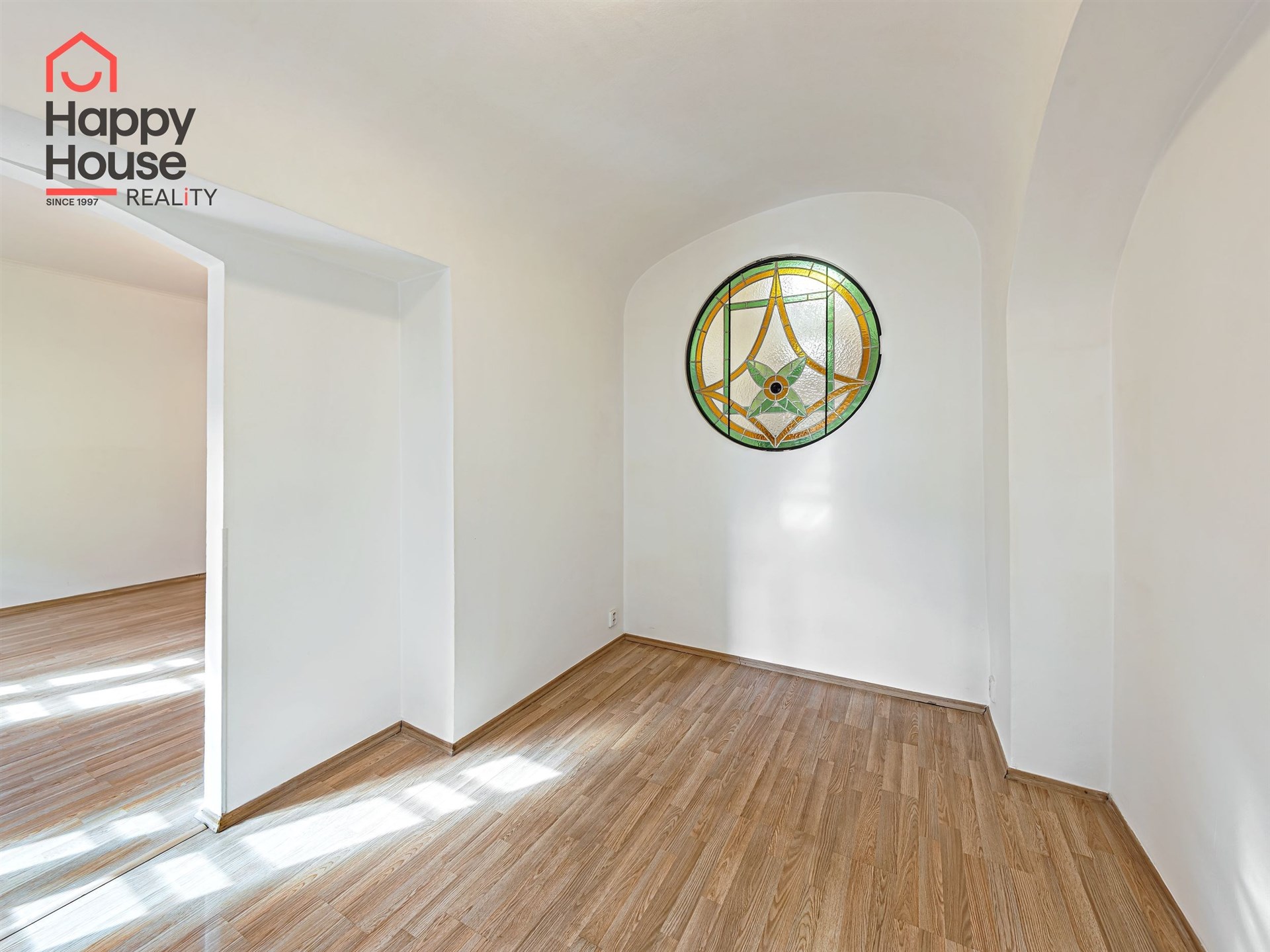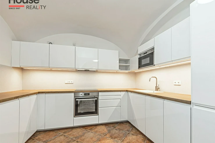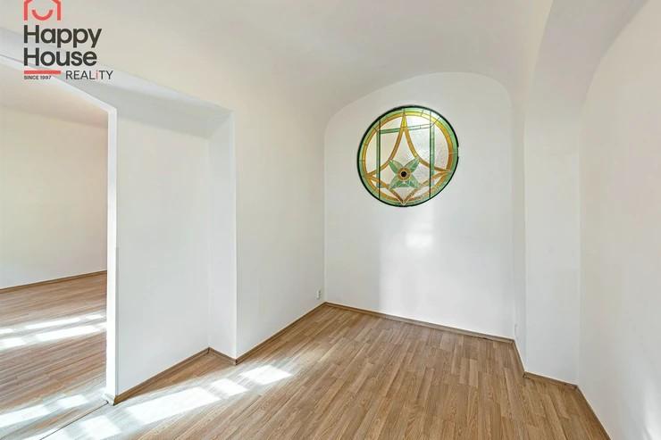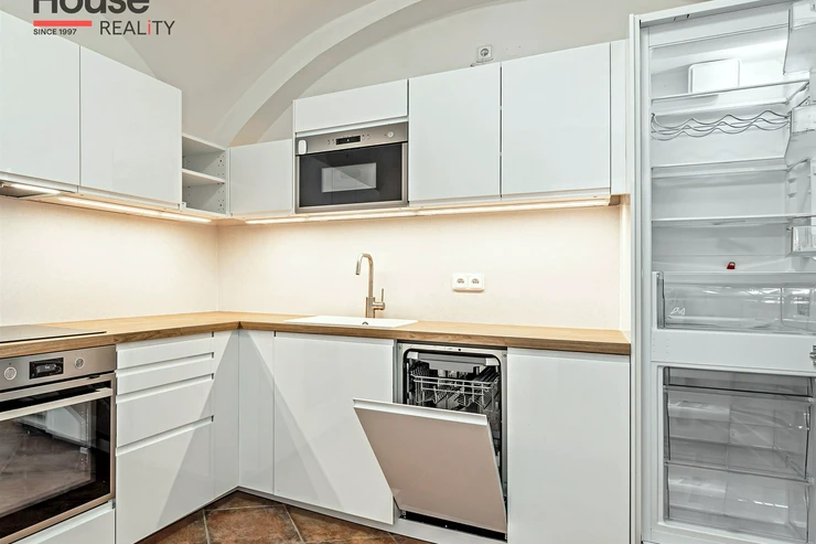 The apartment is unfurnished and features an entrance hall, a spacious living room with a separate kitchenette, a bedroom, a dressing room, and a bathroom. The kitchenette is equipped with built-in appliances - a refrigerator with freezer, ceramic hob, electric and microwave oven, and dishwasher. The bathroom includes a bathtub, heating ladder, toilet with a bidet shower, and preparations for a washing machine. Laminate floating floors and tiling are throughout the aparment. The house has a gas boiler and the apartment has a thermostat. The windows offer a beautiful view of Petřín and the greenery of Strahov Gardens to the south and the inner courtyard to the north. A courtyard and a common room in the basement are available for shared use. Street parking - residential zones.