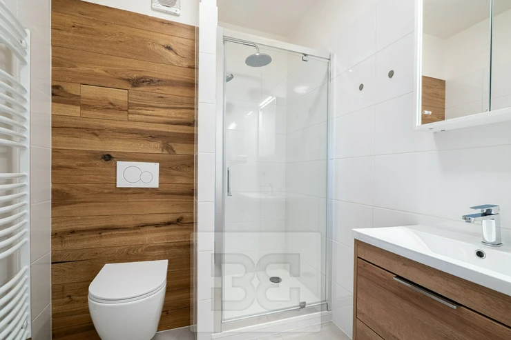 Byt se sestává z koupelny se sprchovým koutem a toaletou, obývacího pokoje s kuchyní a dvě samostatné menší ložnice.