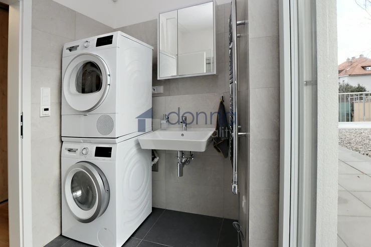 The bathroom has a shower, sink and toilet. There is also a washing machine and dryer. There is also another toilet with a sink and a storage room in the apartment.