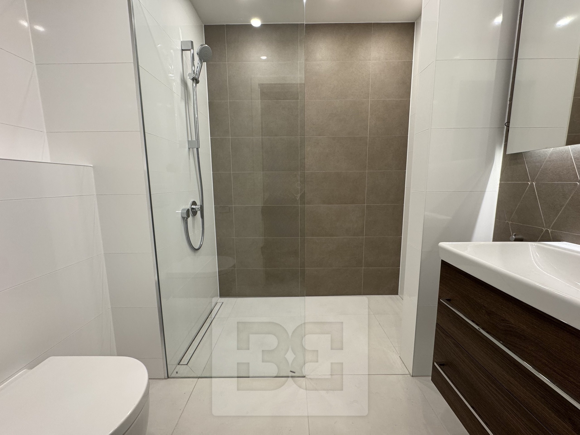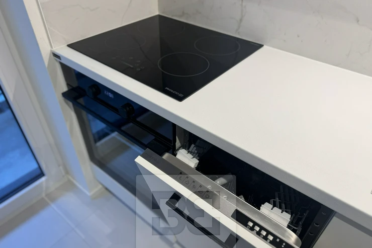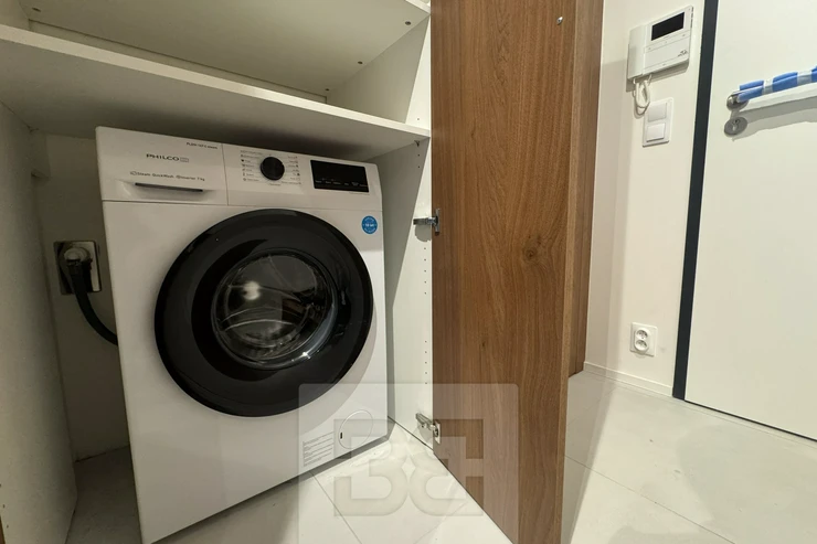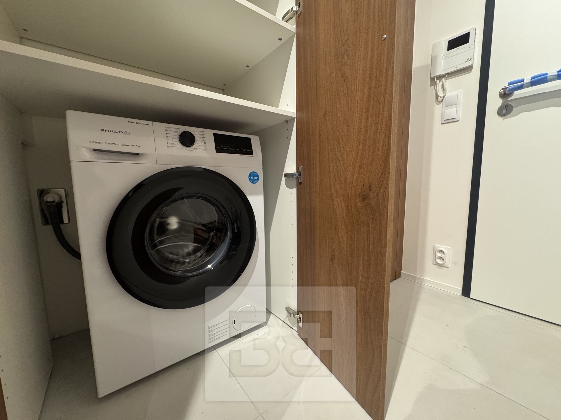 The apartment is fully furnished with high-quality designer furniture, with a very efficient and thoughtful layout. There are spacious built-in wardrobes, one of which discreetly houses a washing machine. The fully equipped kitchen includes a dishwasher.