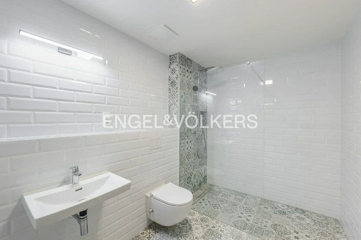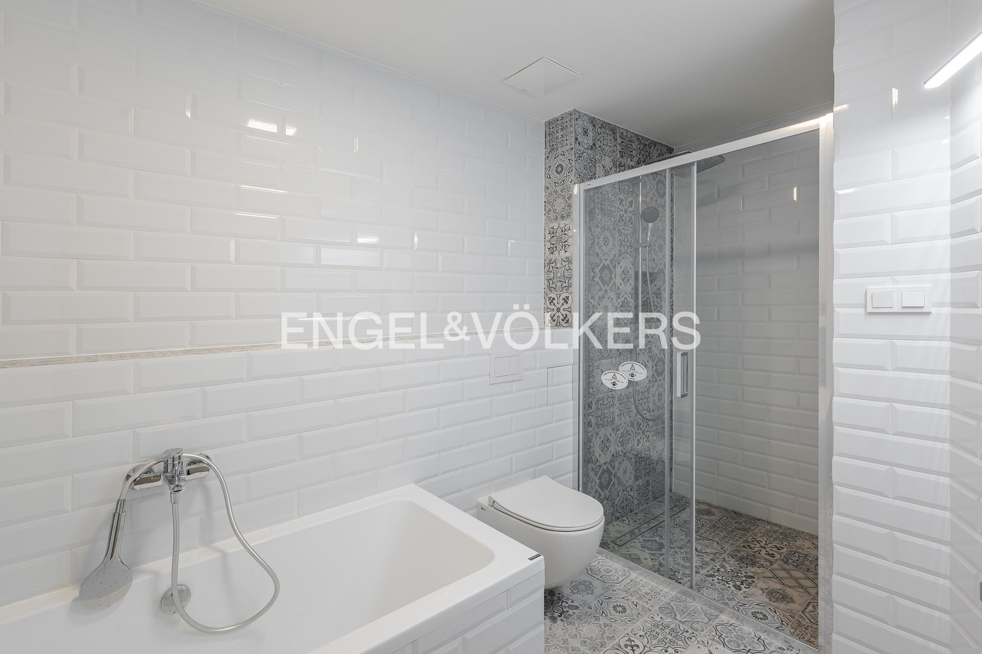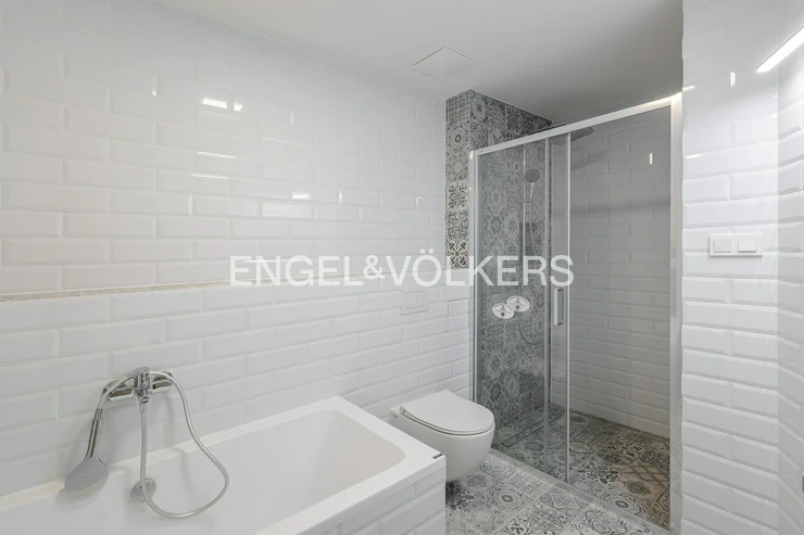 This spacious apartment offers an airy living room with a custom-made kitchenette, three bedrooms, two bathrooms, and plenty of built-in storage space. The interior is finished to a high standard – solid wood floors, wooden windows, security doors, kitchen with built-in appliances (dishwasher, refrigerator with freezer, hood, induction hob, oven, microwave). Each bathroom has a bidet shower.
