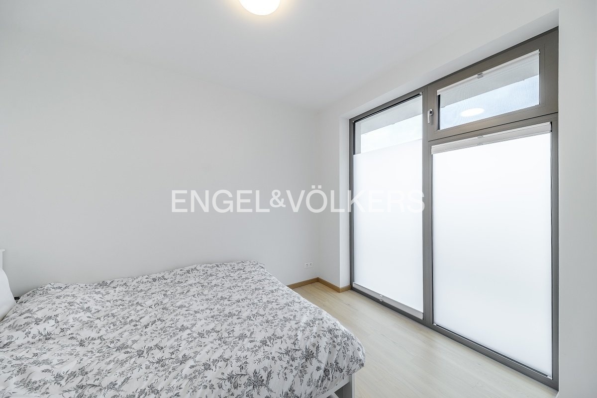 The main room is a living room connected to a fully equipped kitchen with built-in appliances, including a washing machine. The room is very bright thanks to the French windows and offers unique views of the city.