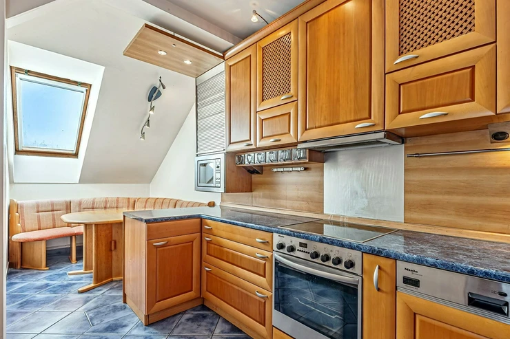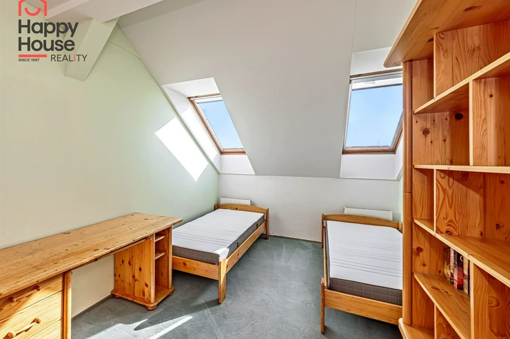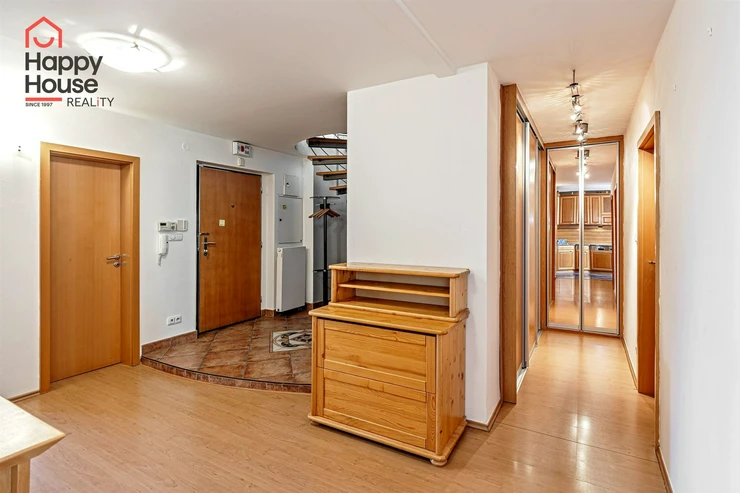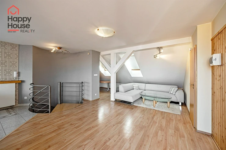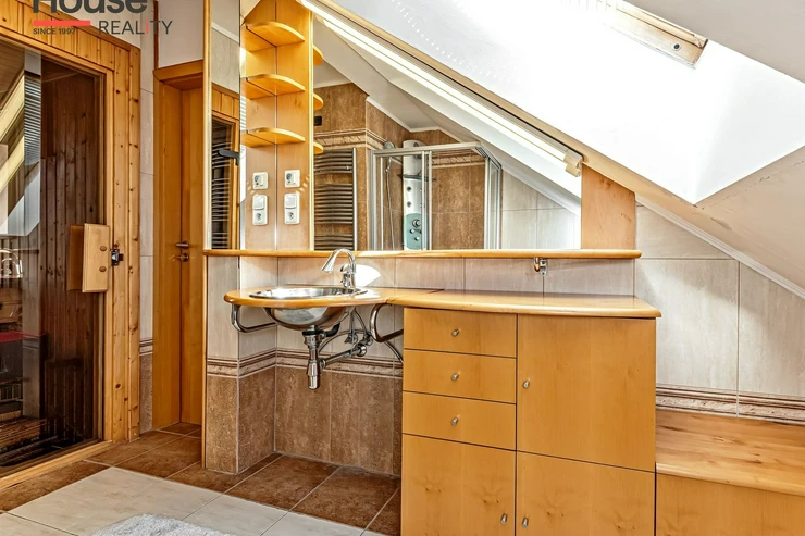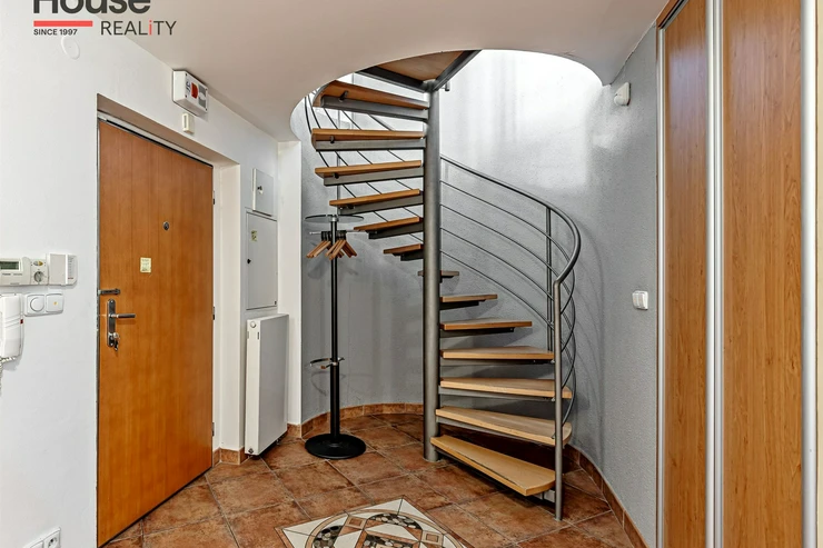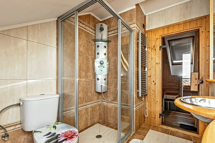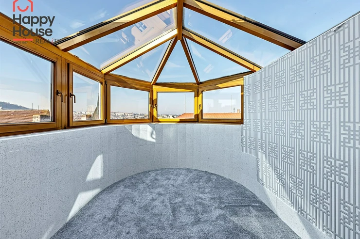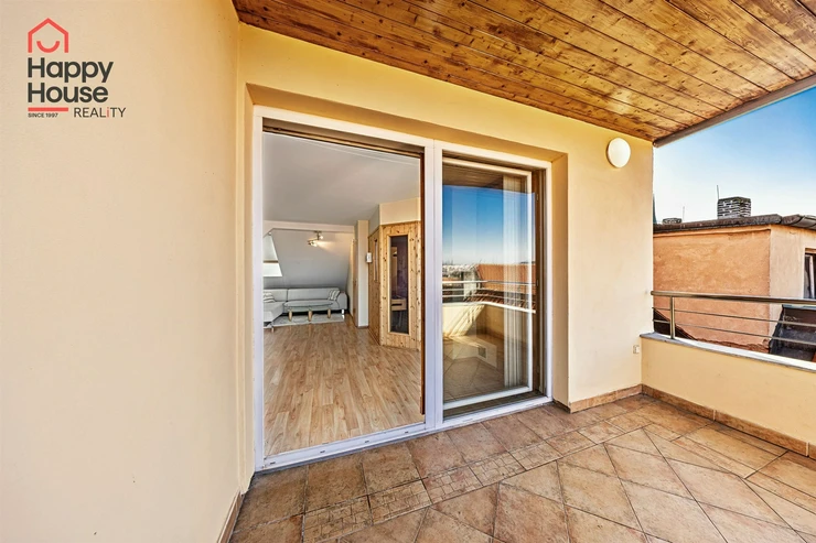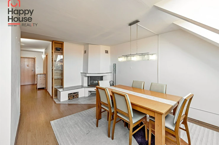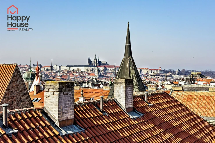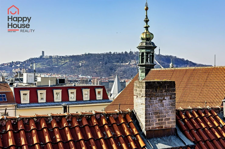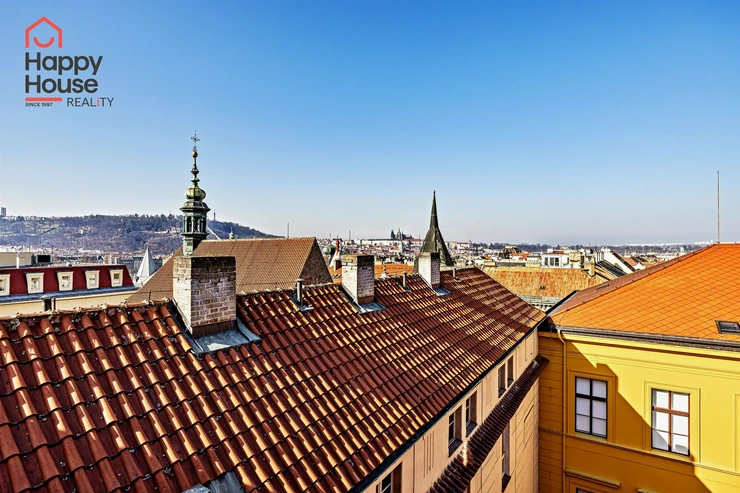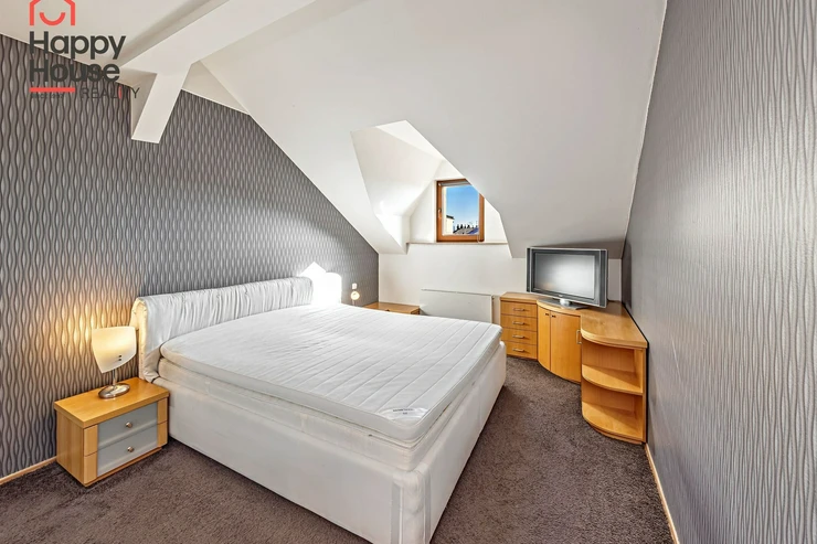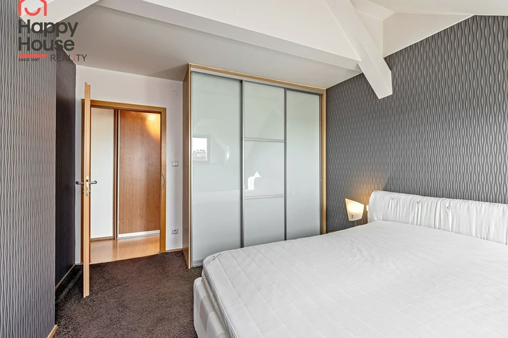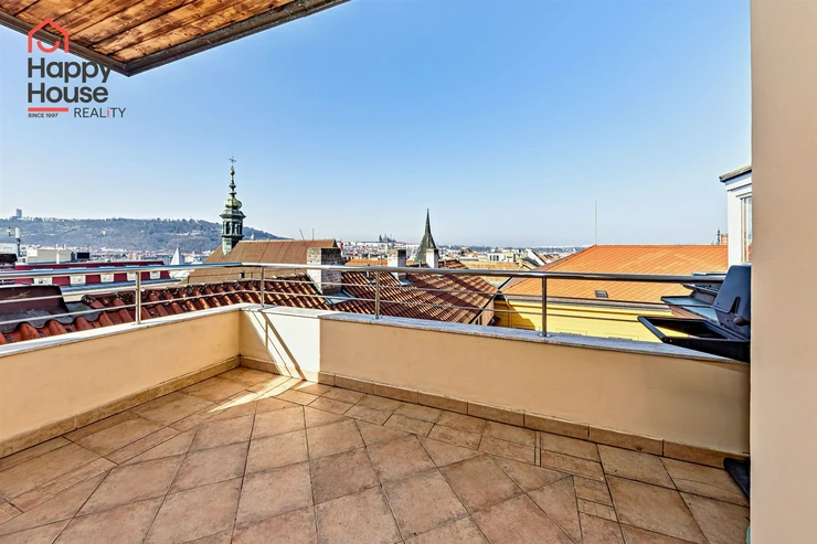 We offer for rent a luxurious, spacious, attic, duplex two-bedroom apartment with a terrace on the 6th floor of a brick building with an elevator in a prestigious location in Prague 2, New Town. The apartment is fully equipped and features an entrance hall, a living room with a kitchenette, a dining area with a fireplace, 2 bedrooms, two bathrooms, a separate toilet, as well as a sauna and a room with a glass ceiling. The kitchenette includes a kitchen unit with built-in appliances - fridge with freezer, ceramic hob, electric and microwave oven, extractor hood, and dishwasher. One bathroom has a massage shower and toilet, and the other has a bathtub, washing machine, and toilet. The terrace offers a beautiful view of Prague Castle and Petřín. Laminate floating floors, tiling. Telephone connection, cable TV, and internet available. Central gas heating. Street parking - zones.