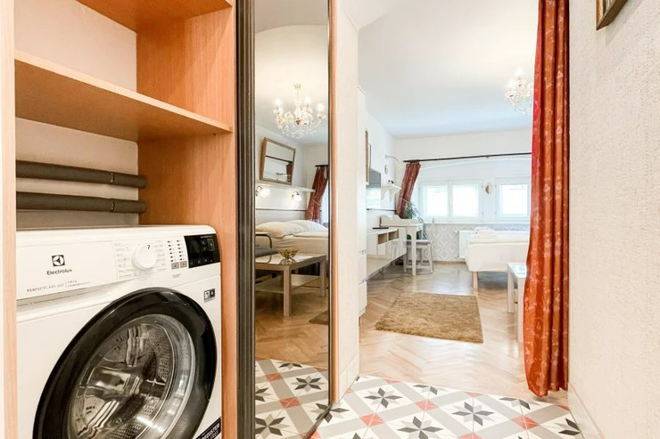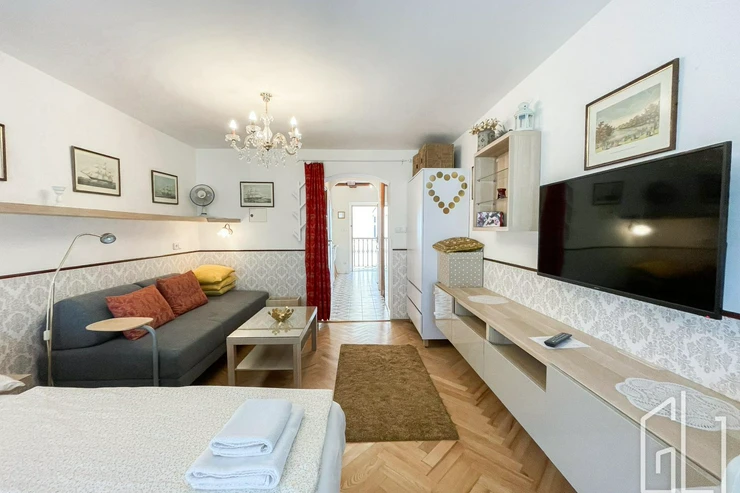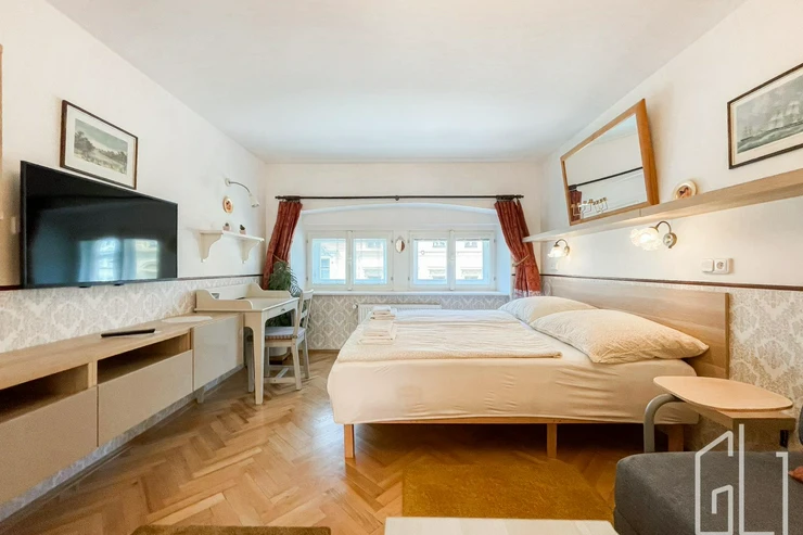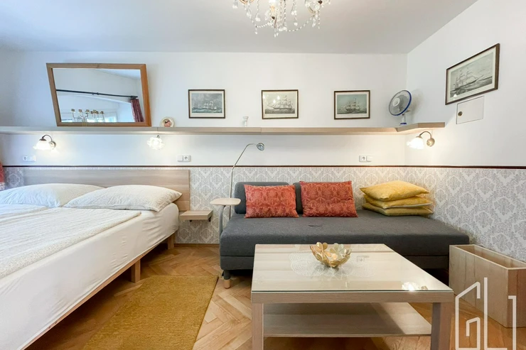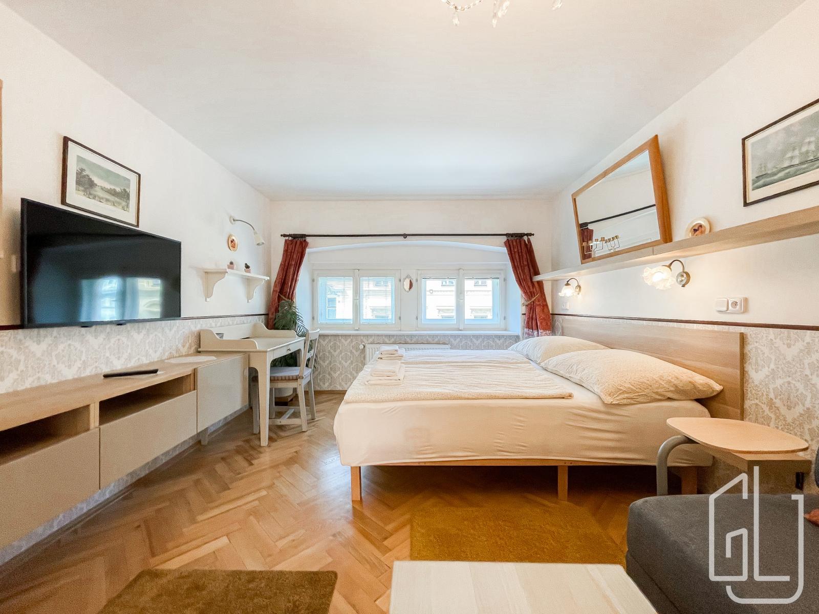 Dispozičně je byt rozdělen na obývací pokoj s kuchyňským koutem, jídelní částí a klidovou zónu s manželskou postelí. V bytě naleznete vestavěné skříně, jídelní stůl, TV a noční stolek.