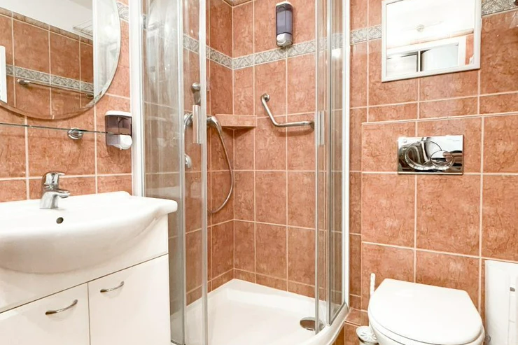 Koupelna nabízí sprchový kout, toaletu, umyvadlo a pračku.