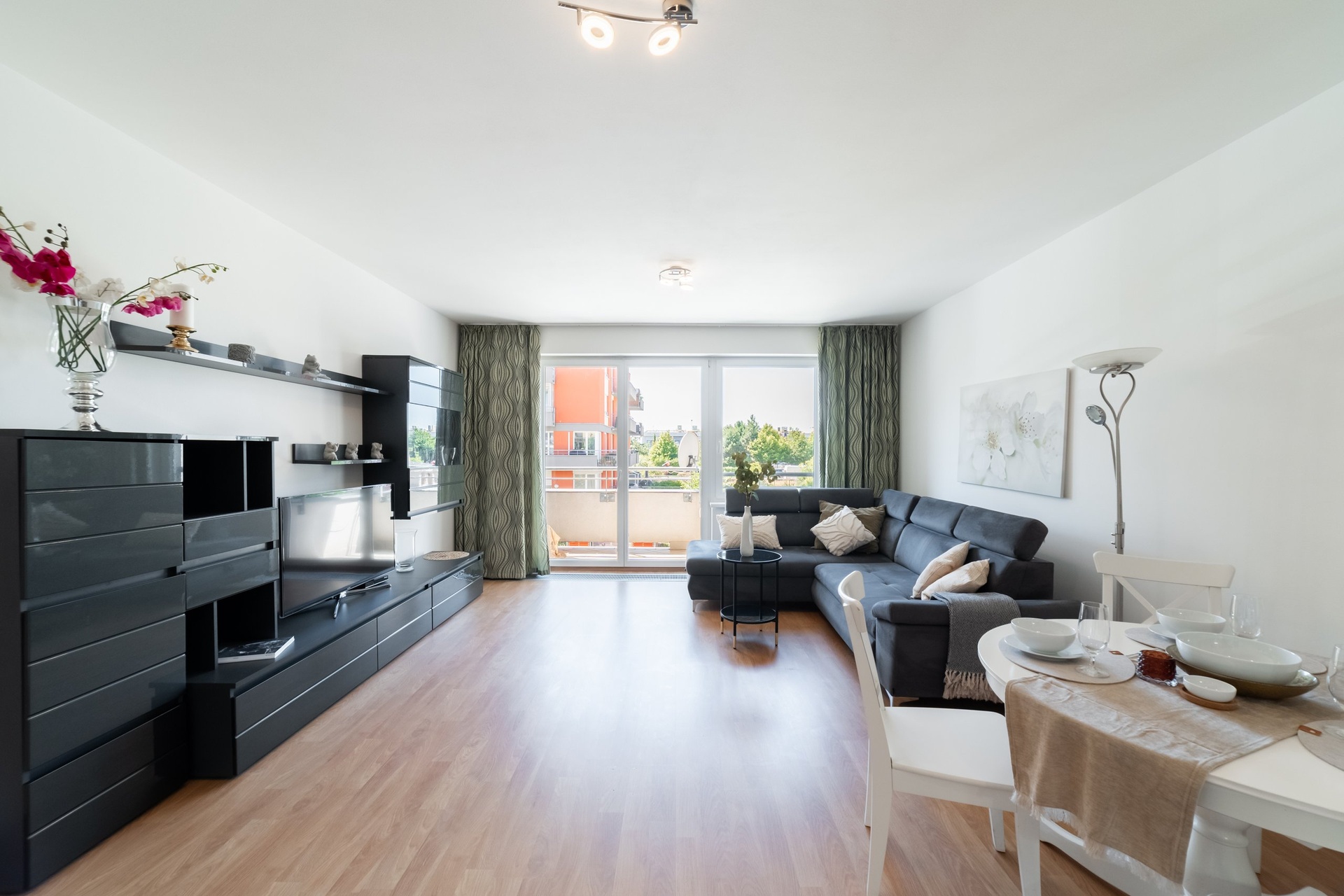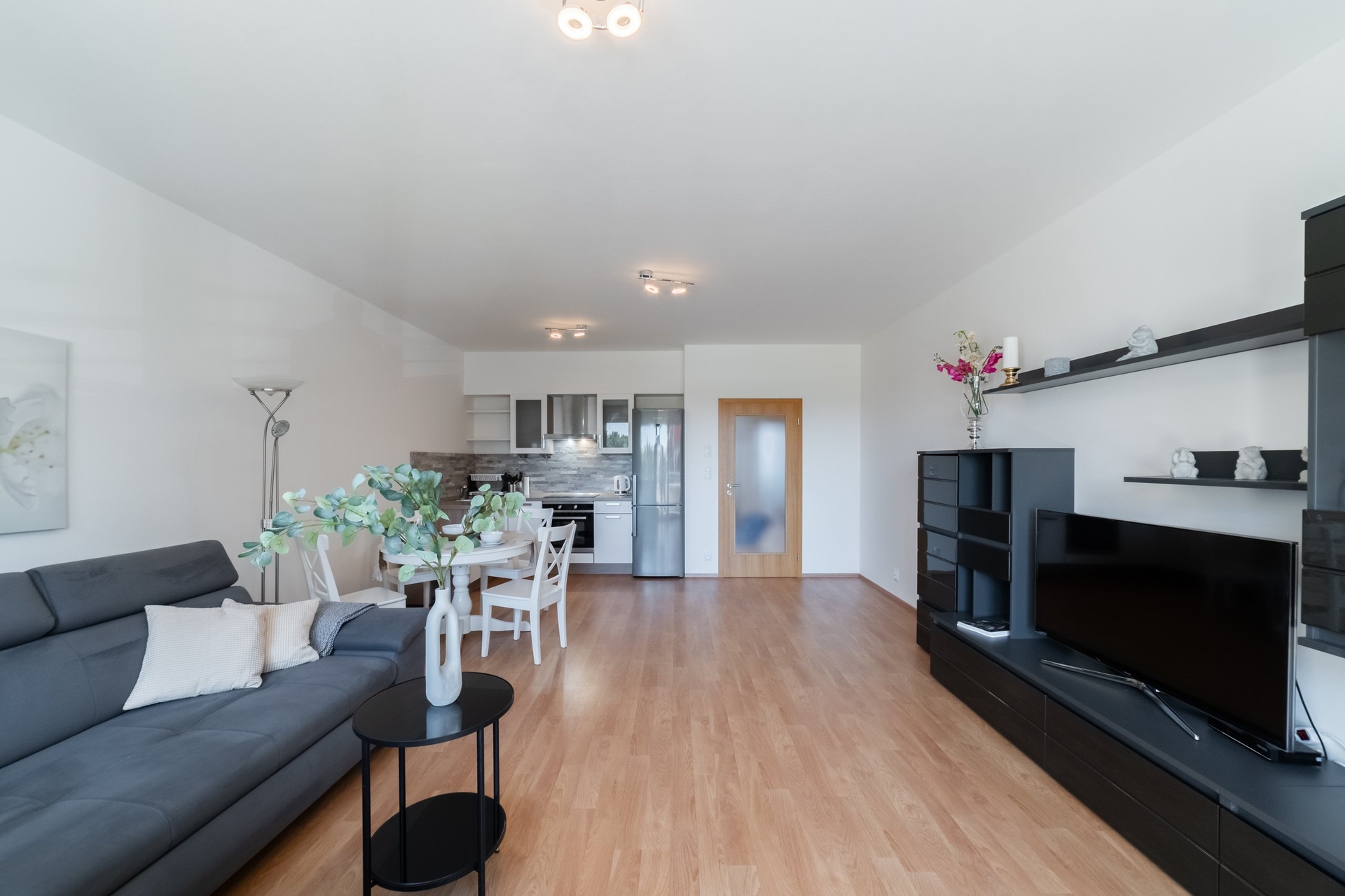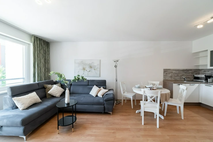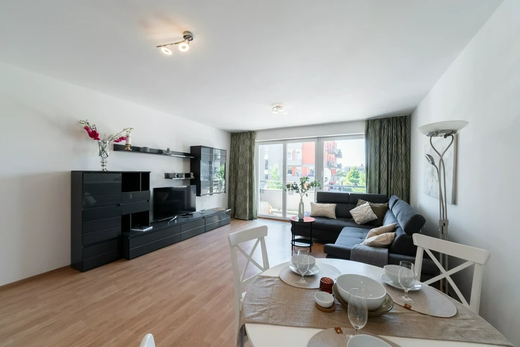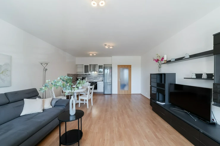 Dispozice a hlavní přednosti bytu je velkorysý obývací prostor s moderním kuchyňským koutem. Přímý vstup na balkon přirozeně rozšiřuje obytný prostor a přináší dostatek denního světla.