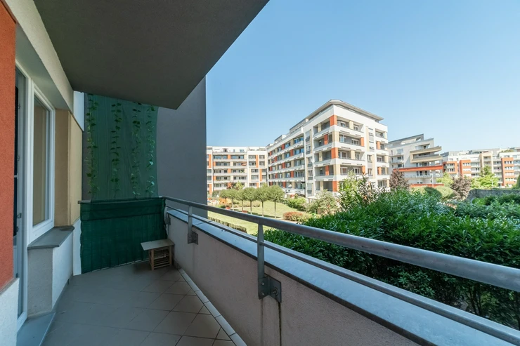 Prostorný balkon nabízí dostatek místa pro venkovní posezení, ranní kávu i večerní relax.