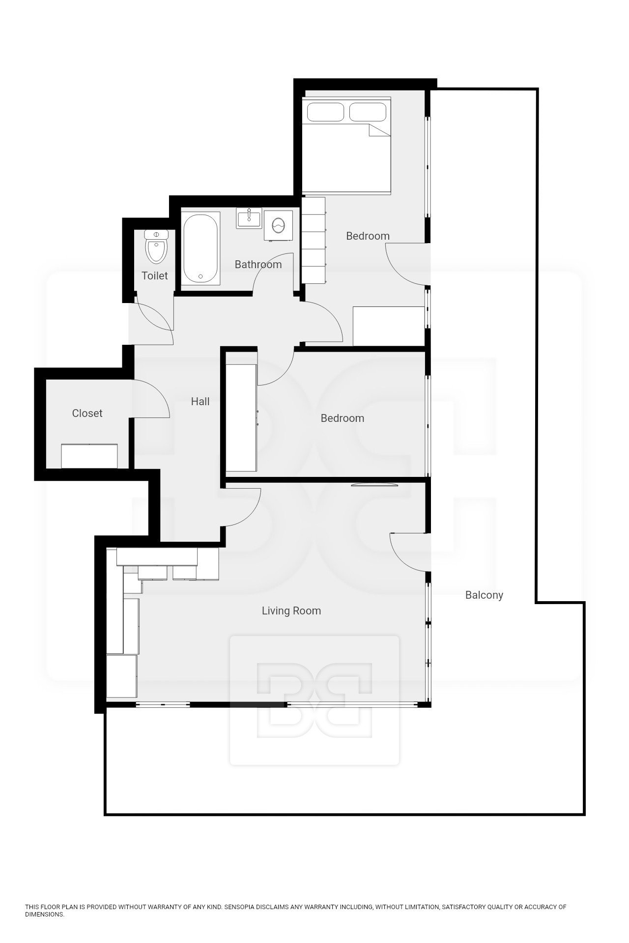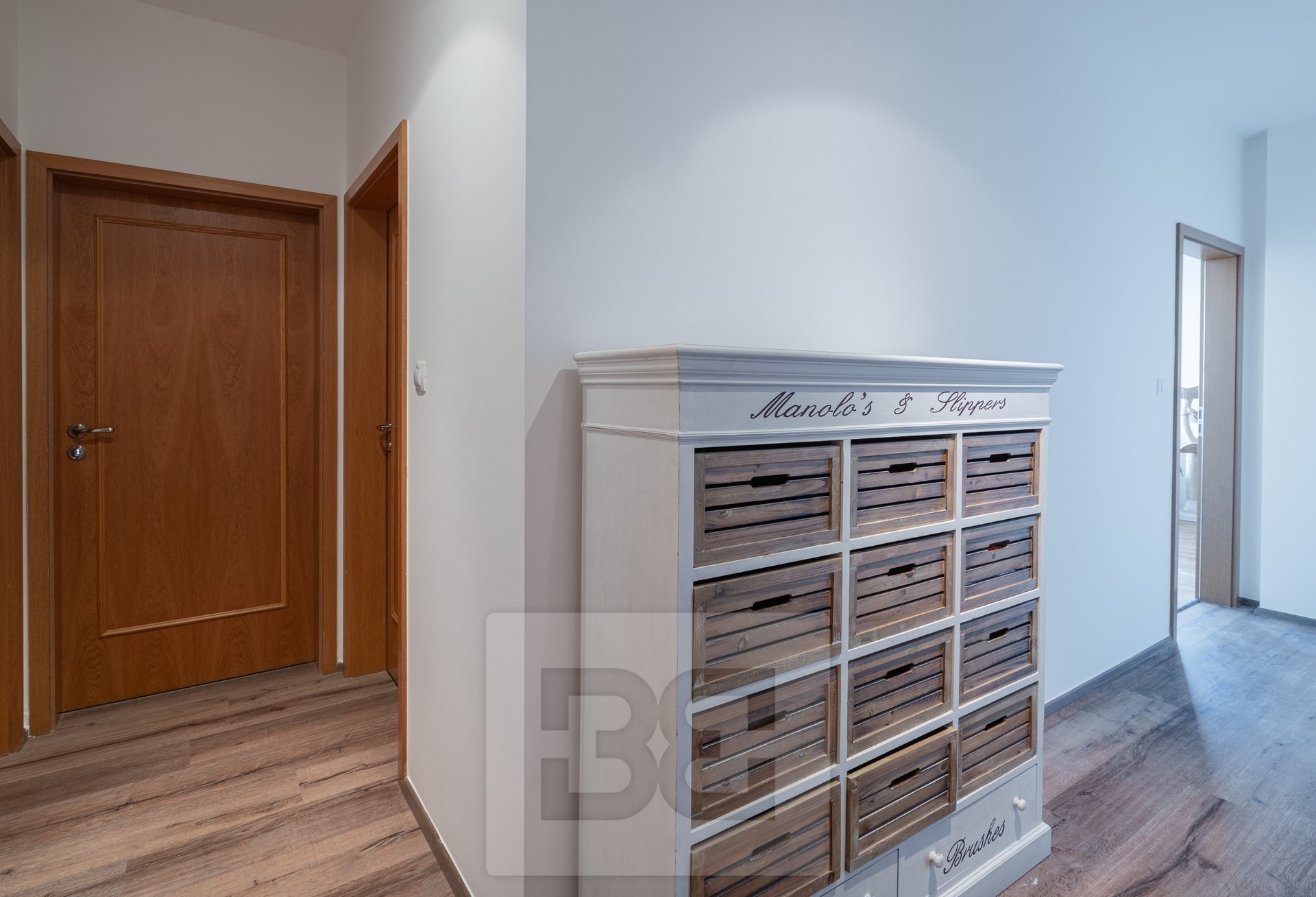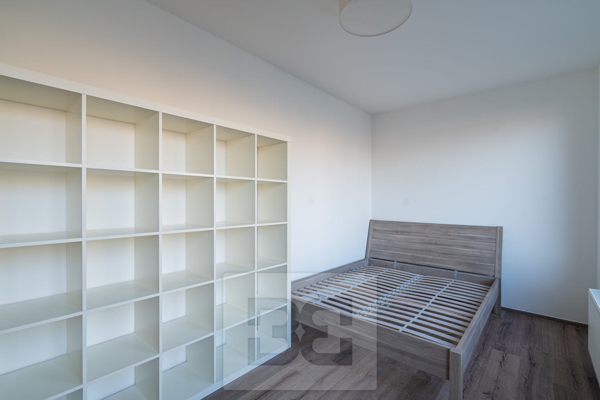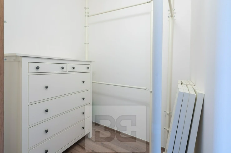 The main bedroom is partially furnished with a bed, a desk, and a bookcase. The second, smaller bedroom is fitted with a wardrobe. Another major benefit is a separate walk-in wardrobe located directly in the apartment.