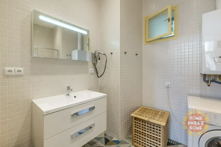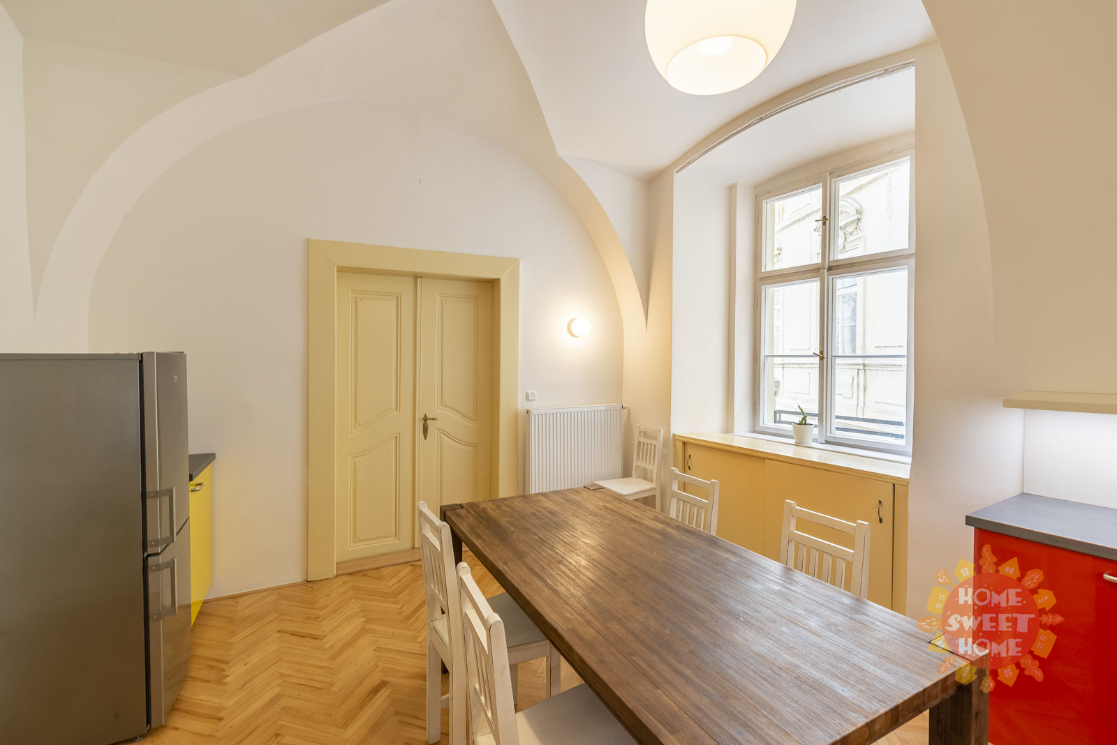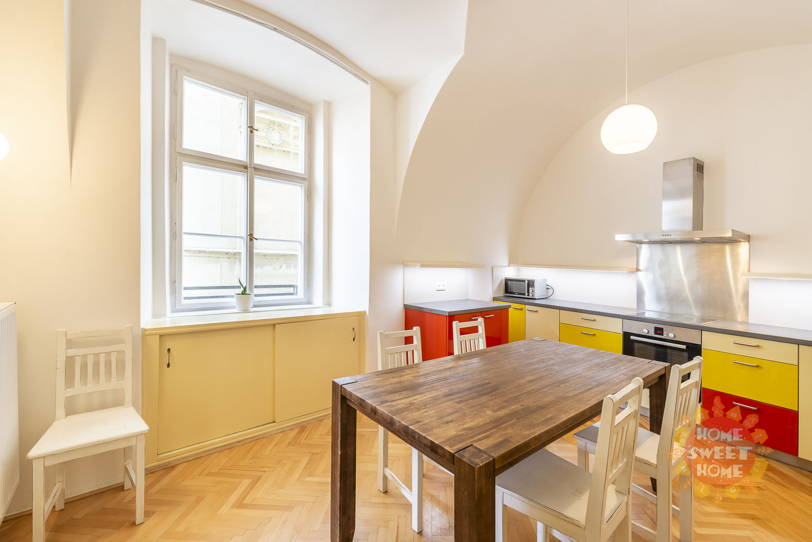 The layout of the apartment offers a spacious living room, bedroom, kitchen equipped with oven and stove, dishwasher, microwave, refrigerator with freezer, utensils, kettle and coffee maker, bathroom with tub and washing machine, toilet and entrance hall. Heating and hot water is provided by its own gas boiler. The apartment has interesting baroque vaults. Solid wood floors and tiles on the floors.