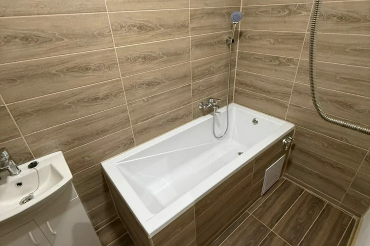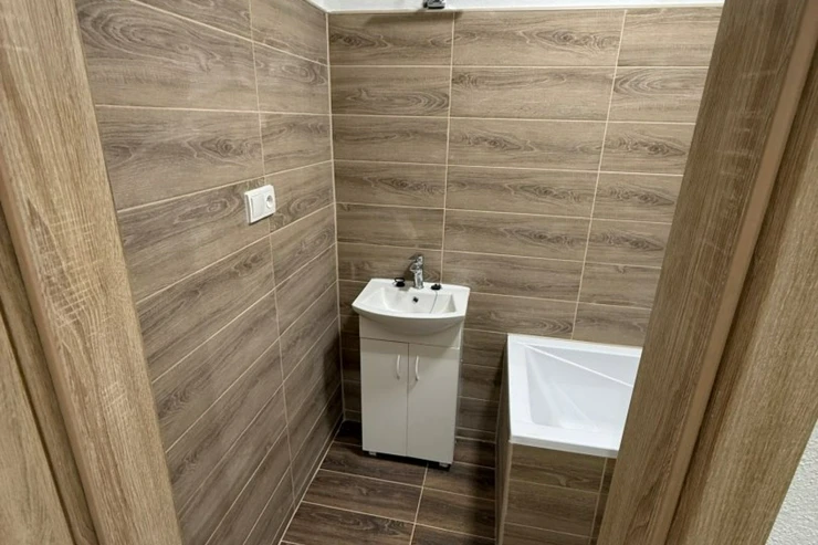 Koupelna: Zděné jádro, nová vana, elegantní obklady a příprava na pračku.