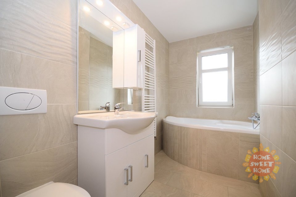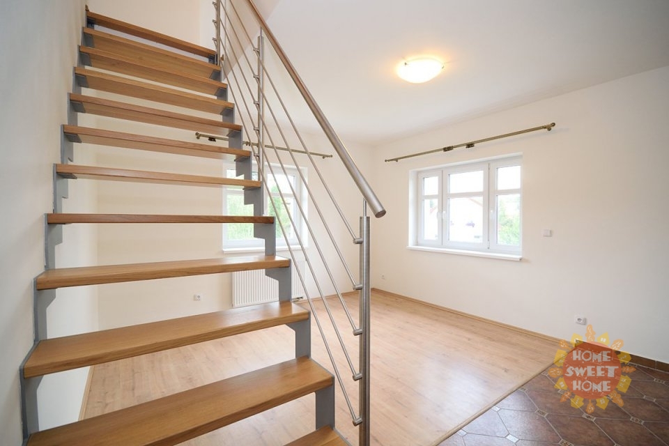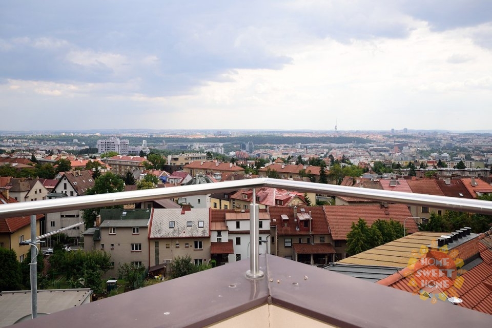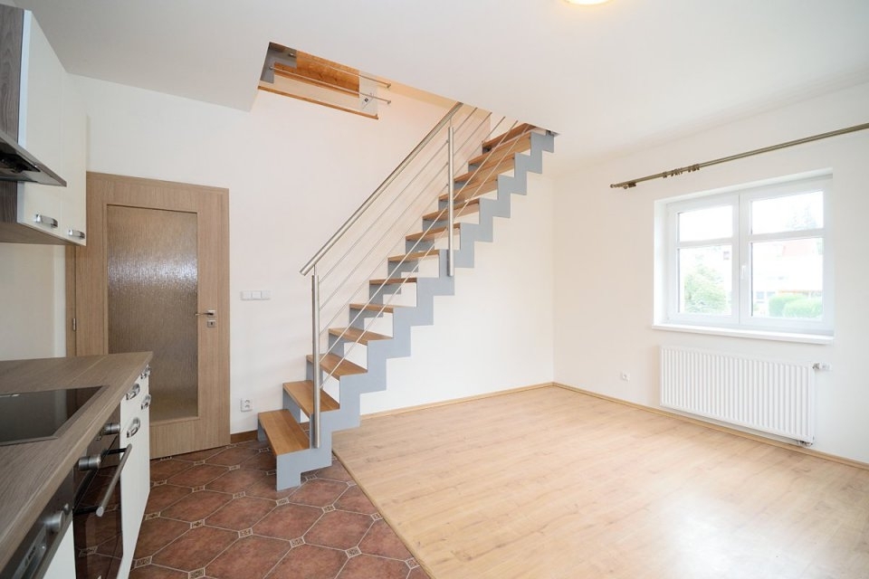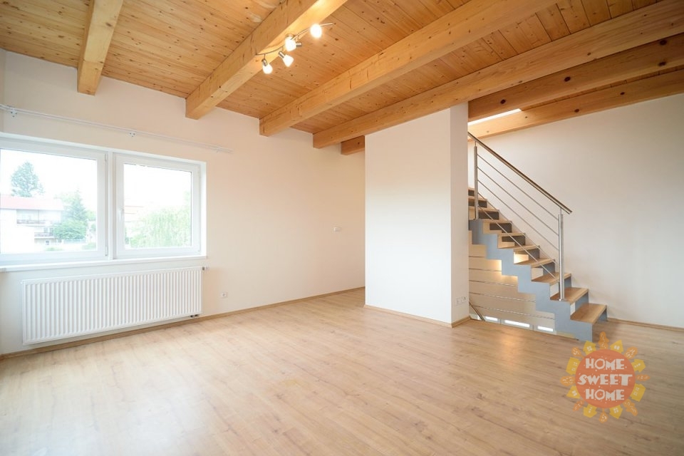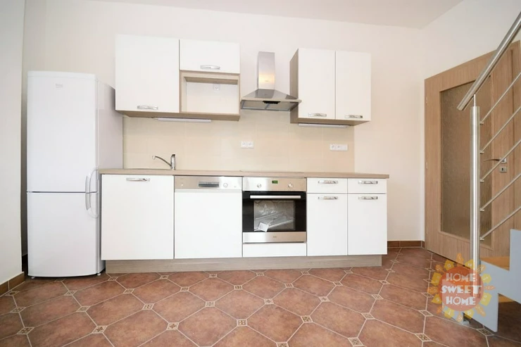 We offer for rent a bright, unfurnished 3+kk duplex apartment with a total area of 68 m² with a balcony and a spacious terrace of 30 m², located in the residential area of Prague 8 - Kobylisy, Hovorčovická Street. The apartment is located on the 3rd floor of a brick building without an elevator. The building is insulated. The apartment was approved for occupancy in 2018. The lower floor features an entrance hall, a room with a kitchenette, a bedroom with a balcony, and a bathroom. The upper floor has a room and a staircase leading to the 5th floor, where there is access to a terrace with beautiful views of the surrounding area. The apartment is equipped with a kitchenette with built-in appliances (refrigerator with freezer, electric stove with ceramic hob). The bathroom has a bathtub and toilet. Heating is provided by central gas heating.