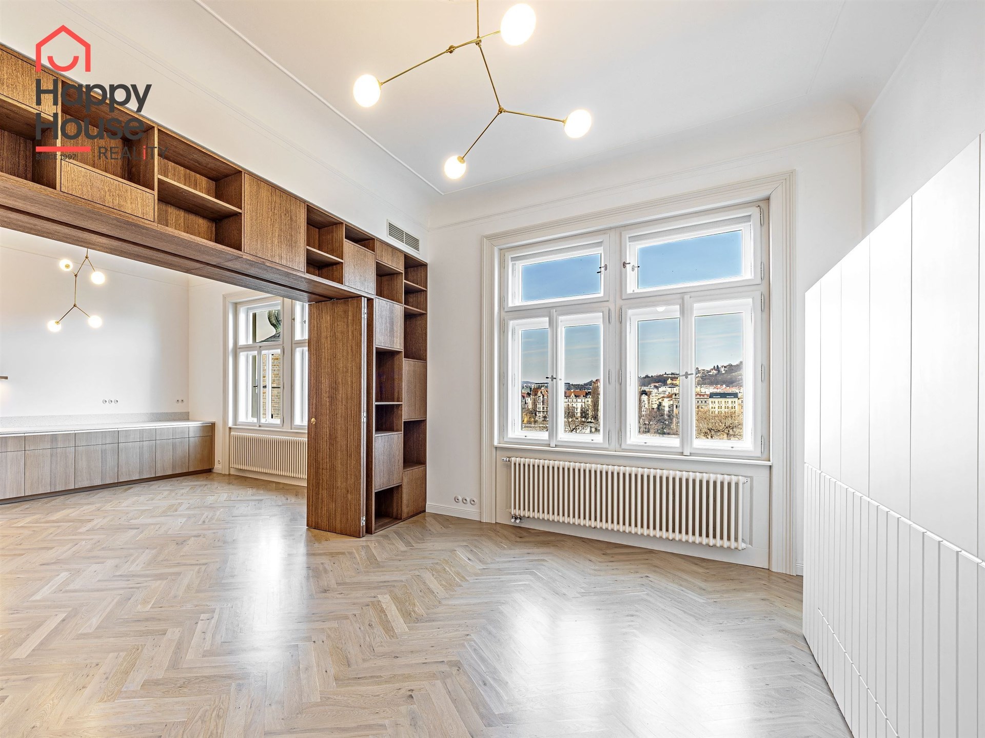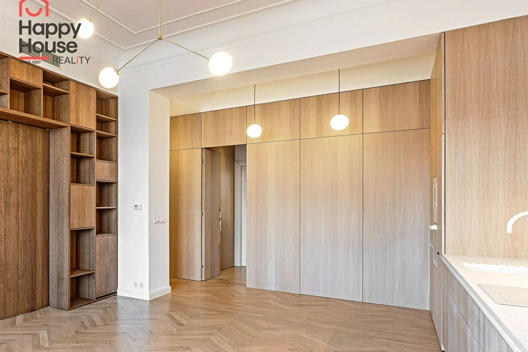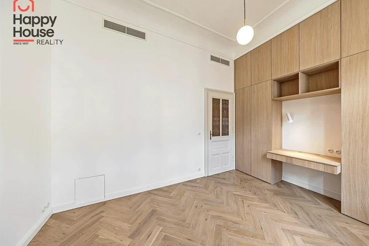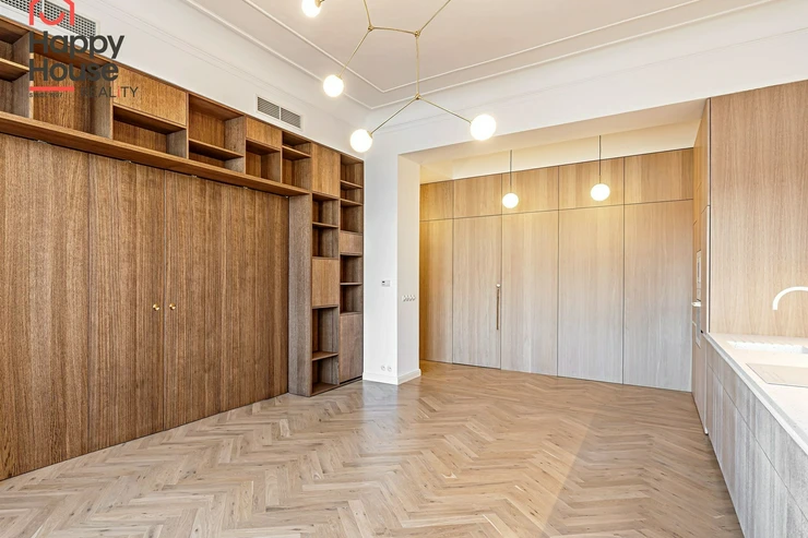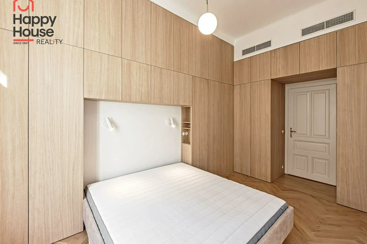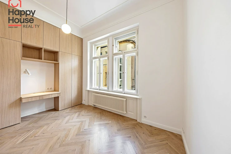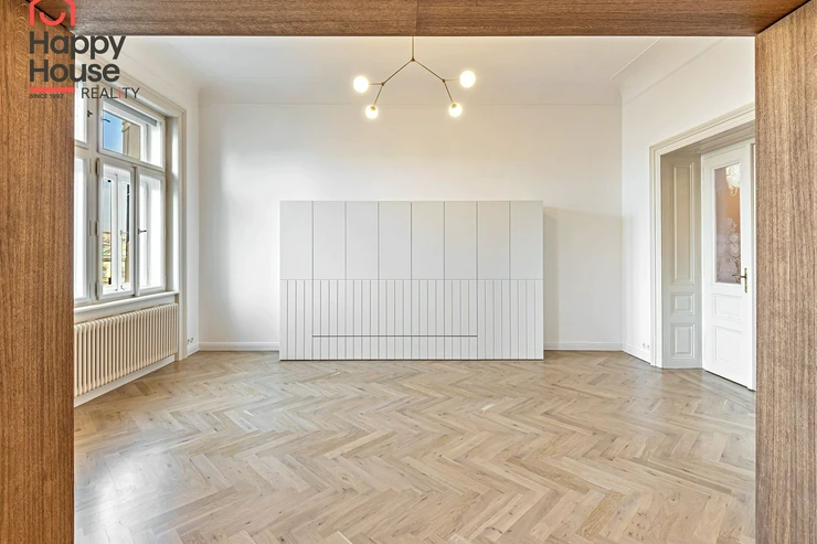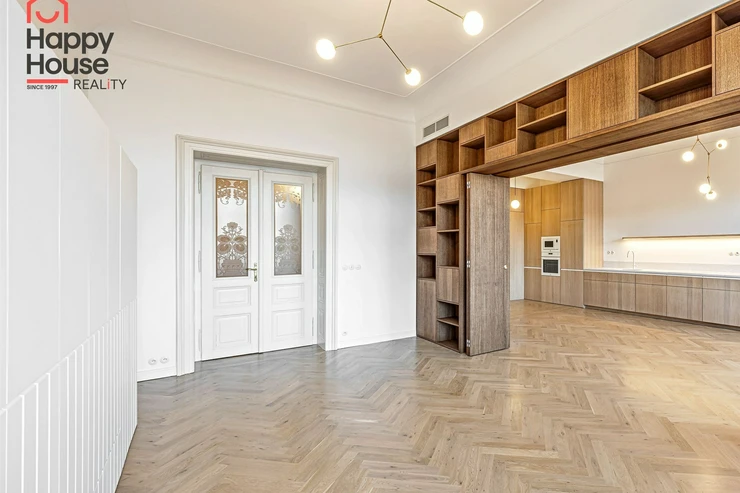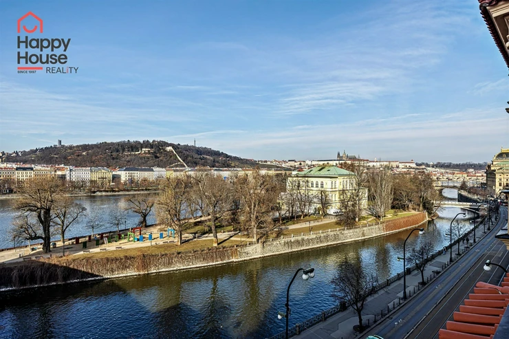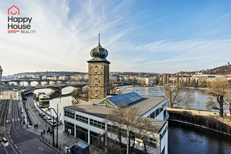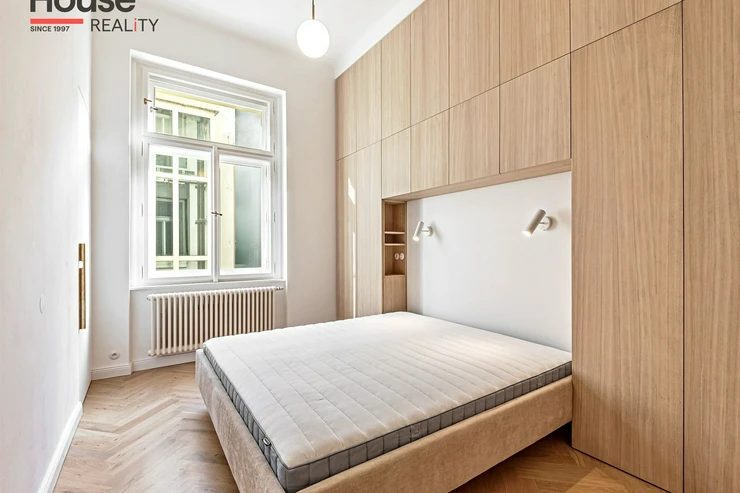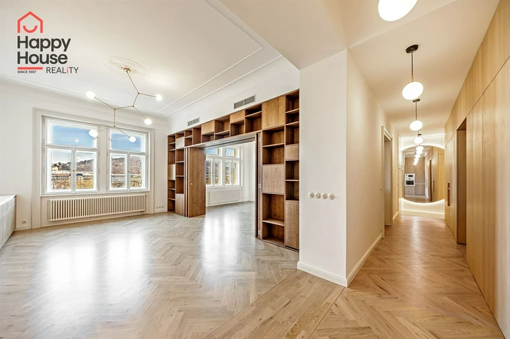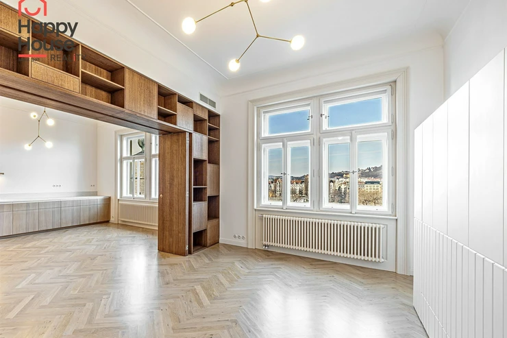 We offer for long-term lease a completely newly renovated two-bedroom apartment with an area of 112.5 sqm and high ceilings, located on the 5th floor of a renovated Art Nouveau building with an elevator on the embankment in Prague 1, New Town. You will be the first tenant in this apartment. From the large wooden double-glazed casement windows, there is a beautiful view of the Vltava River, Prague Castle, and Petřin. The apartment features high-quality, superior materials. The interior offers a spacious kitchen with a dining area, which can be separated thanks to a wooden partition or connected to the living room, where there is currently a fold-down bed for guests, but can be removed upon agreement. Additionally, there is a main bedroom with built-in wardrobe and en-suite bathroom (shower, toilet with bidet shower), a second bedroom/study with built-in wardrobes, 2 separate bathrooms (large bathtub, toilet with bidet shower / shower, toilet with bidet shower), and an entrance hall with additional built-in storage space. The bedrooms face a quiet courtyard. The kitchen is equipped with all necessary appliances – refrigerator with freezer, induction ceramic hob, electric oven, dishwasher, and extractor hood. For wine lovers, there is a special wine fridge. A washing machine is available. The floors are wooden and poured terrazzo. Electric boiler in the apartment. Videophone. Alarm. The apartment includes a cellar cubicle. This is a quiet house with no short-term rentals. Street parking - zones.