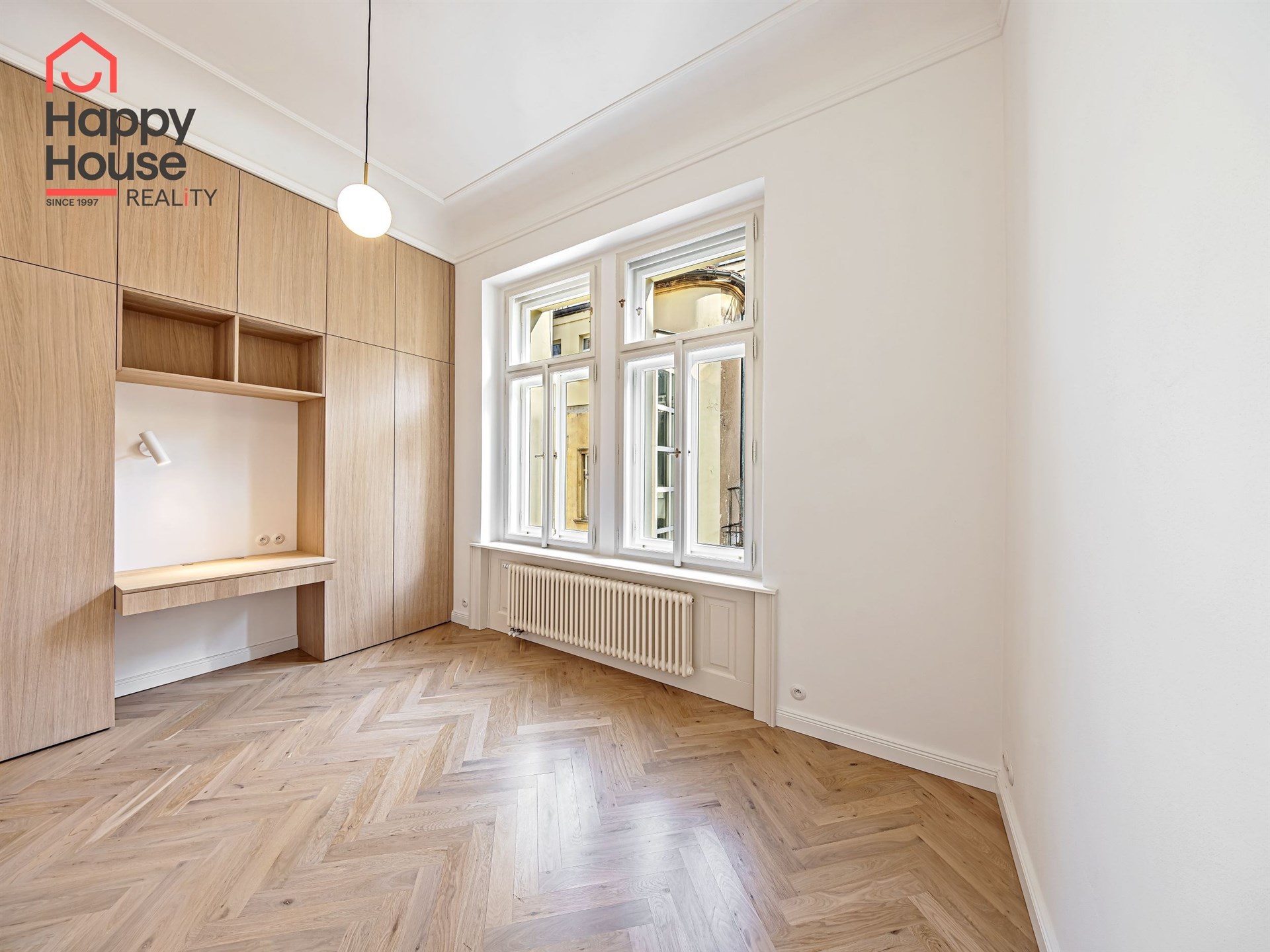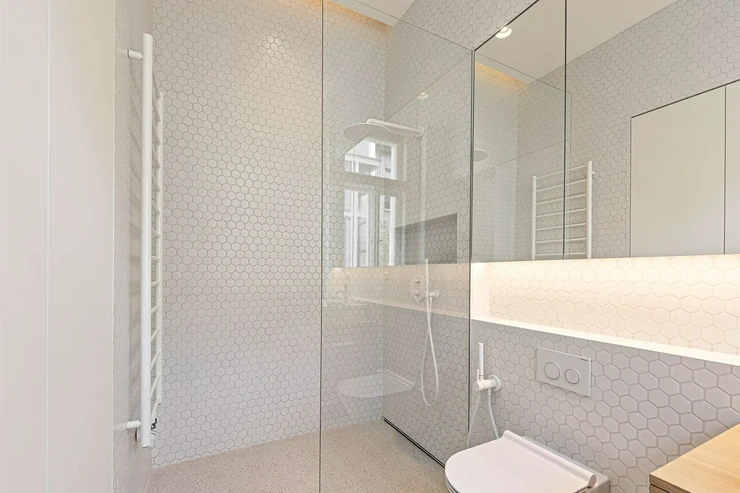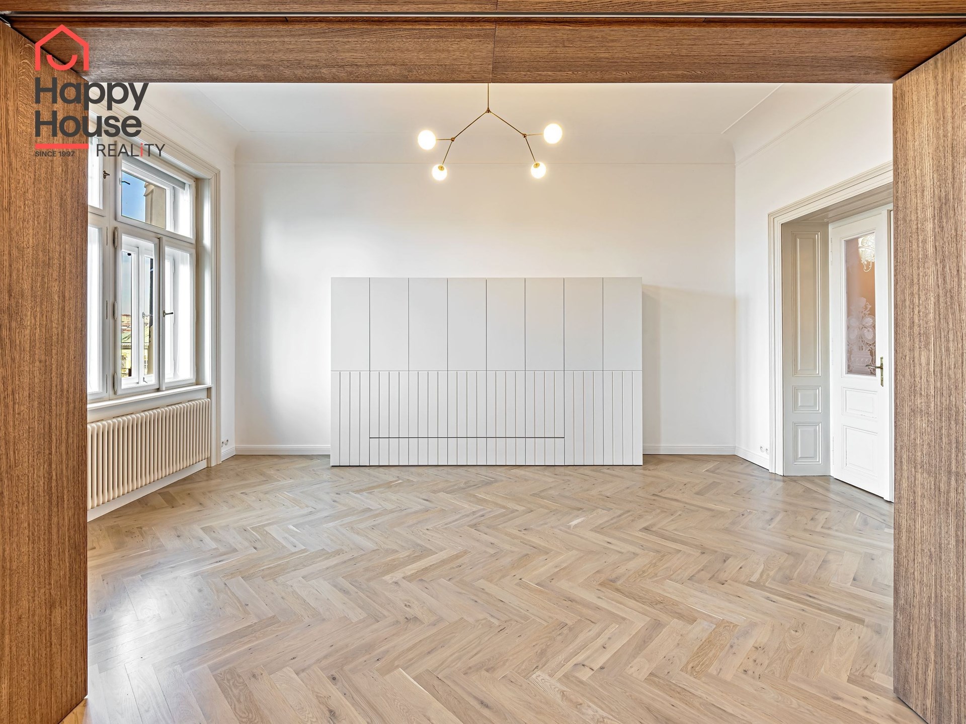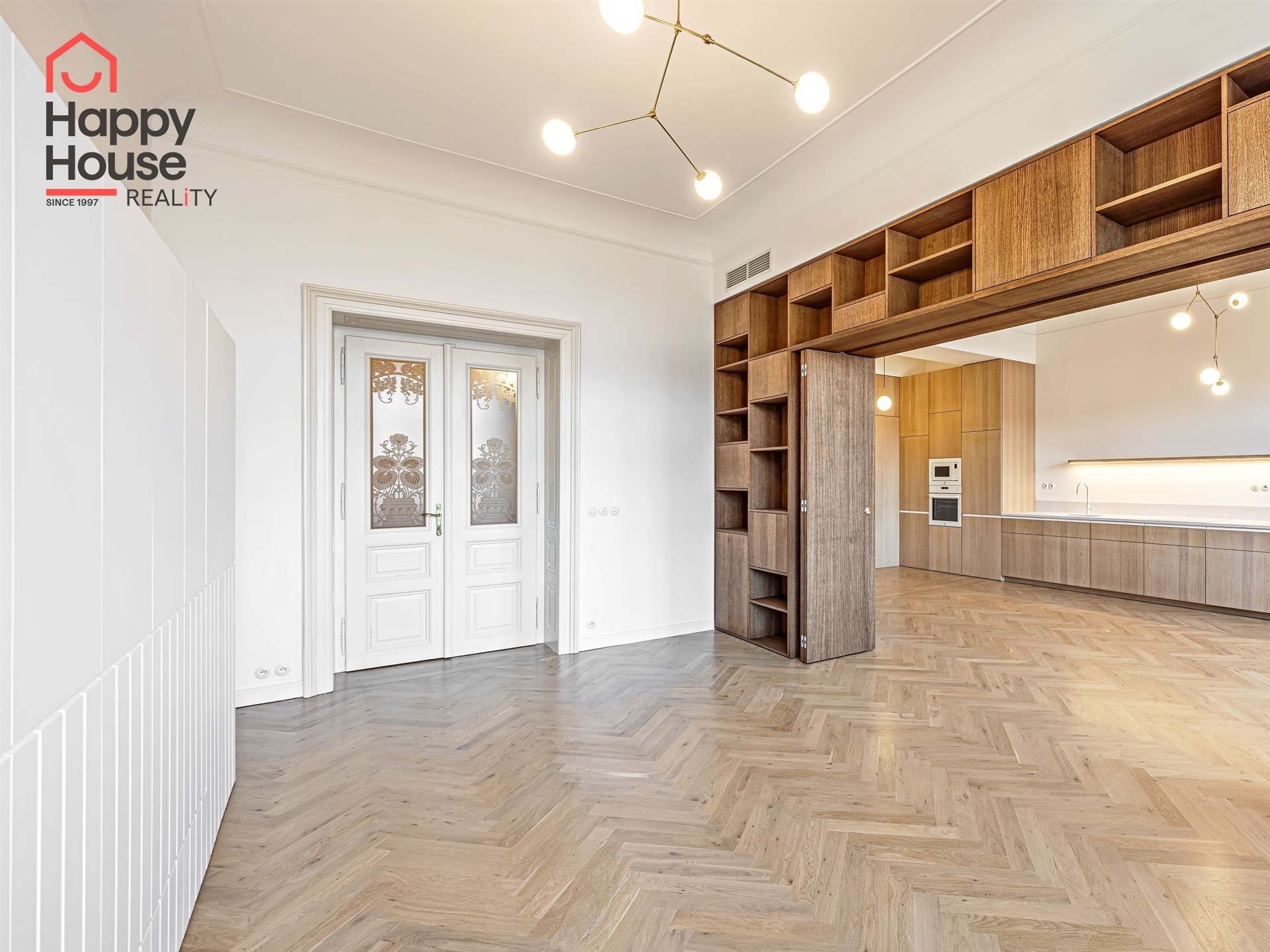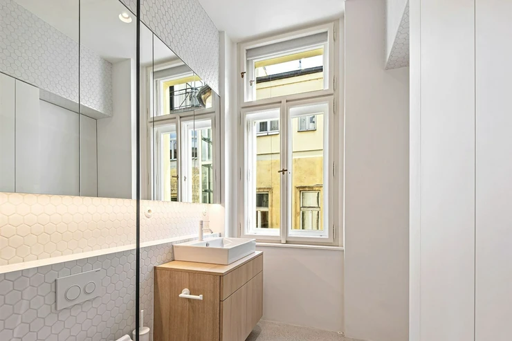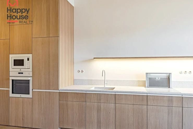 We offer for long-term lease a completely newly renovated two-bedroom apartment with an area of 112.5 sqm and high ceilings, located on the 5th floor of a renovated Art Nouveau building with an elevator on the embankment in Prague 1, New Town. You will be the first tenant in this apartment. From the large wooden double-glazed casement windows, there is a beautiful view of the Vltava River, Prague Castle, and Petřin. The apartment features high-quality, superior materials. The interior offers a spacious kitchen with a dining area, which can be separated thanks to a wooden partition or connected to the living room, where there is currently a fold-down bed for guests, but can be removed upon agreement. Additionally, there is a main bedroom with built-in wardrobe and en-suite bathroom (shower, toilet with bidet shower), a second bedroom/study with built-in wardrobes, 2 separate bathrooms (large bathtub, toilet with bidet shower / shower, toilet with bidet shower), and an entrance hall with additional built-in storage space. The bedrooms face a quiet courtyard. The kitchen is equipped with all necessary appliances – refrigerator with freezer, induction ceramic hob, electric oven, dishwasher, and extractor hood. For wine lovers, there is a special wine fridge. A washing machine is available. The floors are wooden and poured terrazzo. Electric boiler in the apartment. Videophone. Alarm. The apartment includes a cellar cubicle. This is a quiet house with no short-term rentals. Street parking - zones.