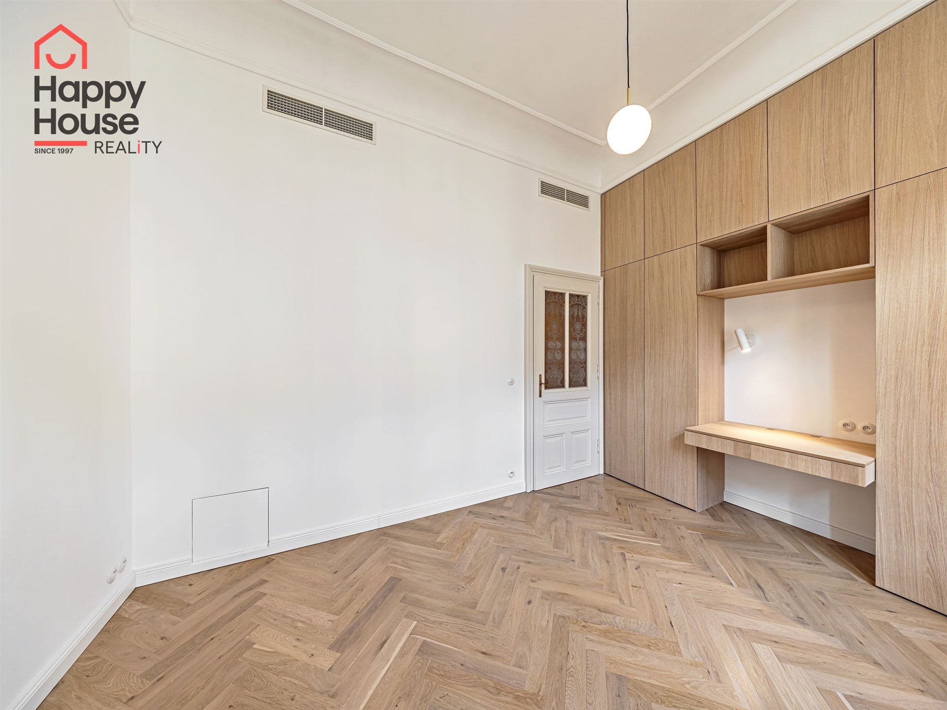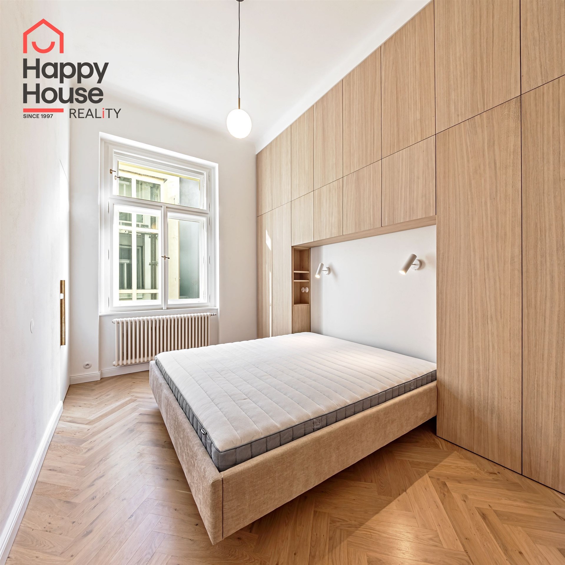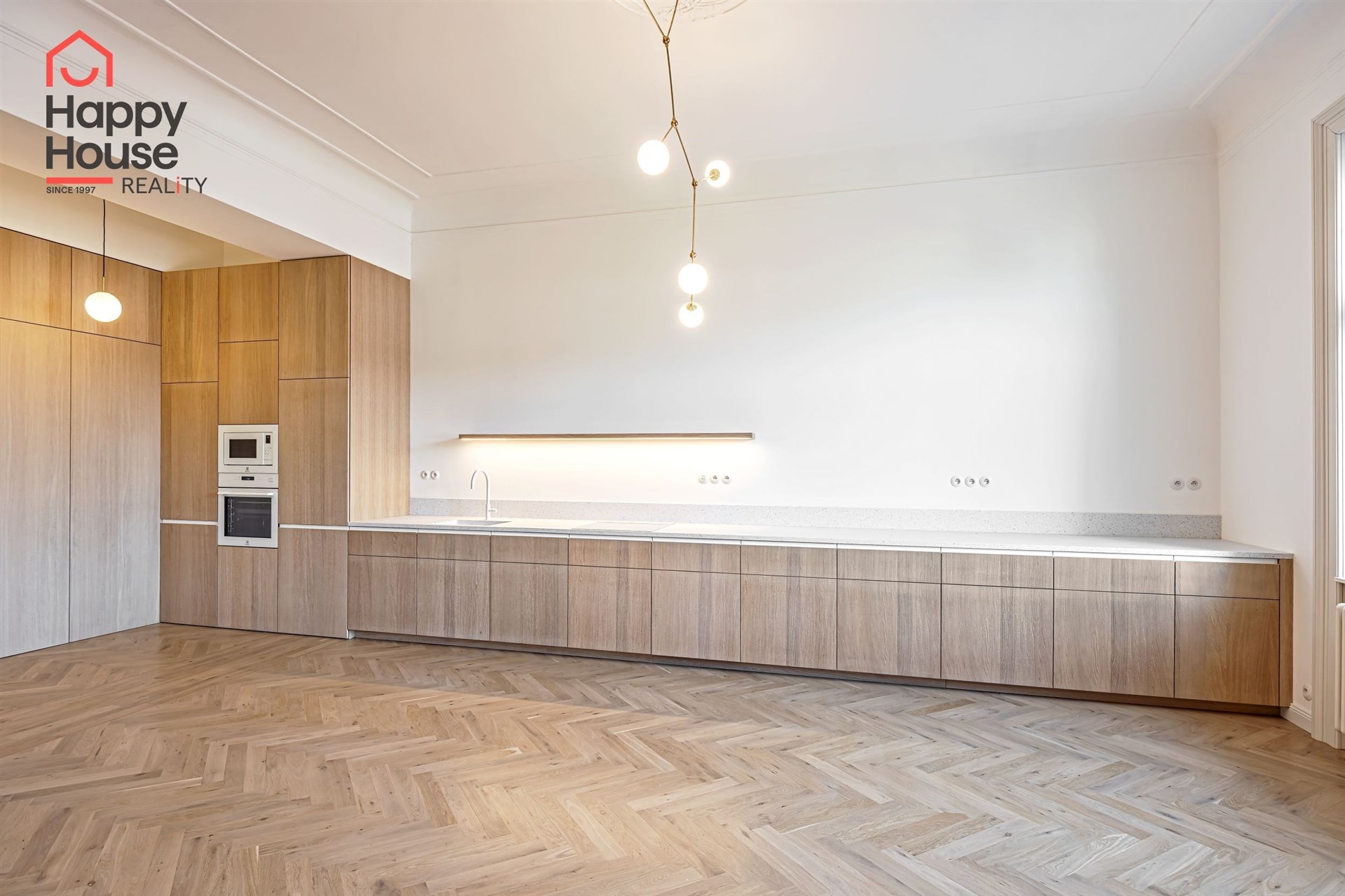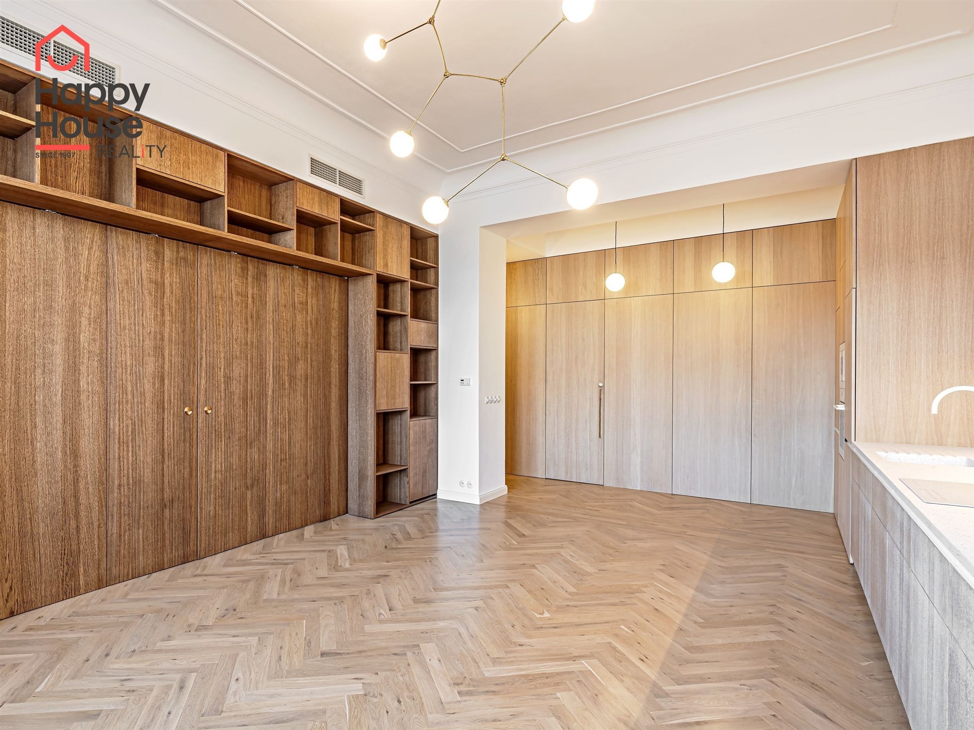 We offer for long-term lease a completely newly renovated two-bedroom apartment with an area of 112.5 sqm and high ceilings, located on the 5th floor of a renovated Art Nouveau building with an elevator on the embankment in Prague 1, New Town. You will be the first tenant in this apartment. From the large wooden double-glazed casement windows, there is a beautiful view of the Vltava River, Prague Castle, and Petřin. The apartment features high-quality, superior materials. The interior offers a spacious kitchen with a dining area, which can be separated thanks to a wooden partition or connected to the living room, where there is currently a fold-down bed for guests, but can be removed upon agreement. Additionally, there is a main bedroom with built-in wardrobe and en-suite bathroom (shower, toilet with bidet shower), a second bedroom/study with built-in wardrobes, 2 separate bathrooms (large bathtub, toilet with bidet shower / shower, toilet with bidet shower), and an entrance hall with additional built-in storage space. The bedrooms face a quiet courtyard. The kitchen is equipped with all necessary appliances – refrigerator with freezer, induction ceramic hob, electric oven, dishwasher, and extractor hood. For wine lovers, there is a special wine fridge. A washing machine is available. The floors are wooden and poured terrazzo. Electric boiler in the apartment. Videophone. Alarm. The apartment includes a cellar cubicle. This is a quiet house with no short-term rentals. Street parking - zones.