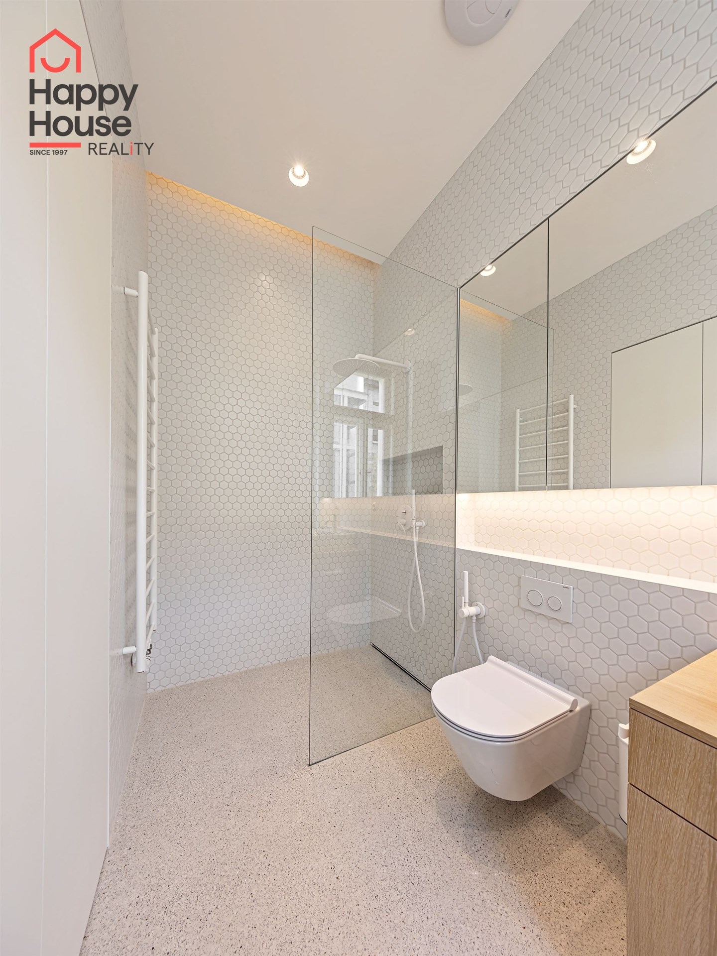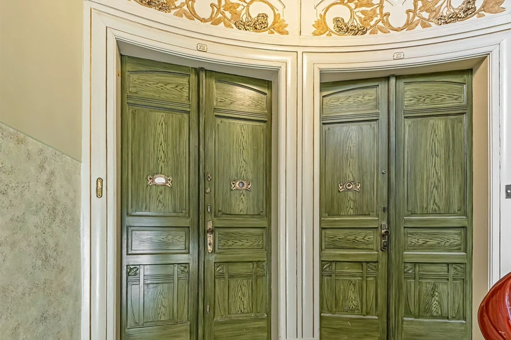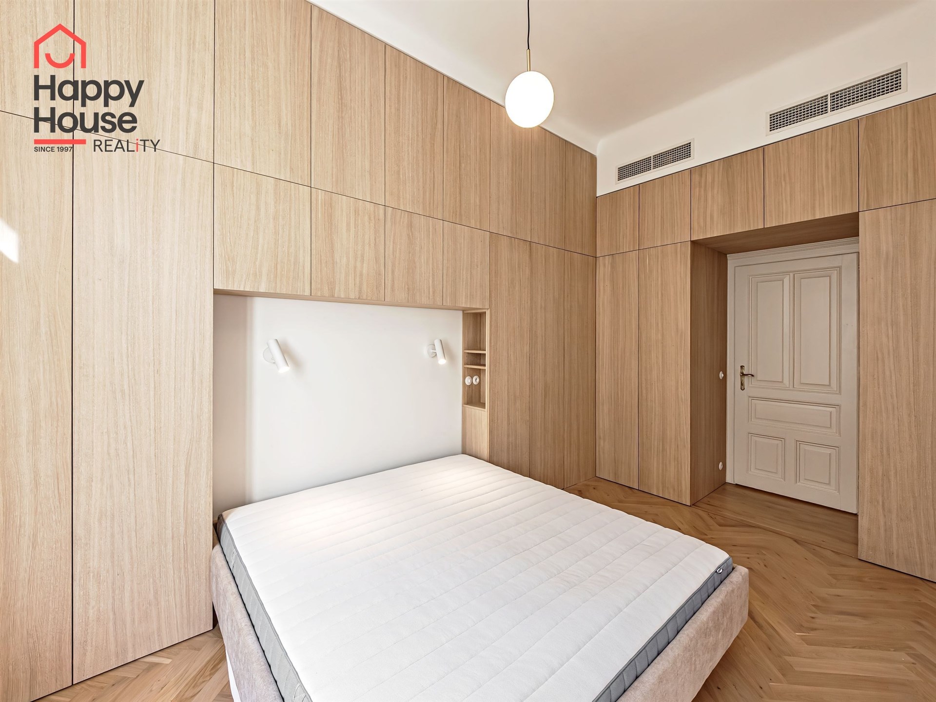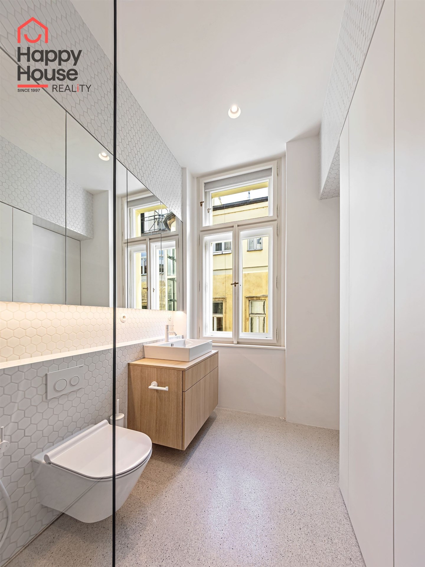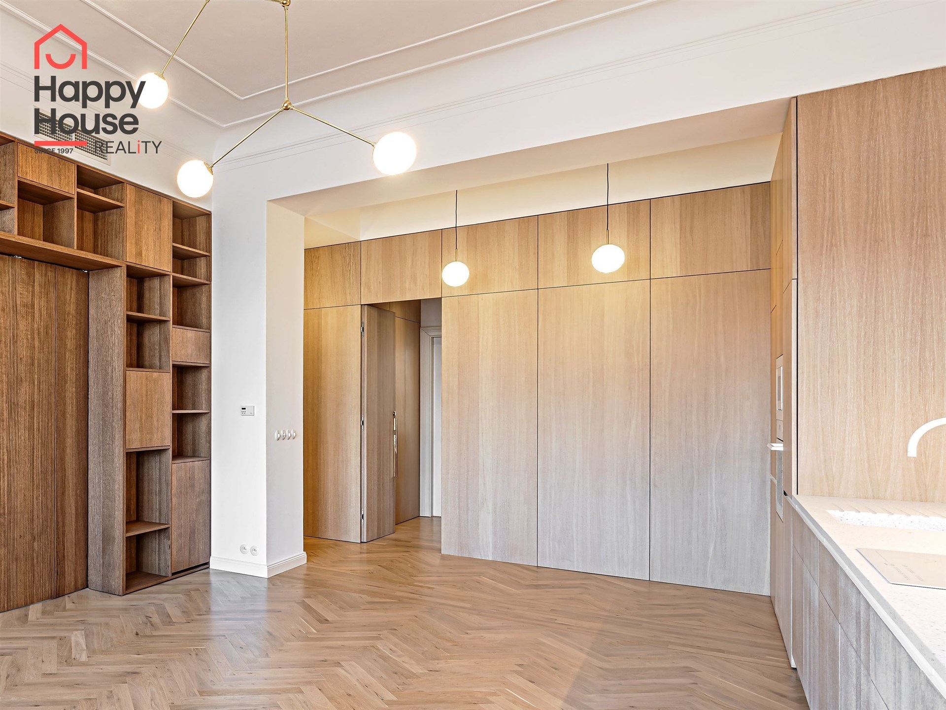 We offer for long-term lease a completely newly renovated two-bedroom apartment with an area of 112.5 sqm and high ceilings, located on the 5th floor of a renovated Art Nouveau building with an elevator on the embankment in Prague 1, New Town. You will be the first tenant in this apartment. From the large wooden double-glazed casement windows, there is a beautiful view of the Vltava River, Prague Castle, and Petřin. The apartment features high-quality, superior materials. The interior offers a spacious kitchen with a dining area, which can be separated thanks to a wooden partition or connected to the living room, where there is currently a fold-down bed for guests, but can be removed upon agreement. Additionally, there is a main bedroom with built-in wardrobe and en-suite bathroom (shower, toilet with bidet shower), a second bedroom/study with built-in wardrobes, 2 separate bathrooms (large bathtub, toilet with bidet shower / shower, toilet with bidet shower), and an entrance hall with additional built-in storage space. The bedrooms face a quiet courtyard. The kitchen is equipped with all necessary appliances – refrigerator with freezer, induction ceramic hob, electric oven, dishwasher, and extractor hood. For wine lovers, there is a special wine fridge. A washing machine is available. The floors are wooden and poured terrazzo. Electric boiler in the apartment. Videophone. Alarm. The apartment includes a cellar cubicle. This is a quiet house with no short-term rentals. Street parking - zones.