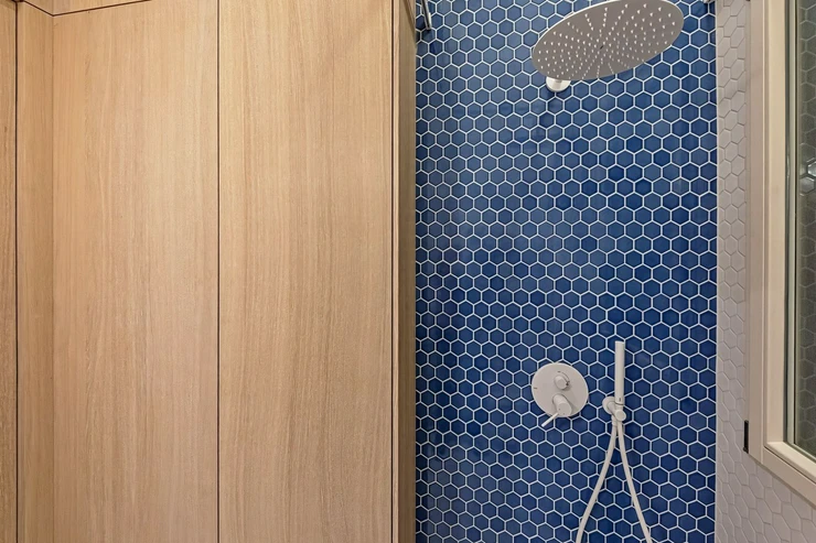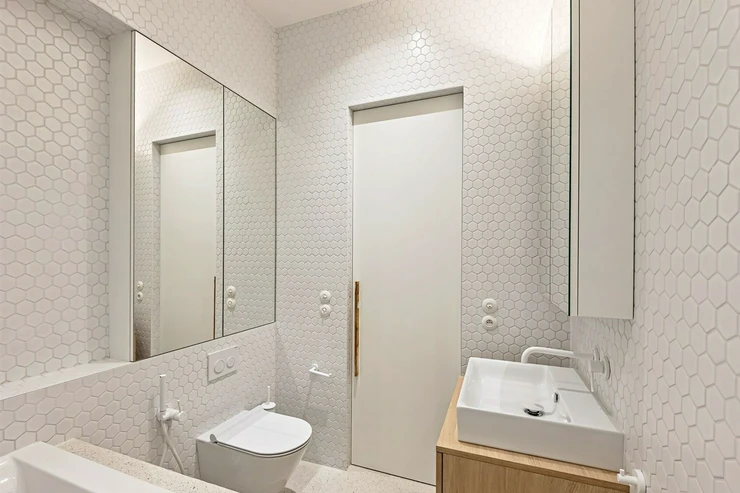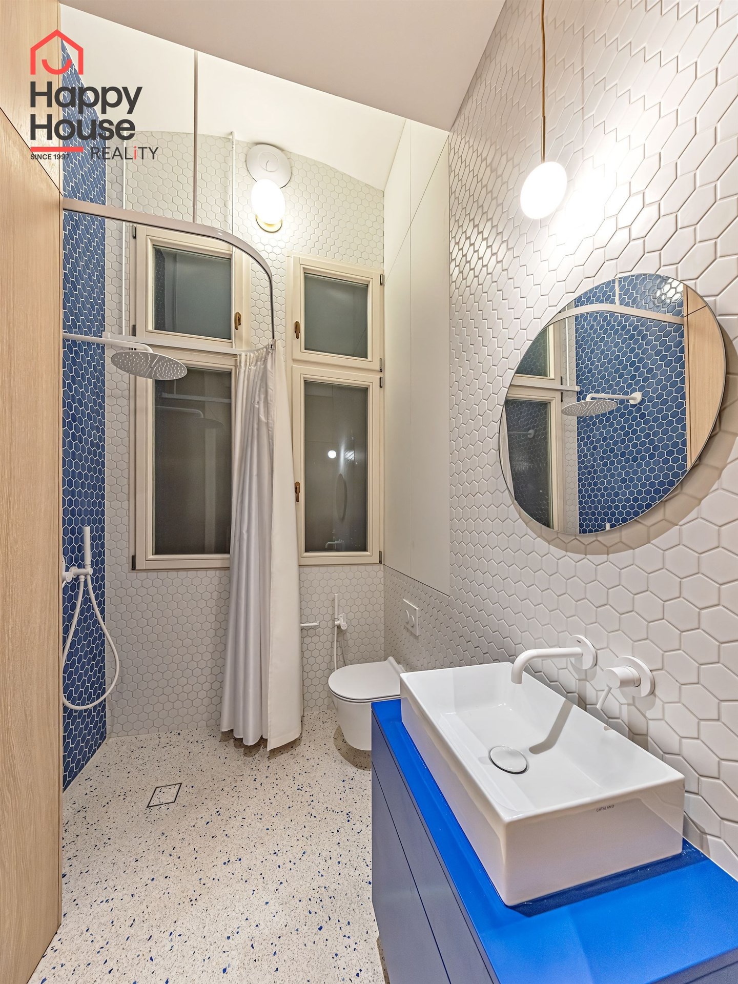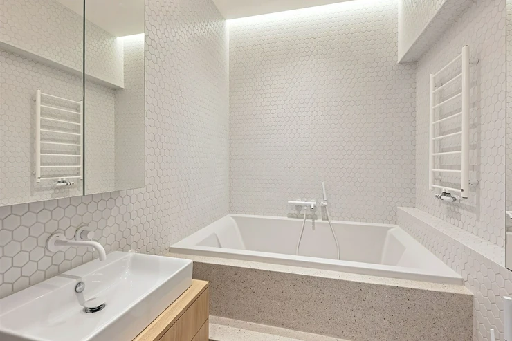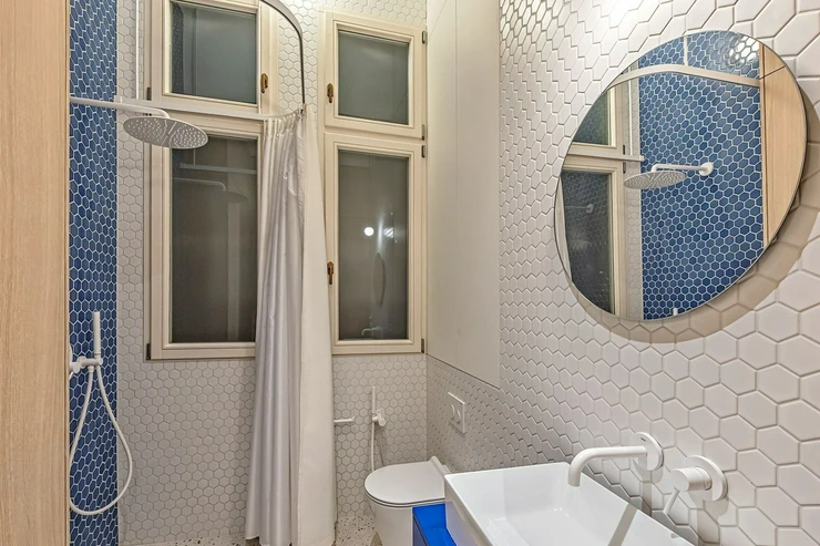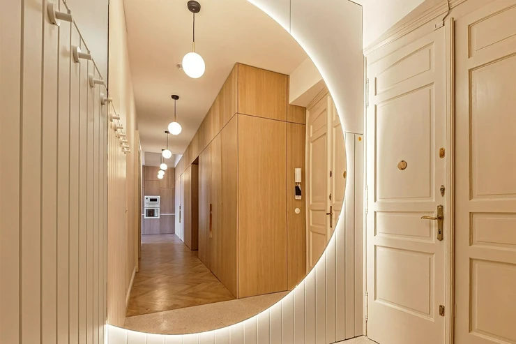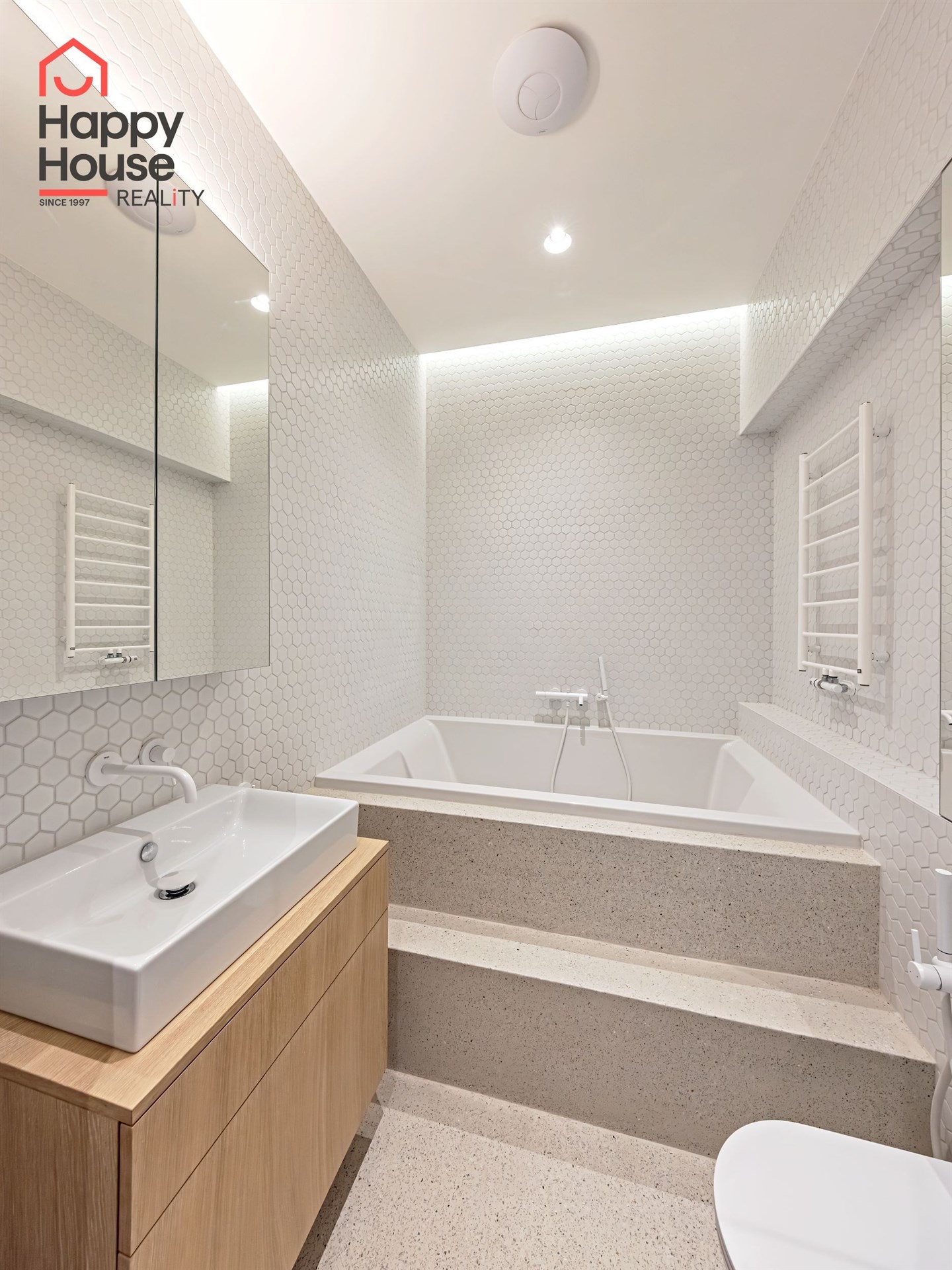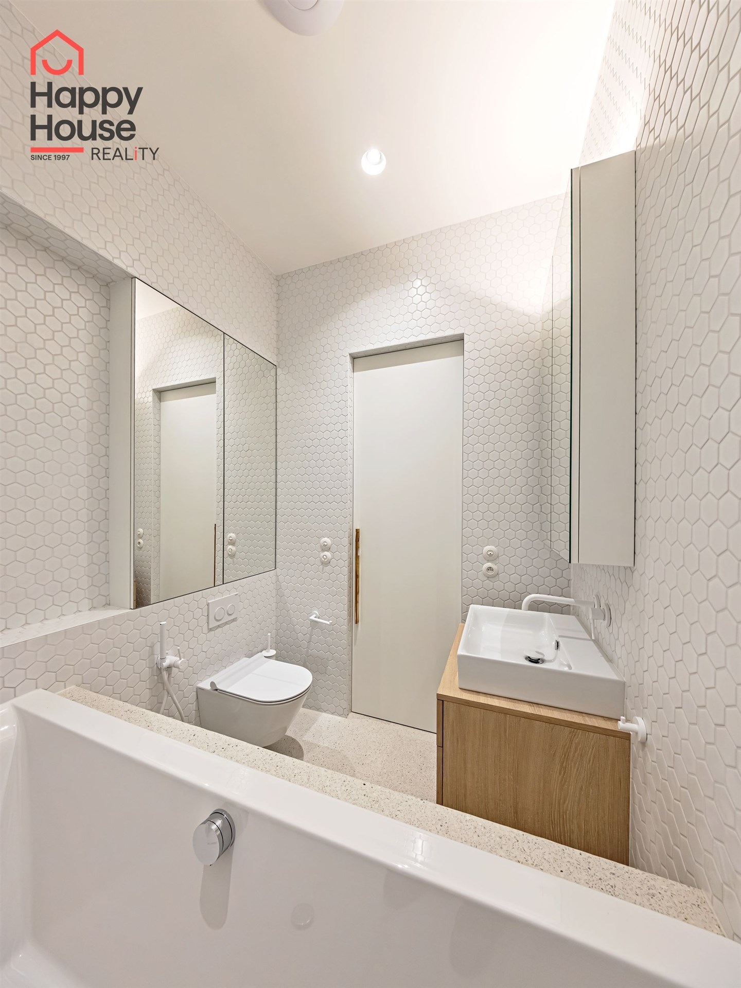 We offer for long-term lease a completely newly renovated two-bedroom apartment with an area of 112.5 sqm and high ceilings, located on the 5th floor of a renovated Art Nouveau building with an elevator on the embankment in Prague 1, New Town. You will be the first tenant in this apartment. From the large wooden double-glazed casement windows, there is a beautiful view of the Vltava River, Prague Castle, and Petřin. The apartment features high-quality, superior materials. The interior offers a spacious kitchen with a dining area, which can be separated thanks to a wooden partition or connected to the living room, where there is currently a fold-down bed for guests, but can be removed upon agreement. Additionally, there is a main bedroom with built-in wardrobe and en-suite bathroom (shower, toilet with bidet shower), a second bedroom/study with built-in wardrobes, 2 separate bathrooms (large bathtub, toilet with bidet shower / shower, toilet with bidet shower), and an entrance hall with additional built-in storage space. The bedrooms face a quiet courtyard. The kitchen is equipped with all necessary appliances – refrigerator with freezer, induction ceramic hob, electric oven, dishwasher, and extractor hood. For wine lovers, there is a special wine fridge. A washing machine is available. The floors are wooden and poured terrazzo. Electric boiler in the apartment. Videophone. Alarm. The apartment includes a cellar cubicle. This is a quiet house with no short-term rentals. Street parking - zones.