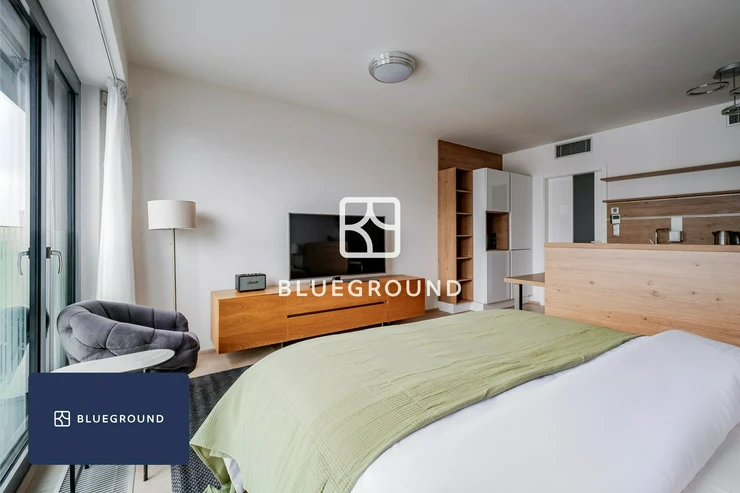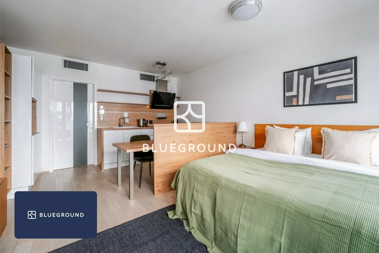 Blueground offers fully furnished and fully equipped apartments for rent starting from one month. This studio apartment with a total area of 35 m² is located in a modern residential complex Garden Towers, in a rapidly developing part of Prague 3 – Žižkov. The apartment is ideal for individuals seeking comfortable, well-connected city living with a contemporary feel.