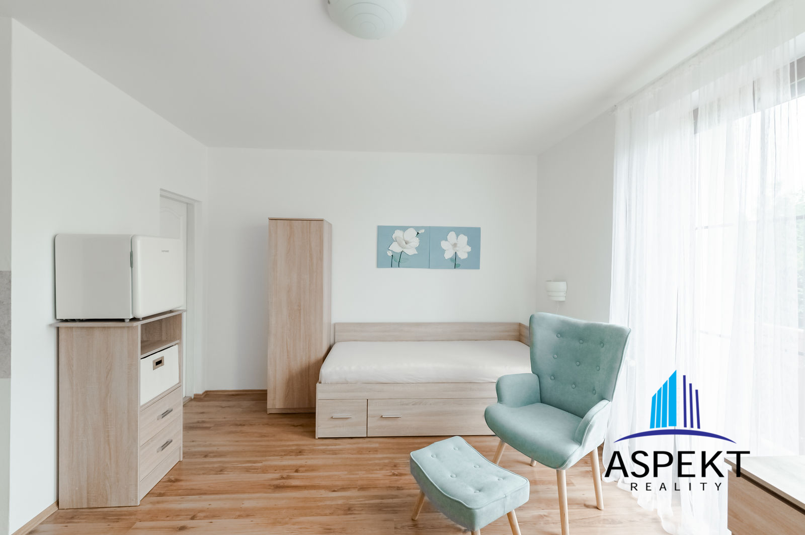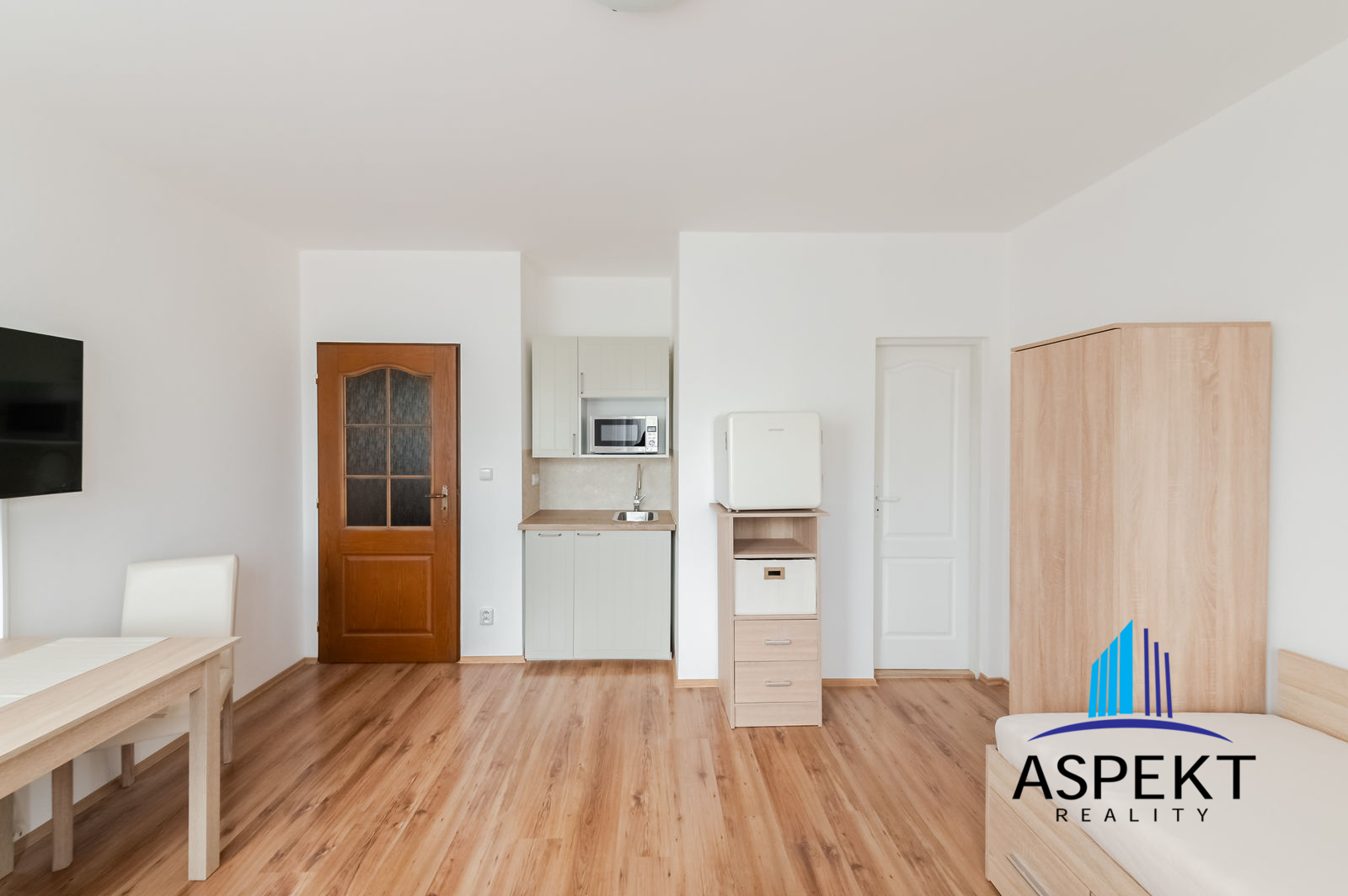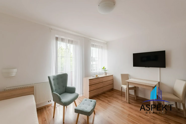 It is equipped with armchair, bed, wardrobe, chest of drawers, TV, small fridge, table and chairs. Basic kitchen is equipped with a sink, microwave, and single cooker. The bathroom has a shower, toilet.