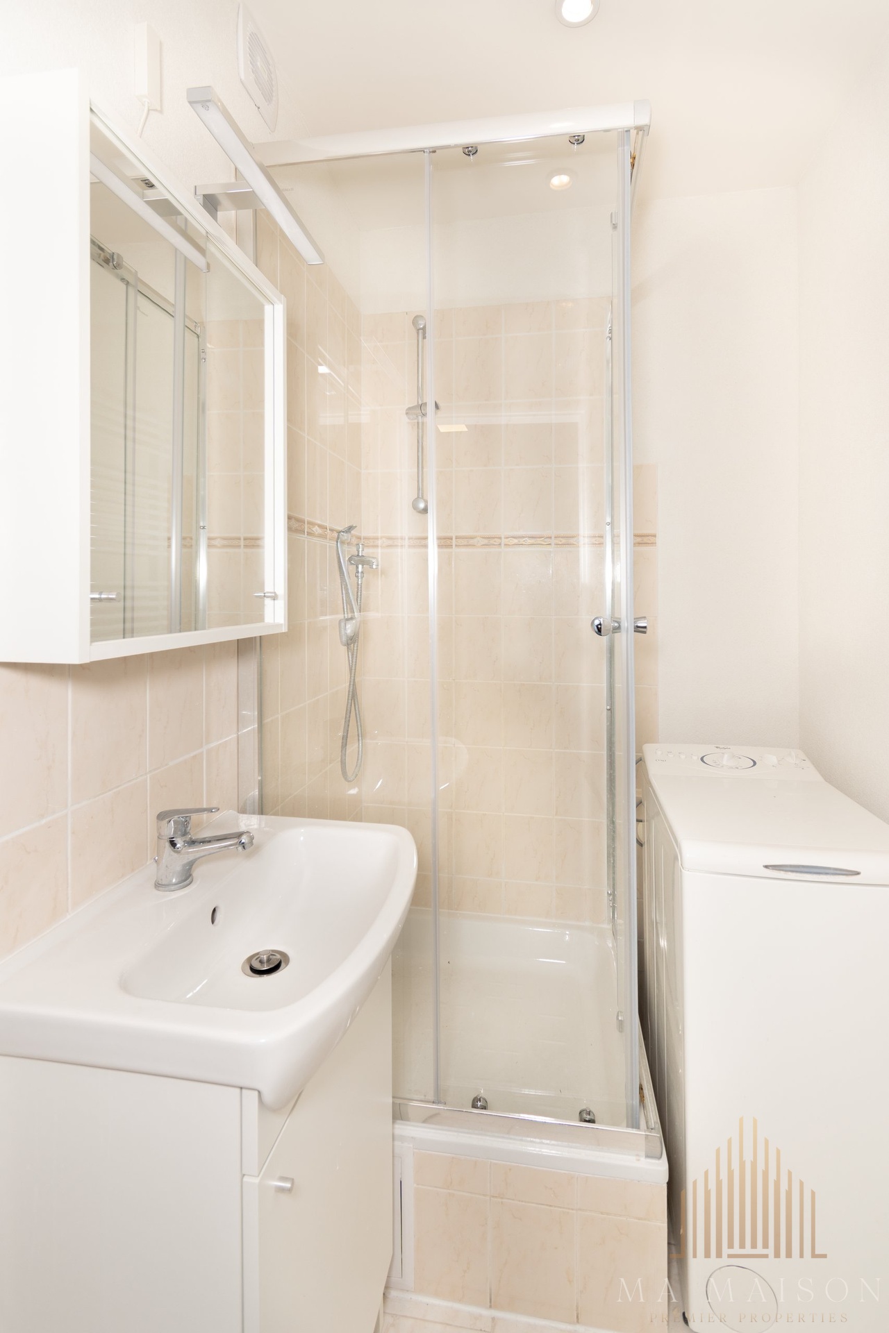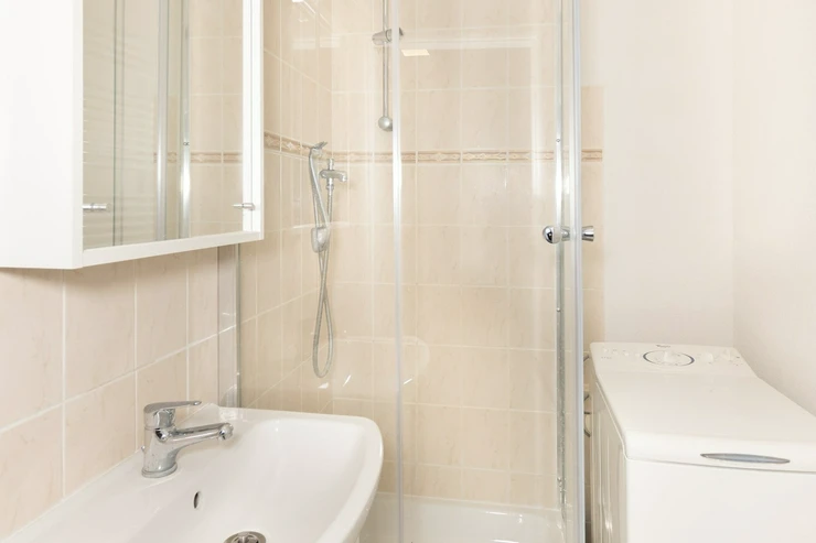 - bathroom with shower, sink with cabinet, mirror, toilet and washing machine.