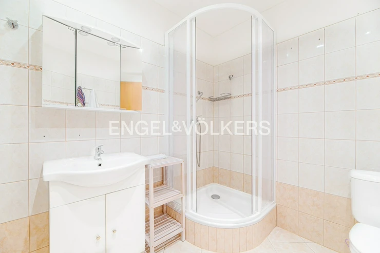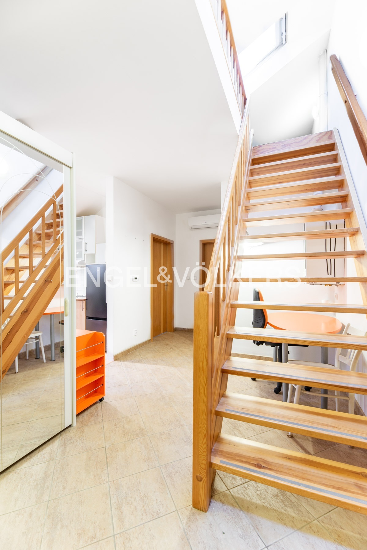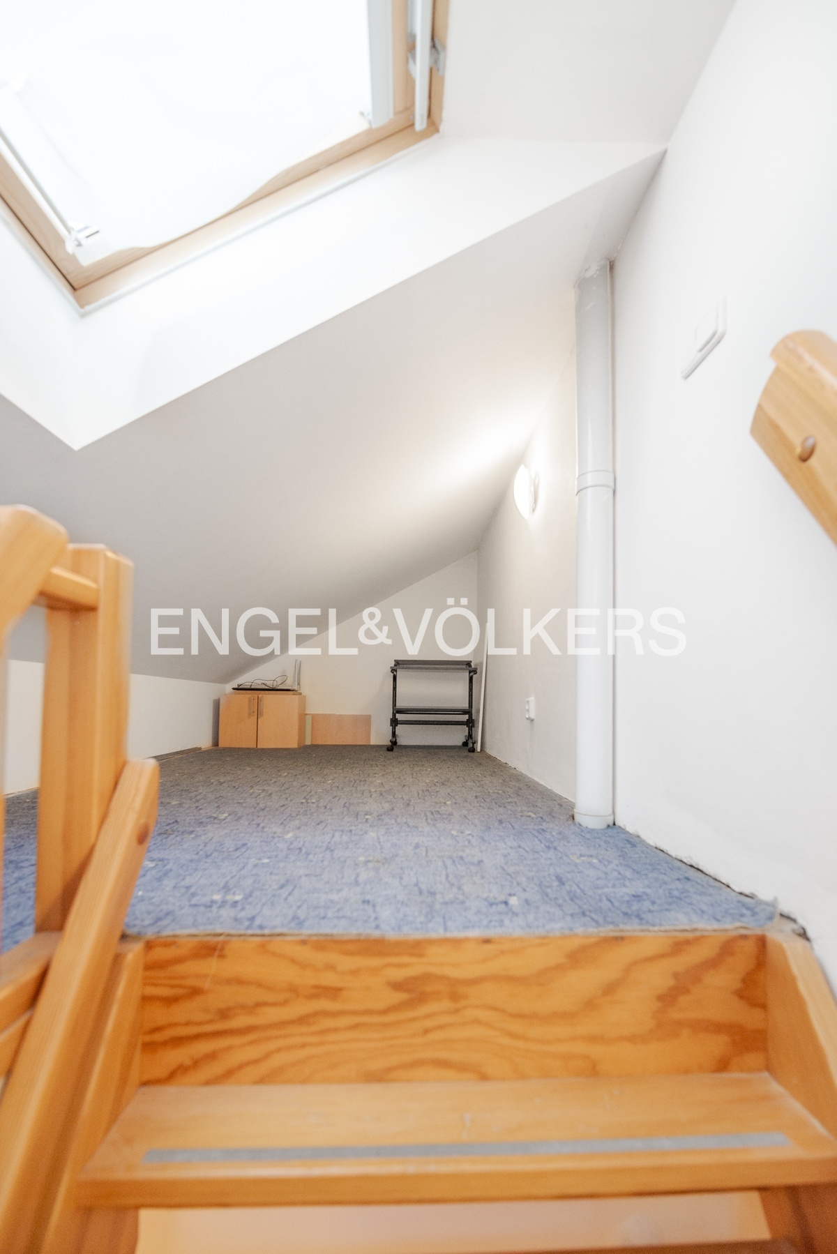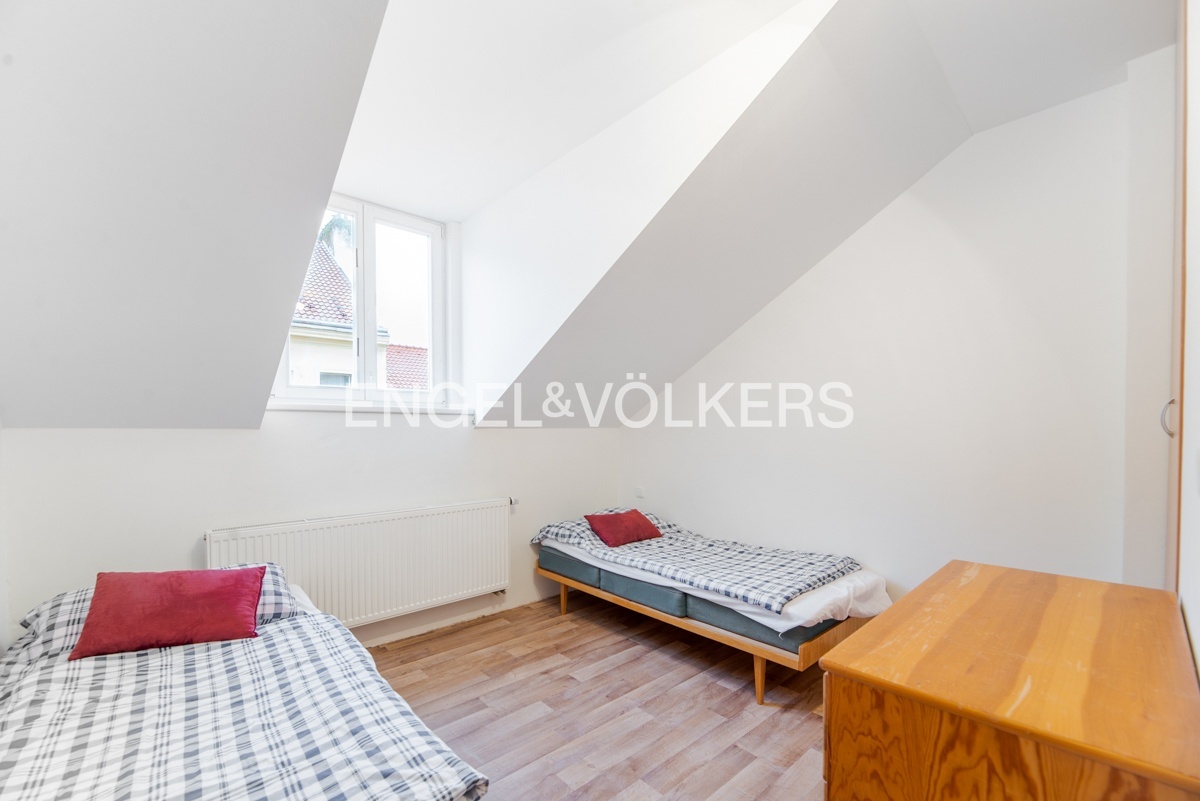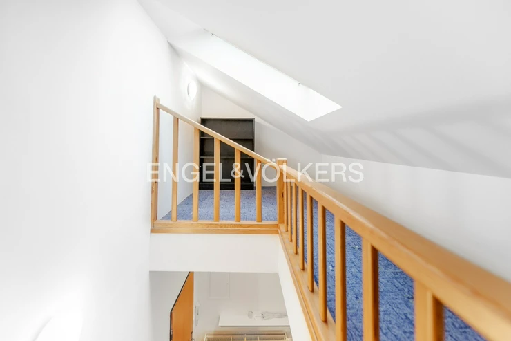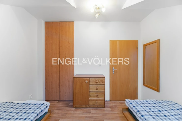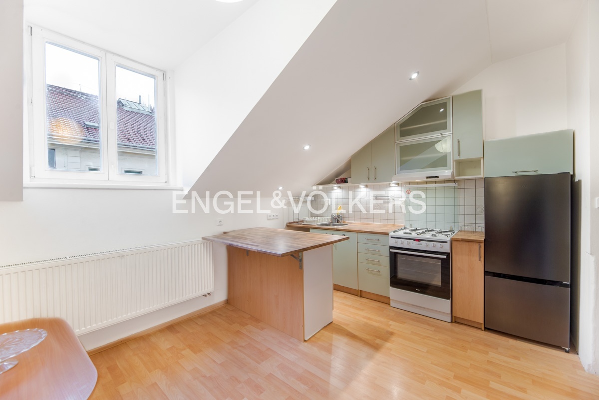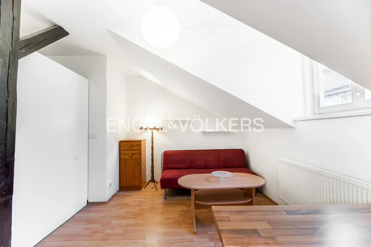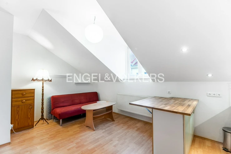 The apartment is located in the attic of an apartment building without an elevator. The apartment has plenty of storage space in the form of built-in wardrobes.