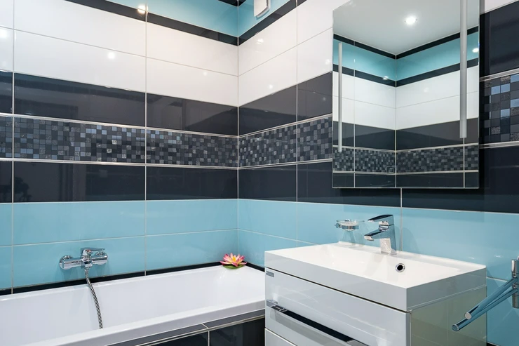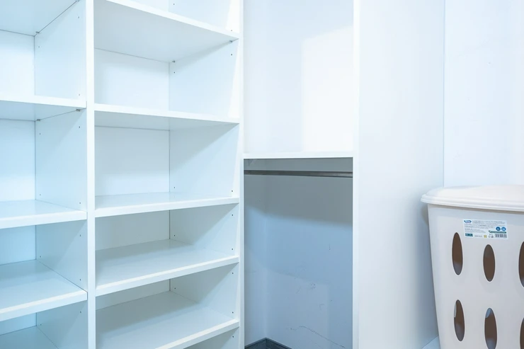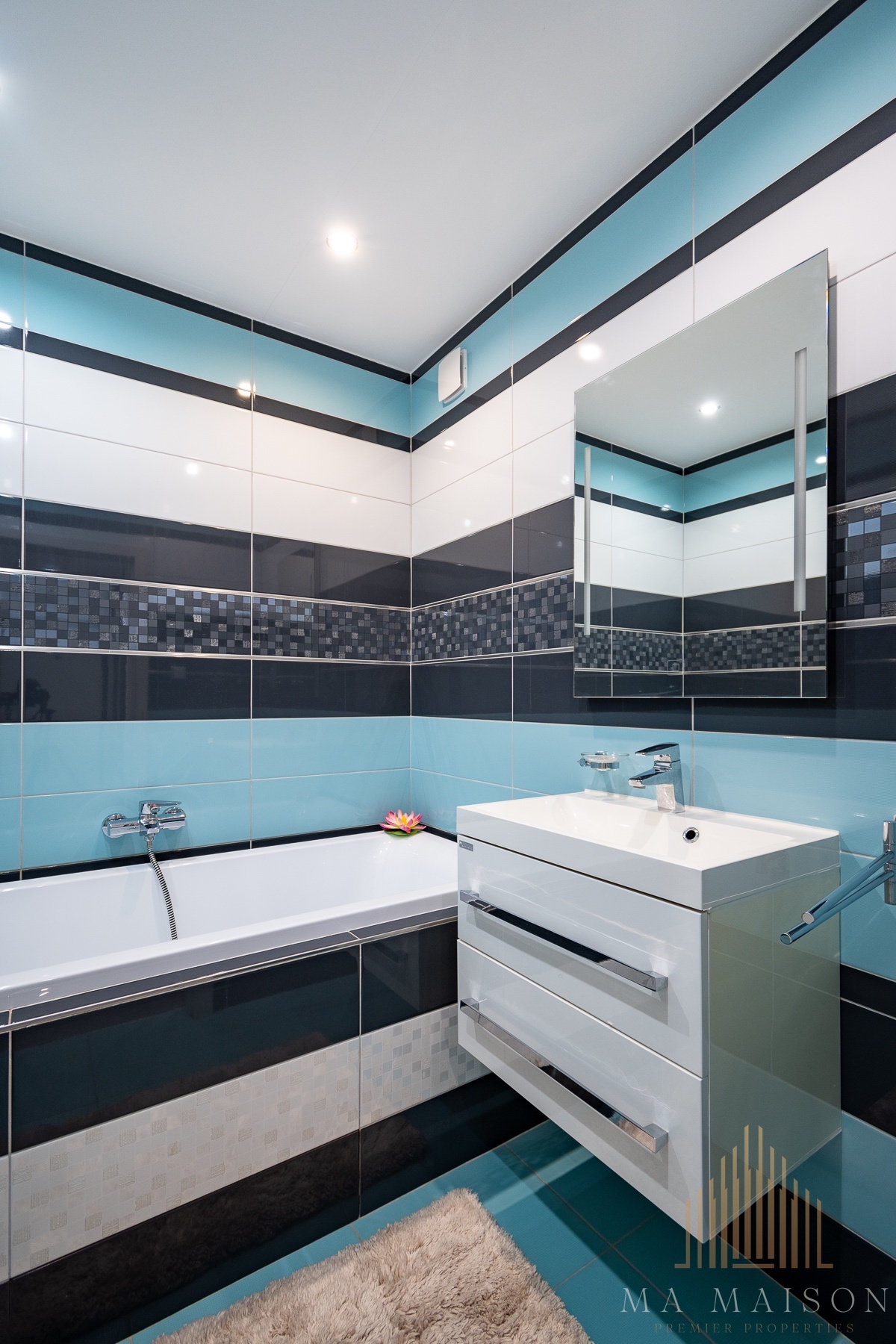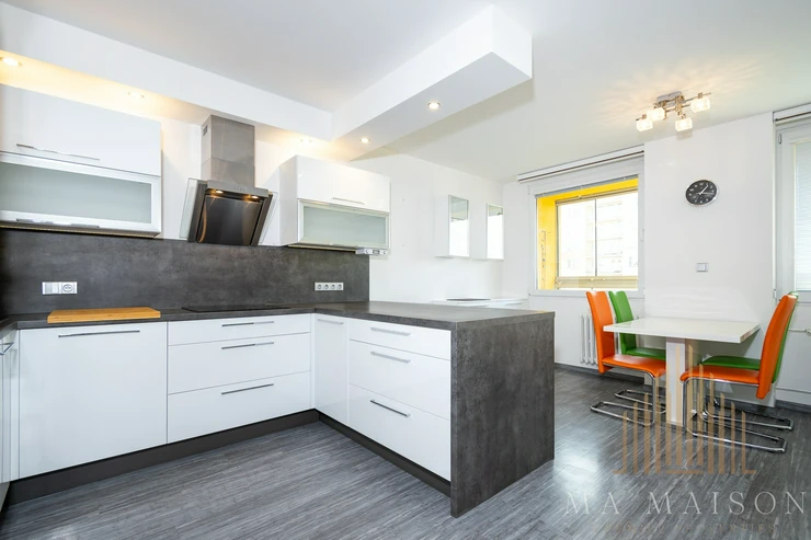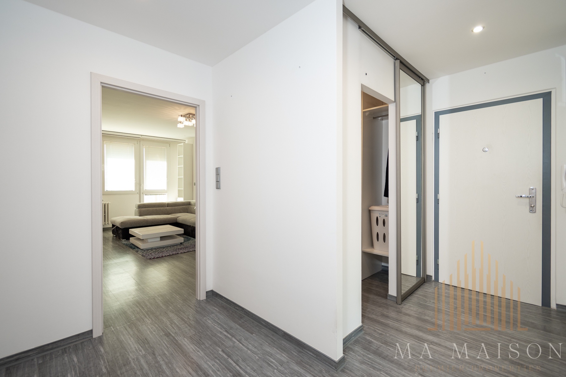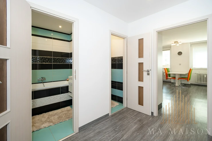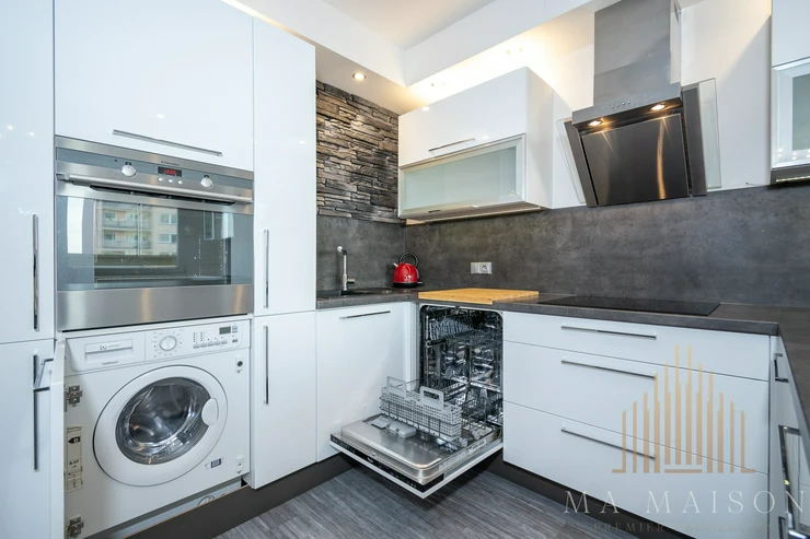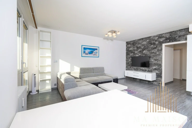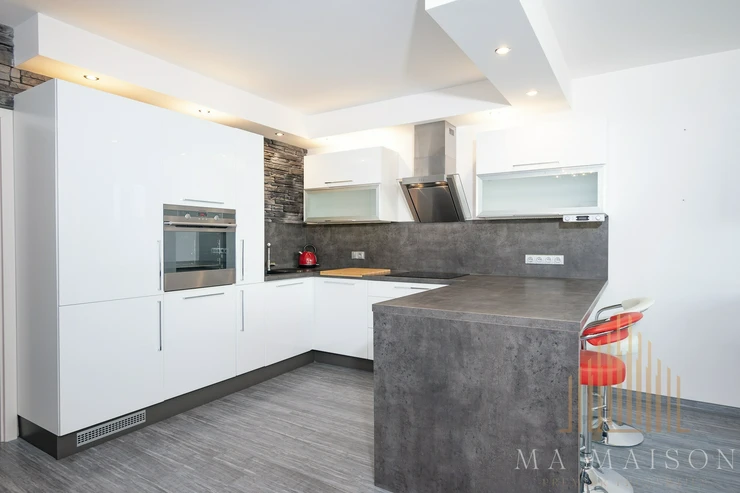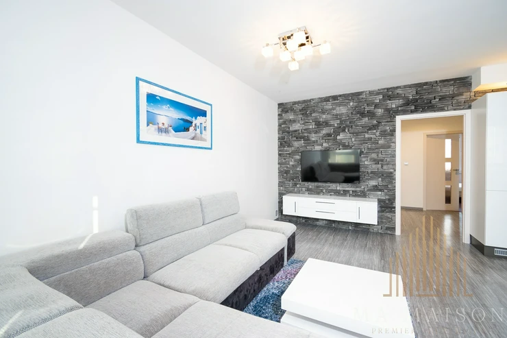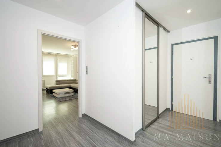 The living room is furnished with a corner sofa which has built-in storage space. There is also a coffee table, TV table and TV. The living room includes a kitchen that is fully furnished including all necessary appliances. There is a hob, oven, fridge/freezer, extractor hood, microwave and washing machine. The line is "U" shaped and has a small bar and two bar stools. The living room also includes a dining table with four dining chairs. The bedroom is furnished with a double bed including mattress and mattress. There are also bedside tables with lamps and a large built-in wardrobe with sliding doors. The adjoining children's room is again fully furnished. There is a sofa bed (2 places possible), wardrobe, chest of drawers, exercise ladders and shelves. The bathroom is equipped with a bathtub, sink with mirror with touch control lighting and shelves. The toilet is separate and located next to the bathroom. All rooms are connected thanks to the hallway, where we find a hidden storage room behind a sliding mirror wall. This closet offers additional storage space with a shelving system.