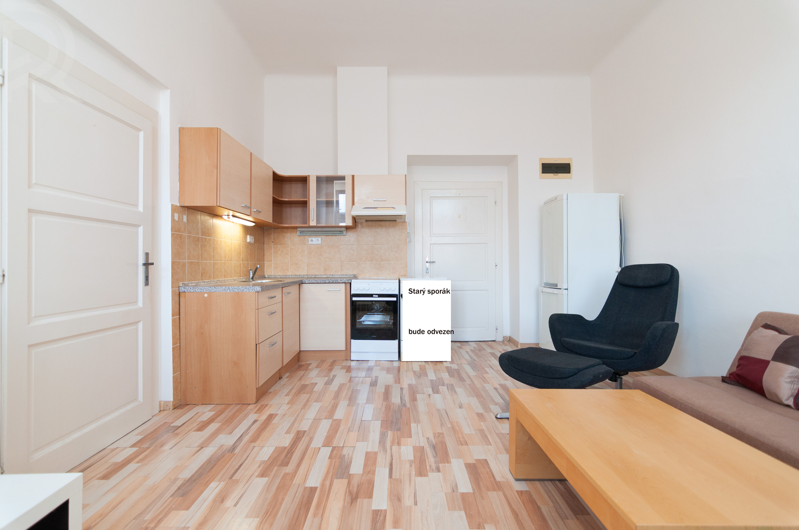 The apartment has a spacious living room connected to the kitchen, through which you can walk to the bedroom and further to the bathroom. The kitchen is equipped with a kitchen unit, electric oven, extractor hood, and freestanding refrigerator.