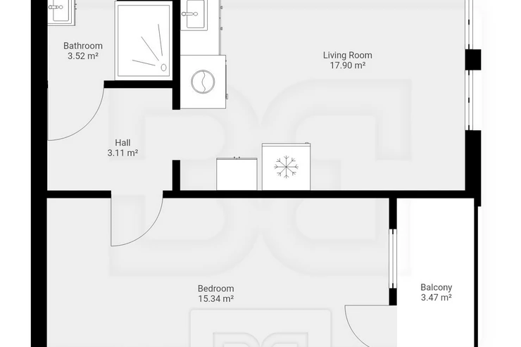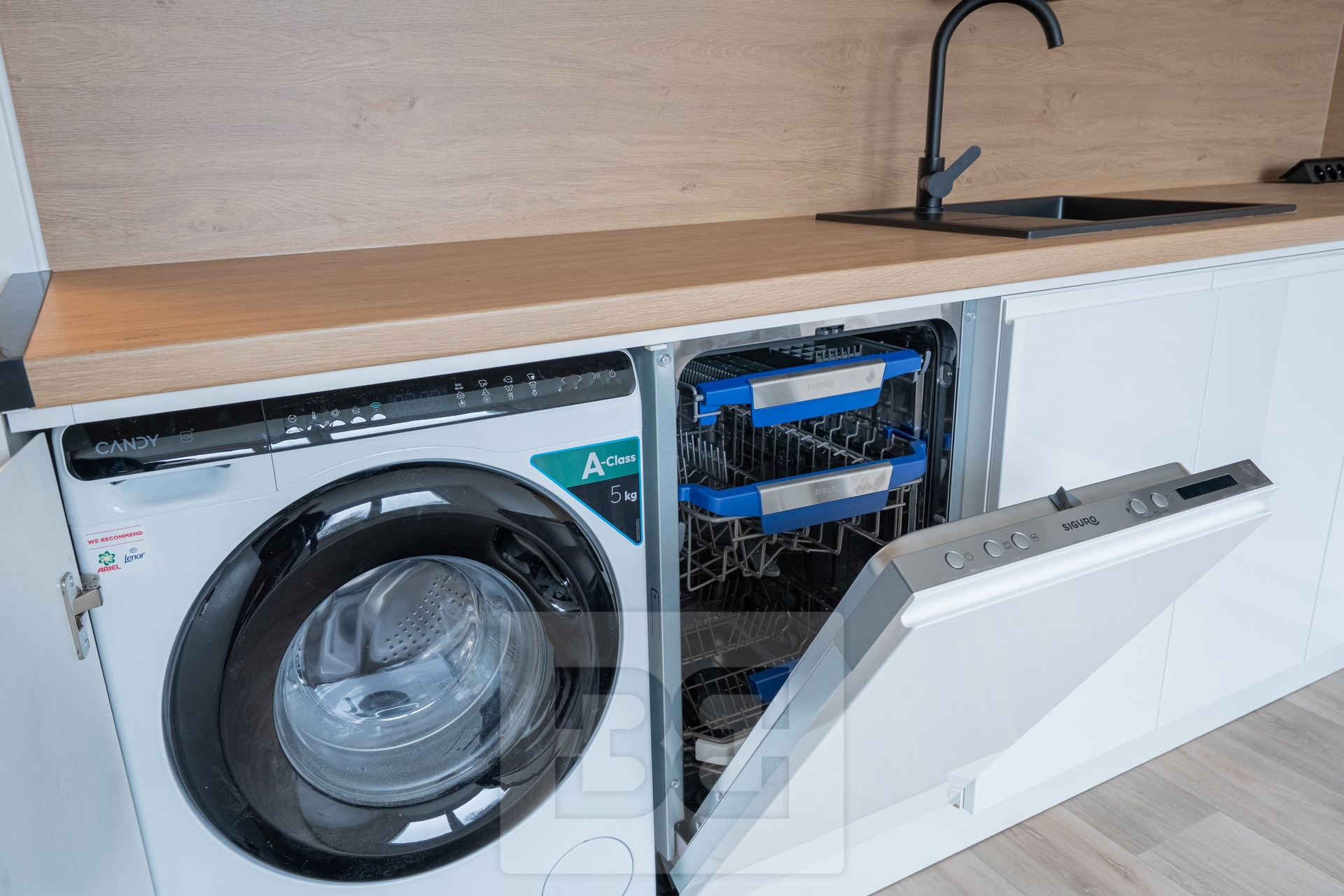 The layout consists of a spacious living room with a kitchenette, a separate bedroom with access to the balcony, and a bathroom. The kitchen is modern and practically designed, equipped with appliances including a dishwasher, refrigerator, washing machine, oven, and induction cooktop.