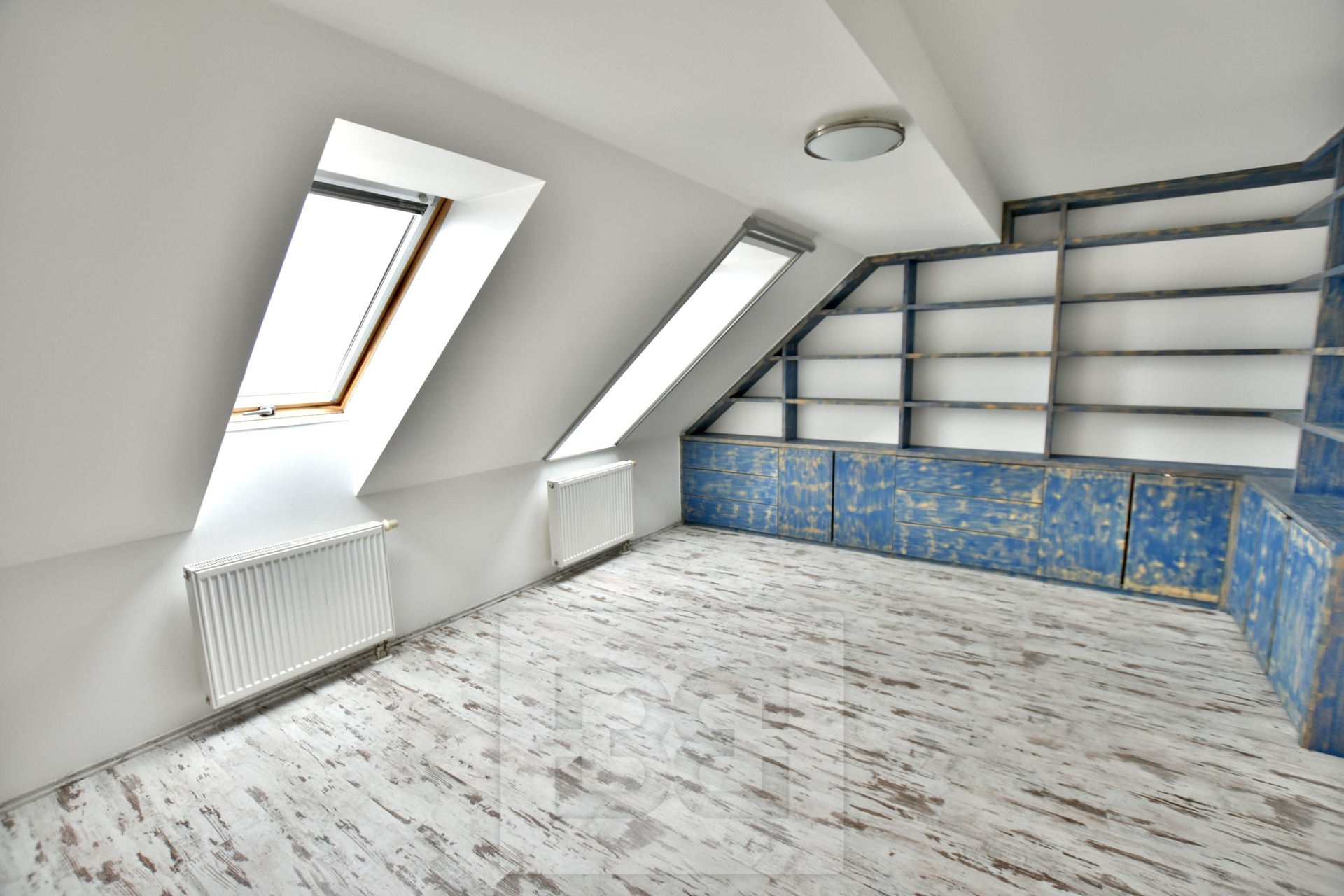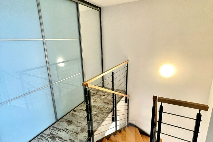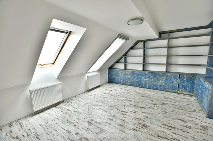 The apt was partly reconstructed in 2011 - troweling and leveling of all floor surfaces (except kitchen), underfloor heating in the kitchen, new door frames, renovation of the internet network (new wiring in the kitchen and bedroom on the second floor), net and blinds on the roof windows in the bedroom on the second floor, where is new spruce library, safety system by Jablotron, which was installed in 2013. Service charges are 5.500,- + electricity consumption.