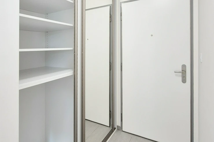 Other equipment of the apartment: a fully fitted kitchen with built-in appliances (electric hob, electric oven, dishwasher, refrigerator with freezer, exhauster), also a built-in wardrobe in the entrance hallway, outside blinds or roller curtains, safety entrance door, videophone, wooden floors, central heating, and cabling for high-speed internet connection (up to 1 Gb/s).