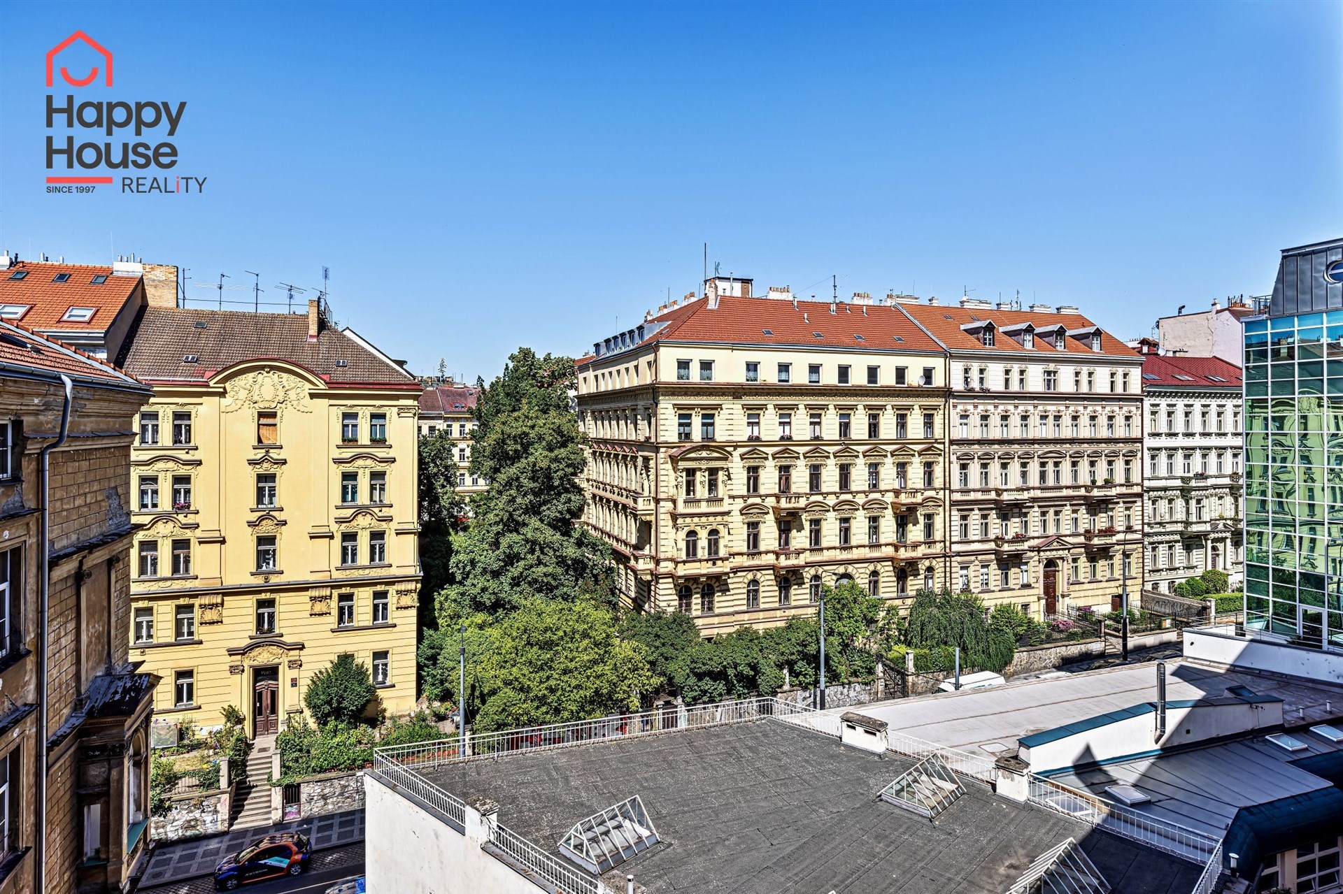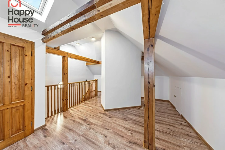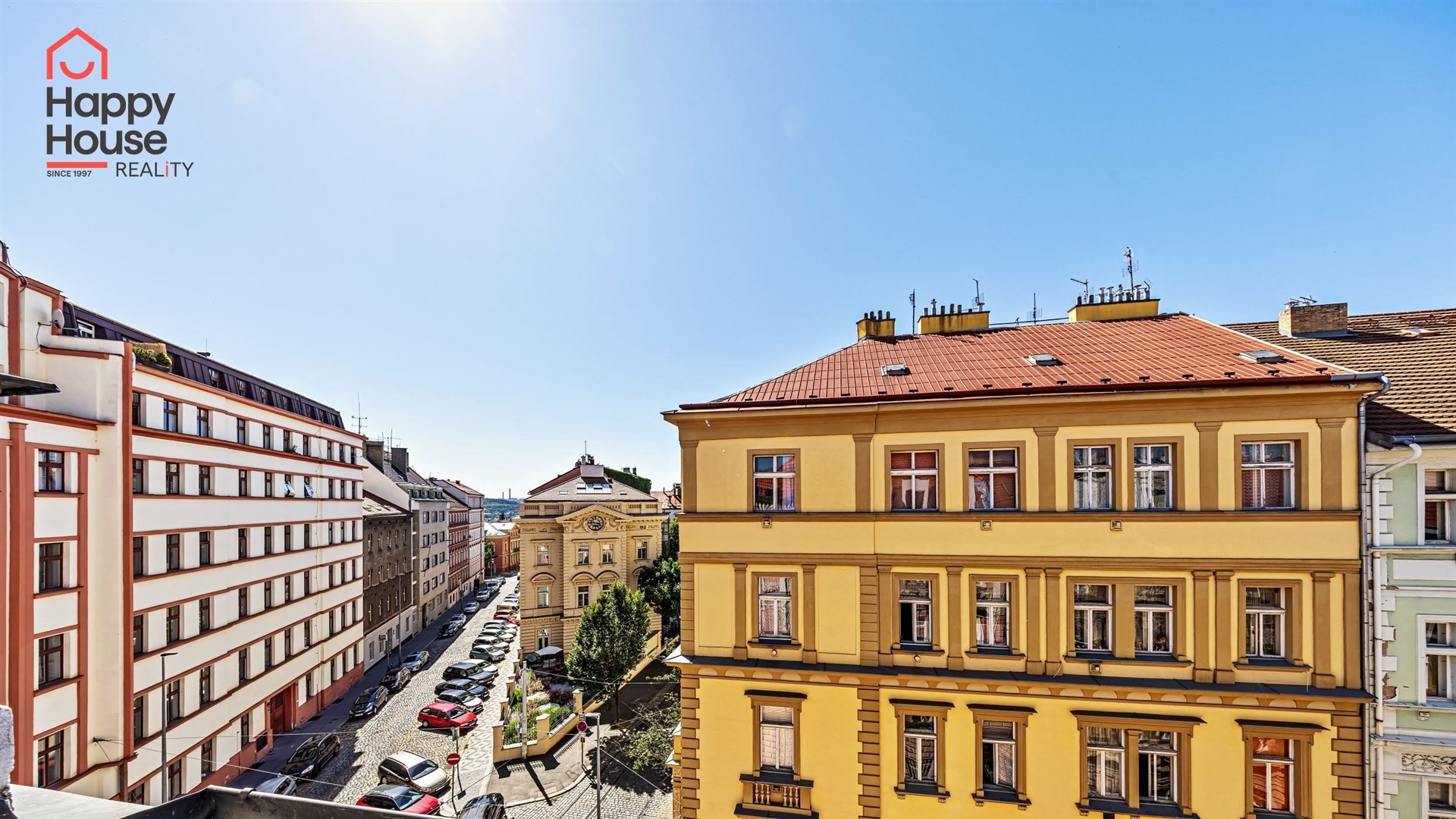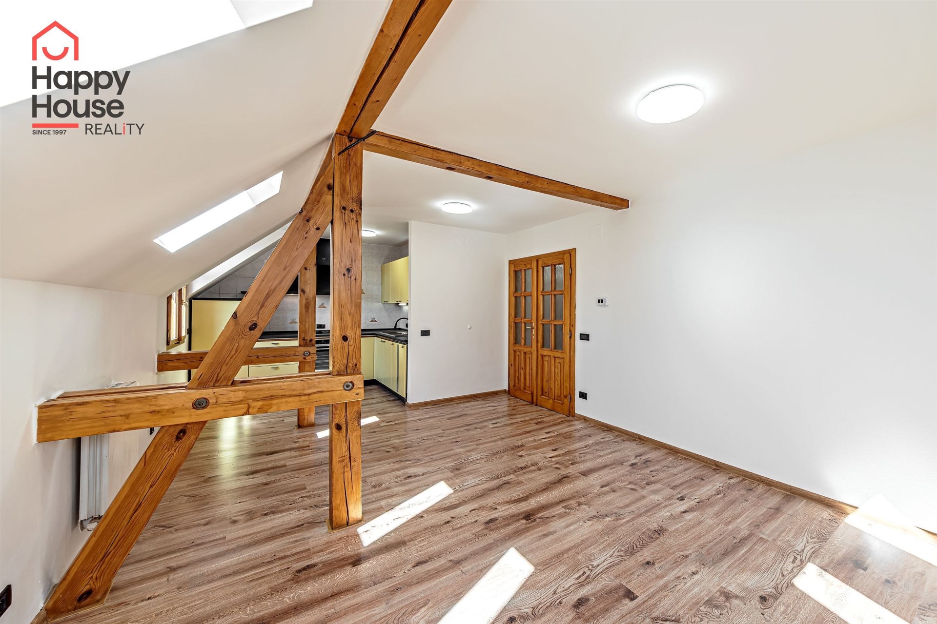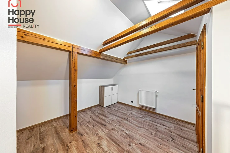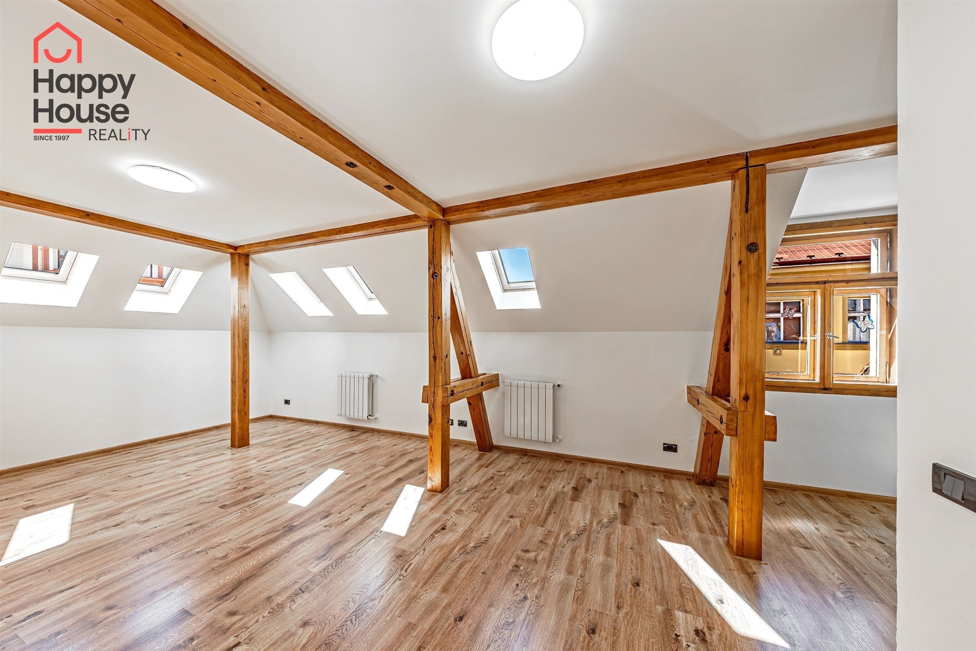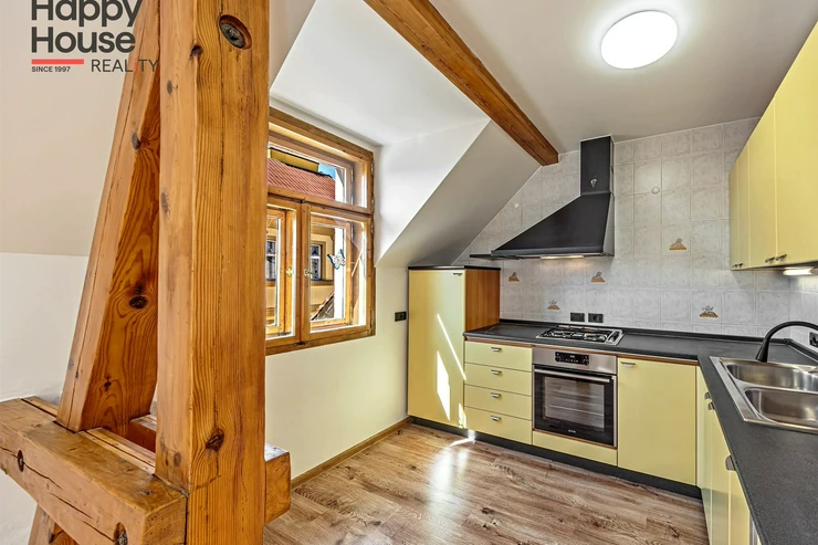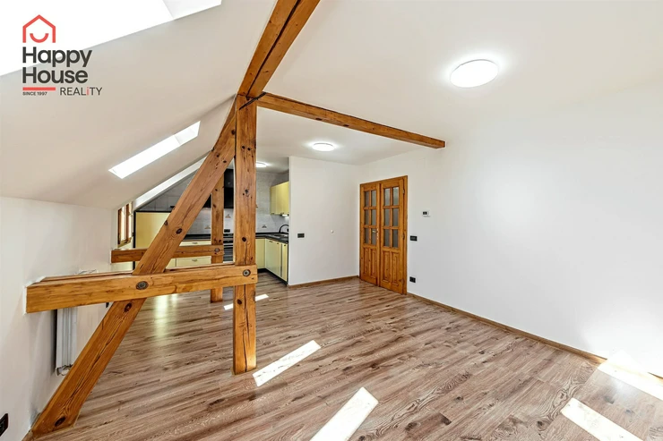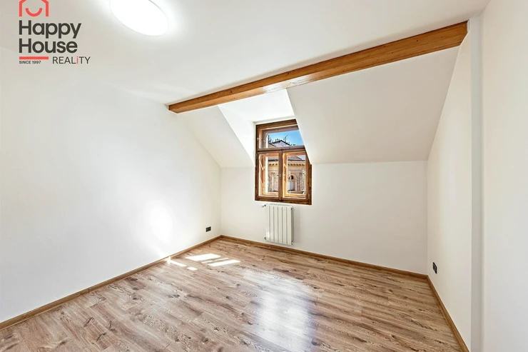 We offer for rent a beautiful, attic, maisonette two-bedroom apartment with an office located on the 5th floor of a brick building with an elevator in a very popular part of Prague 2, Vinohrady. The apartment is unfurnished and offers on the lower floor an entrance hall with staircase, spacious living room with kitchenette, separate bedroom, bathroom (bathtub, bidet, washing machine connection) and separate toilet. Wooden stairs lead to the upper floor, where there is another bedroom in "open space" and a second toilet. The kitchenette has a kitchen unit with built-in appliances - fridge with freezer, ceramic hob, electric oven, and extractor hood. The apartment has a unique atmosphere due to the exposed ceiling and supporting beams. It is also very bright due to the skylights. Telephone connection, internet, and cable TV are available. Laminate floating floors and tiling. Gas boiler in the apartment. Street parking - zones.
