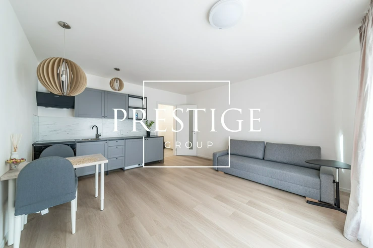 Stylish and fully furnished apartment is located on the 1st floor of a new building. The living area is a sunny room with a kitchen equipped with all appliances. At the same time all the furniture in the room is brand new and is adapted to the comfort of the tenant. The bathroom is equipped with shower, sink, and toilet.