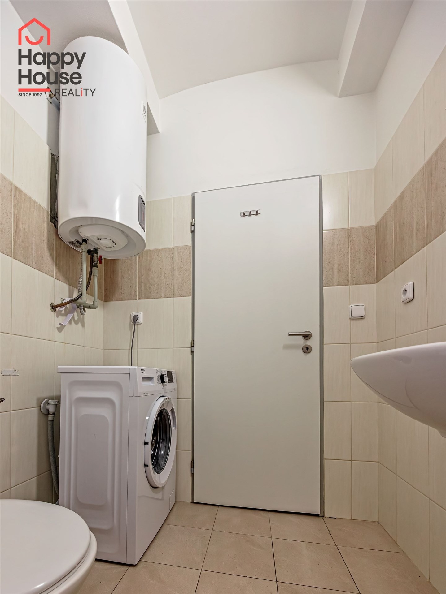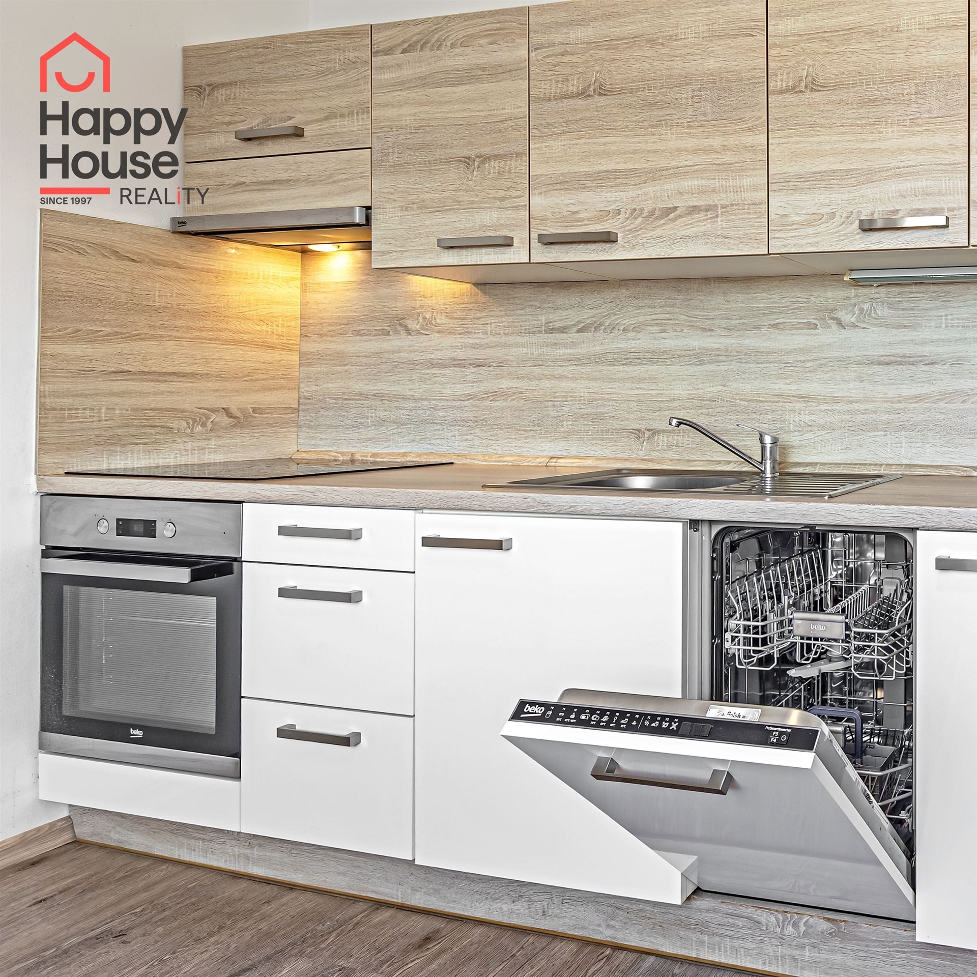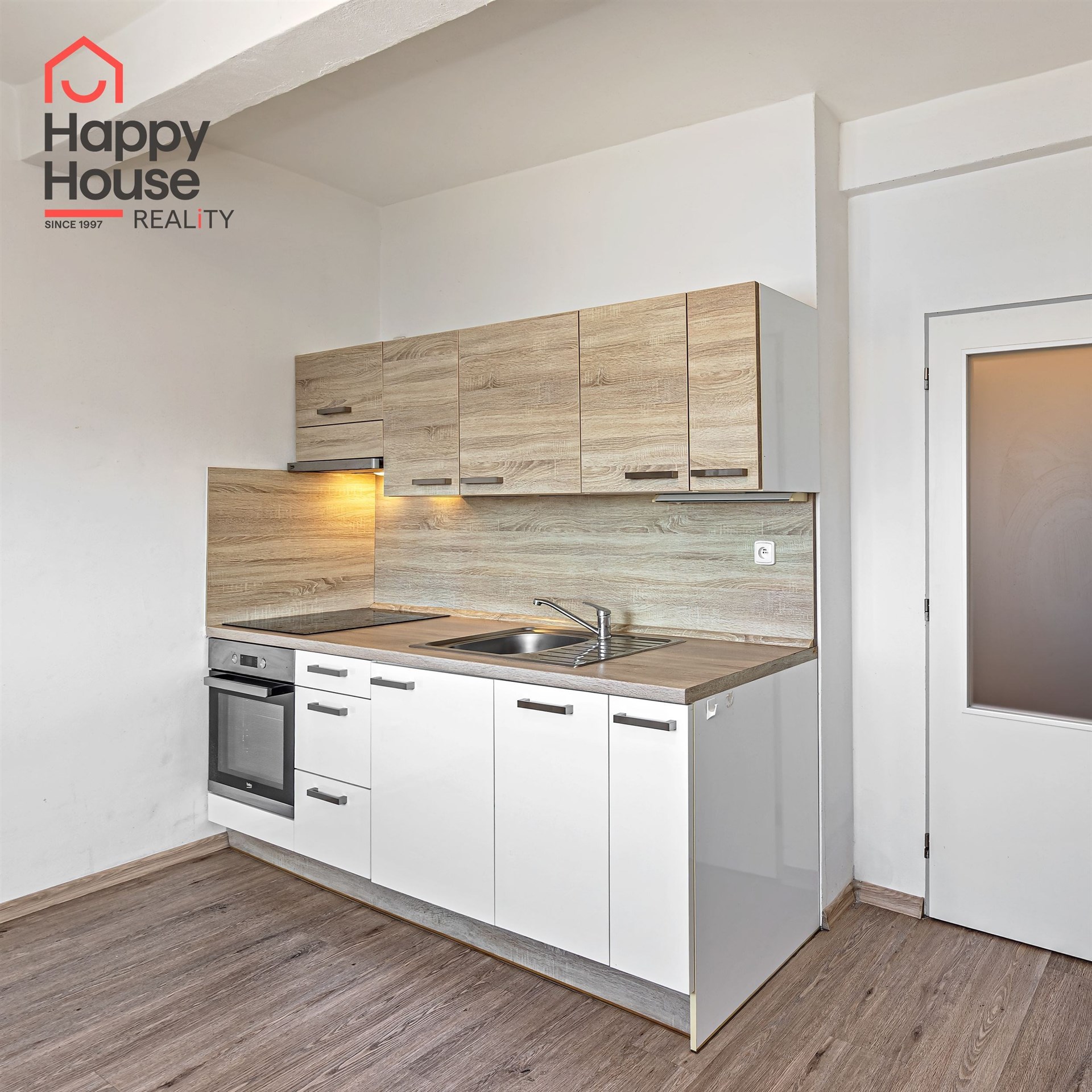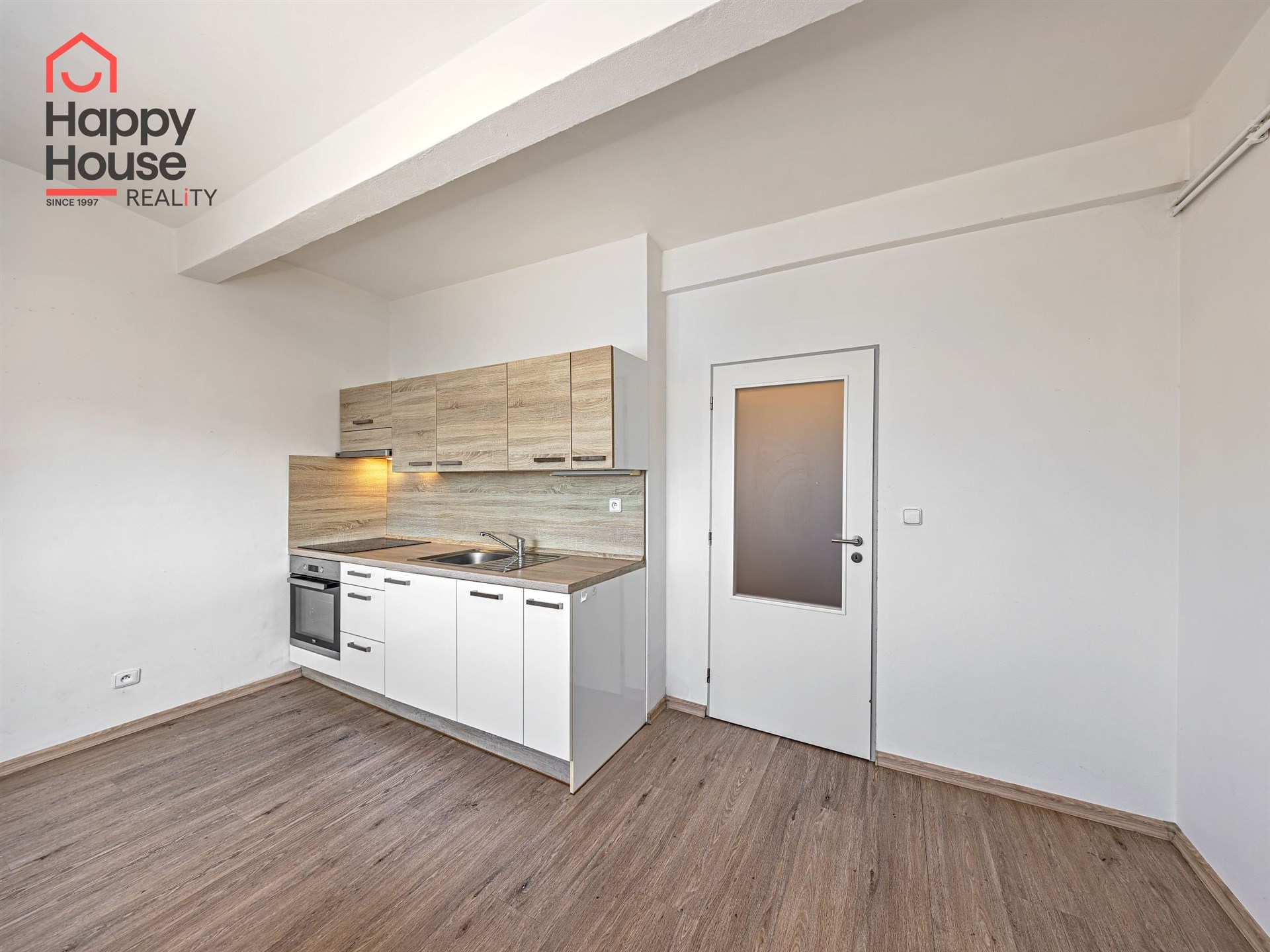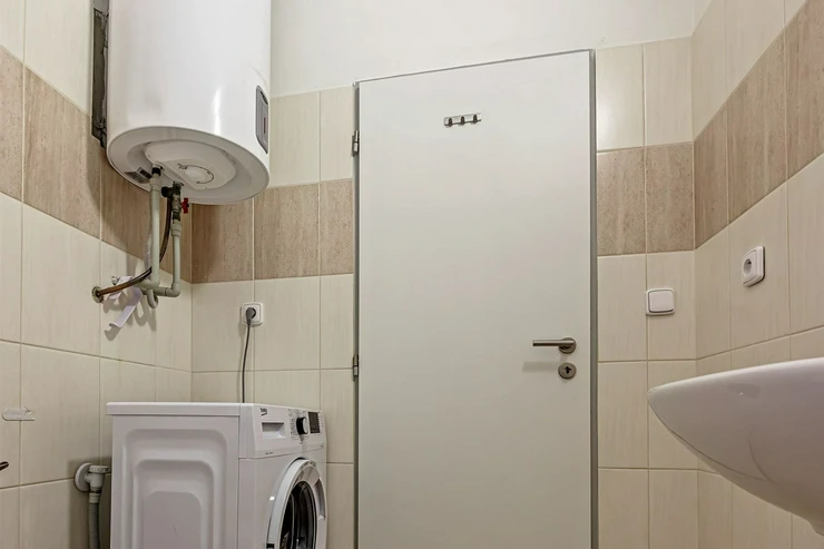 The apartment consists of a living room with a kitchenette equipped with a kitchen unit and built-in appliances including a fridge with freezer, ceramic cooktop, electric oven, extractor hood and dishwasher. The bathroom is fitted with a bathtub, toilet, washing machine and a boiler for hot water. The floors are a combination of floating laminate flooring and ceramic tiles. Heating is provided by a gas heating system with radiators.